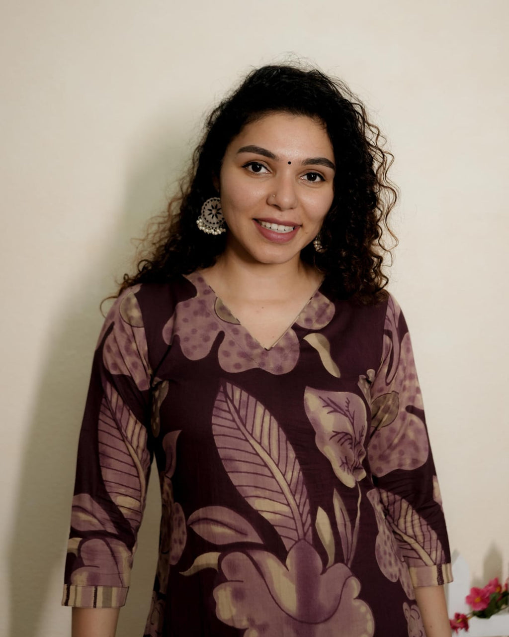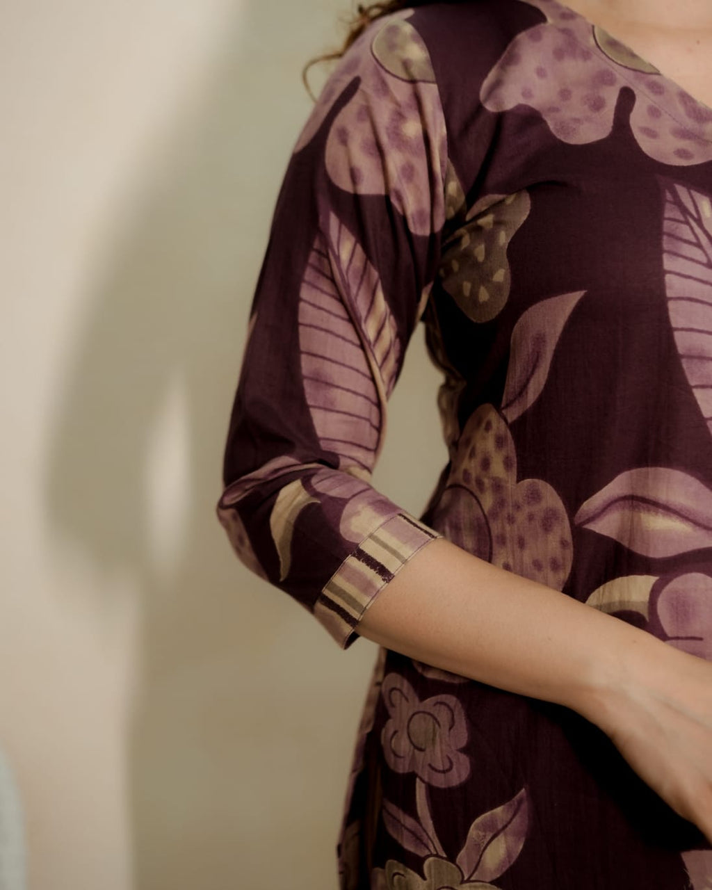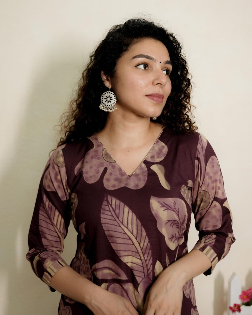 Top - Printed Cotton Slit Top with V Neck. Patch on Neck and Sleeves End.
