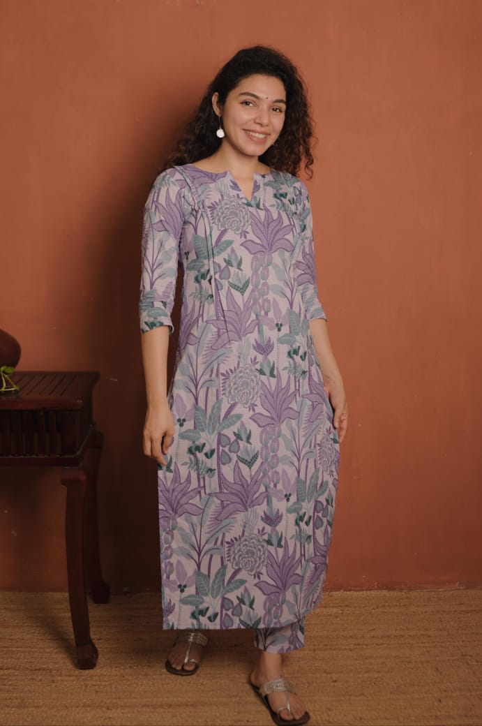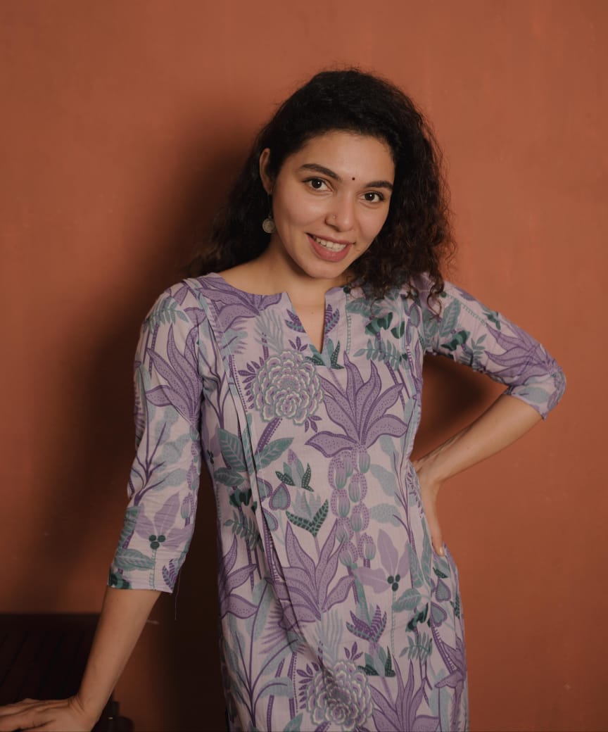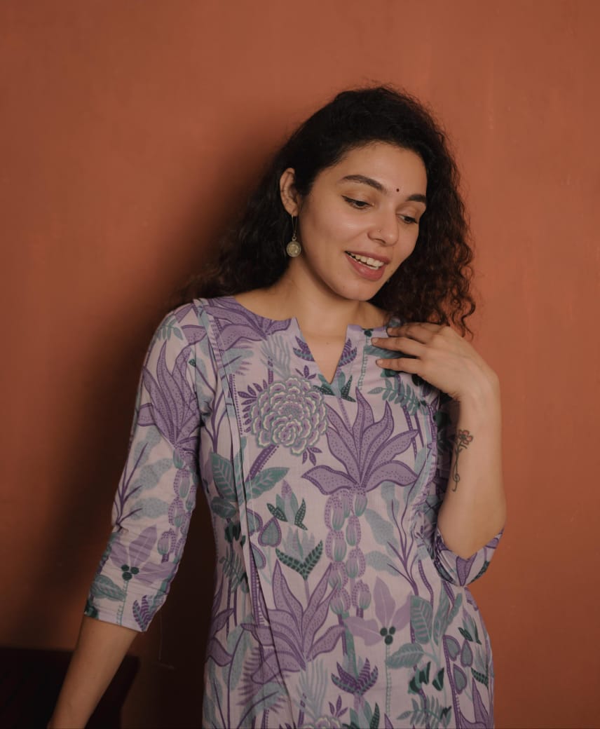 Top- Printed Cotton Slit Kurthi with Slit V Neck, Small Pleates on both sides of the Top.