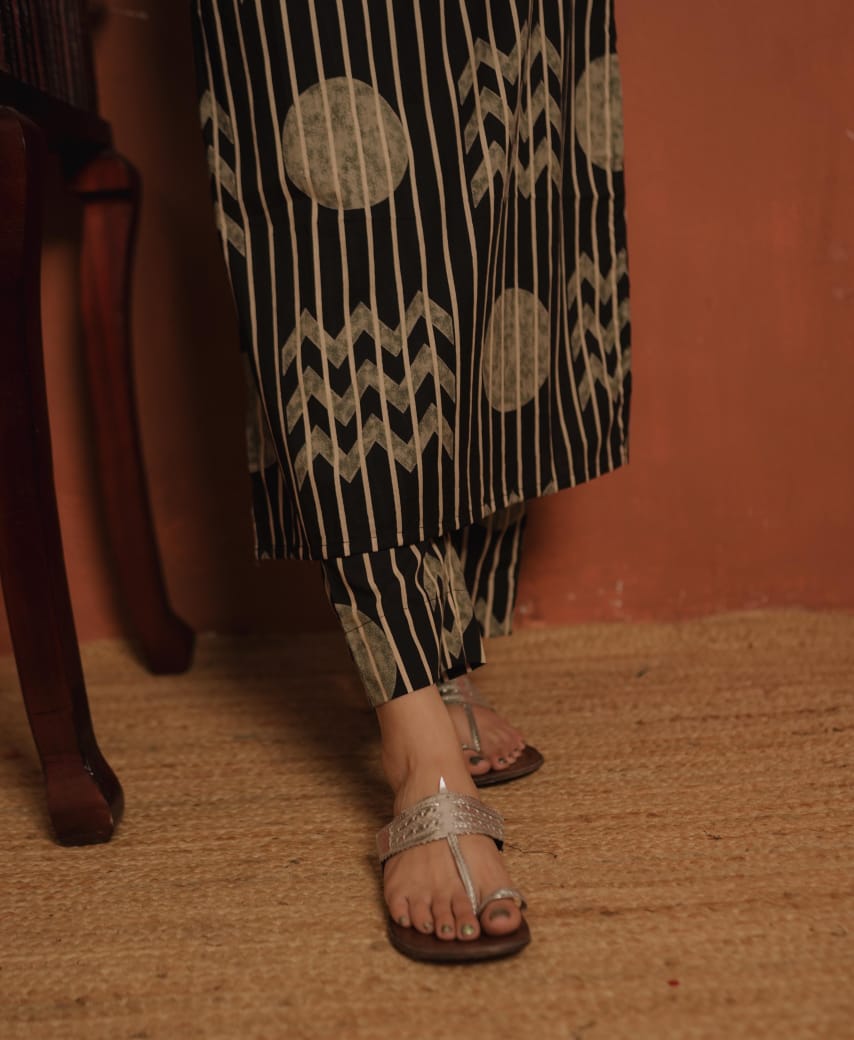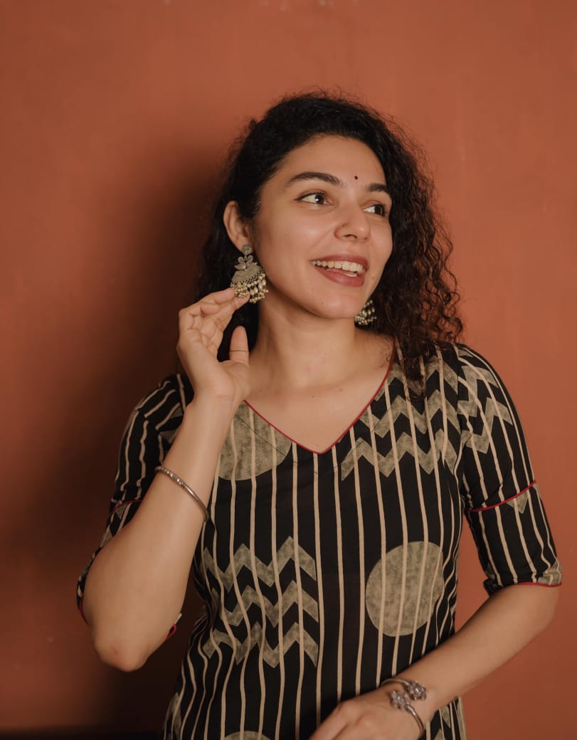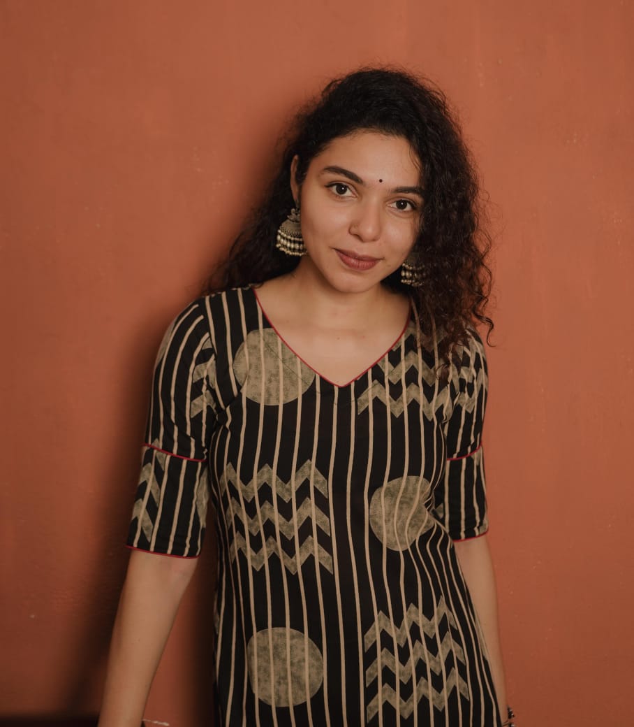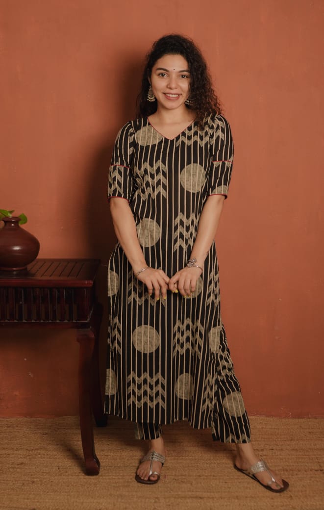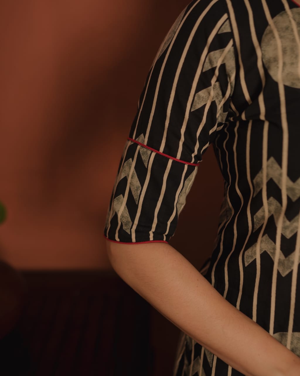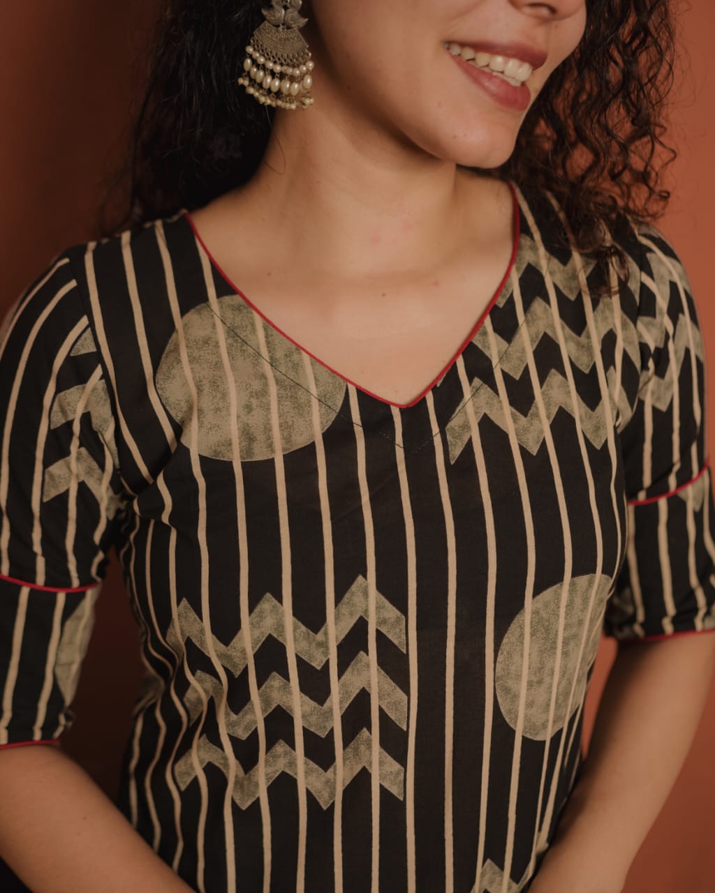 Top - Striped Printed Cotton Slit Top with V Neck. Piping on neck and Sleeves for detailing.