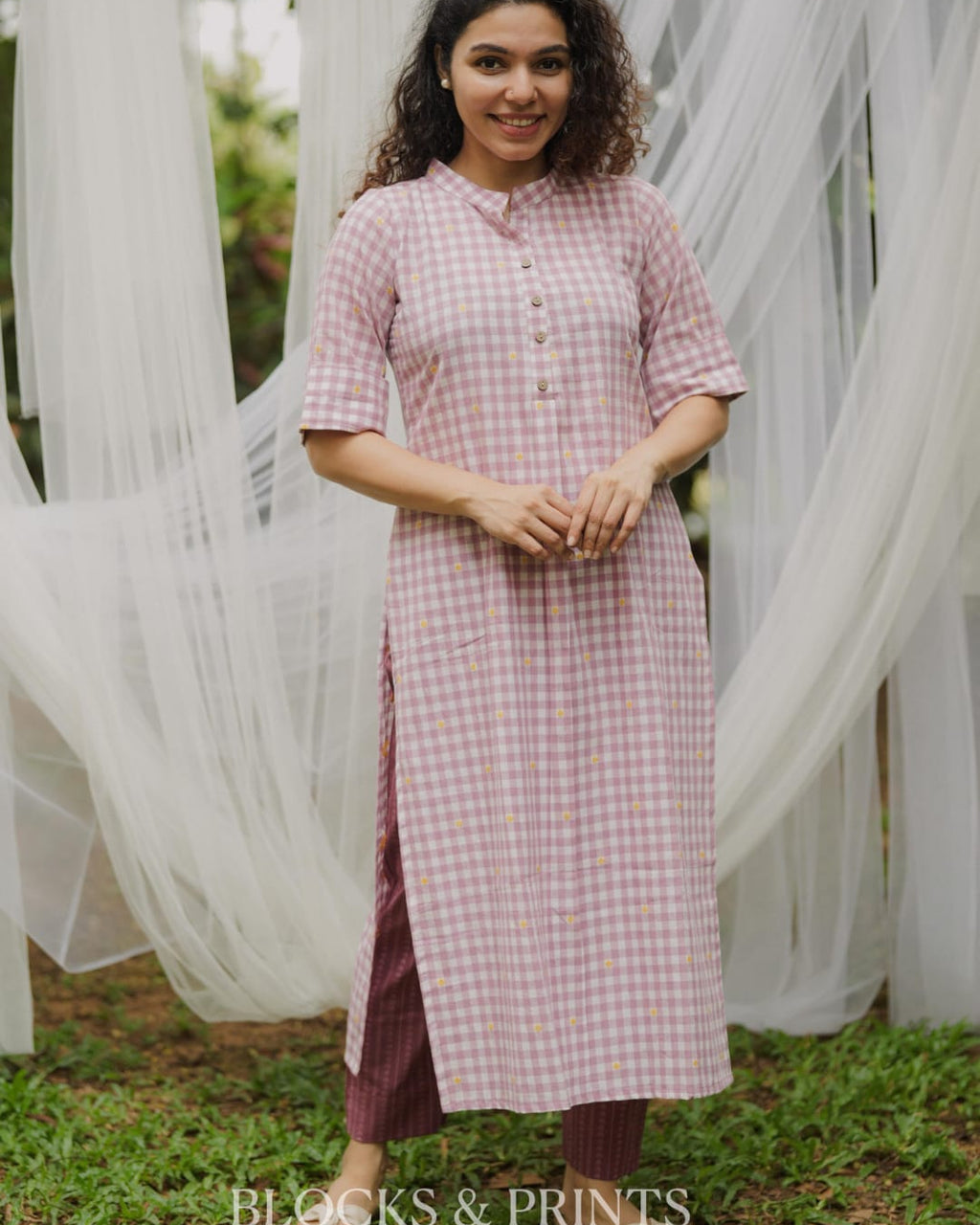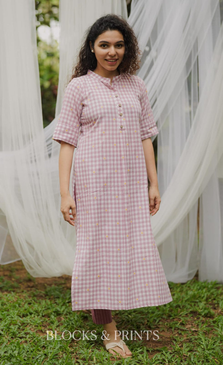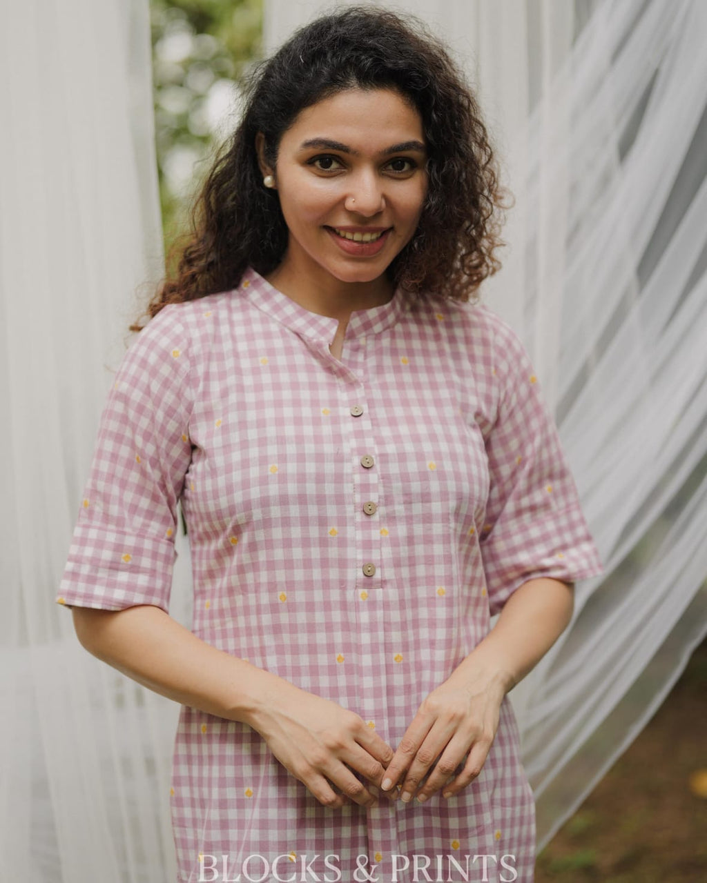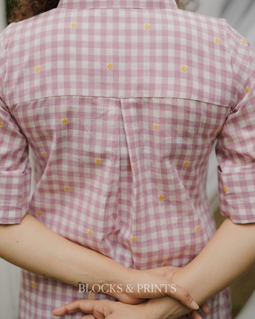 Top - Soft cotton checkered slit top with all-over woven butti. Designed with a closed collar neck and buttons on the yoke for detailing. Inverted pleat at the neck pattern and single pleat on the back.