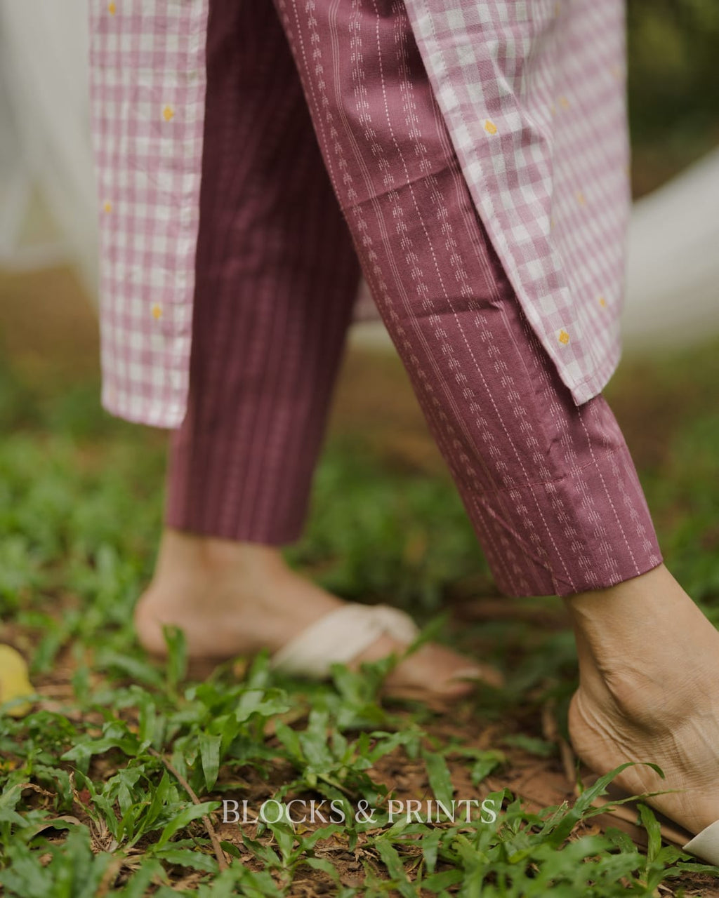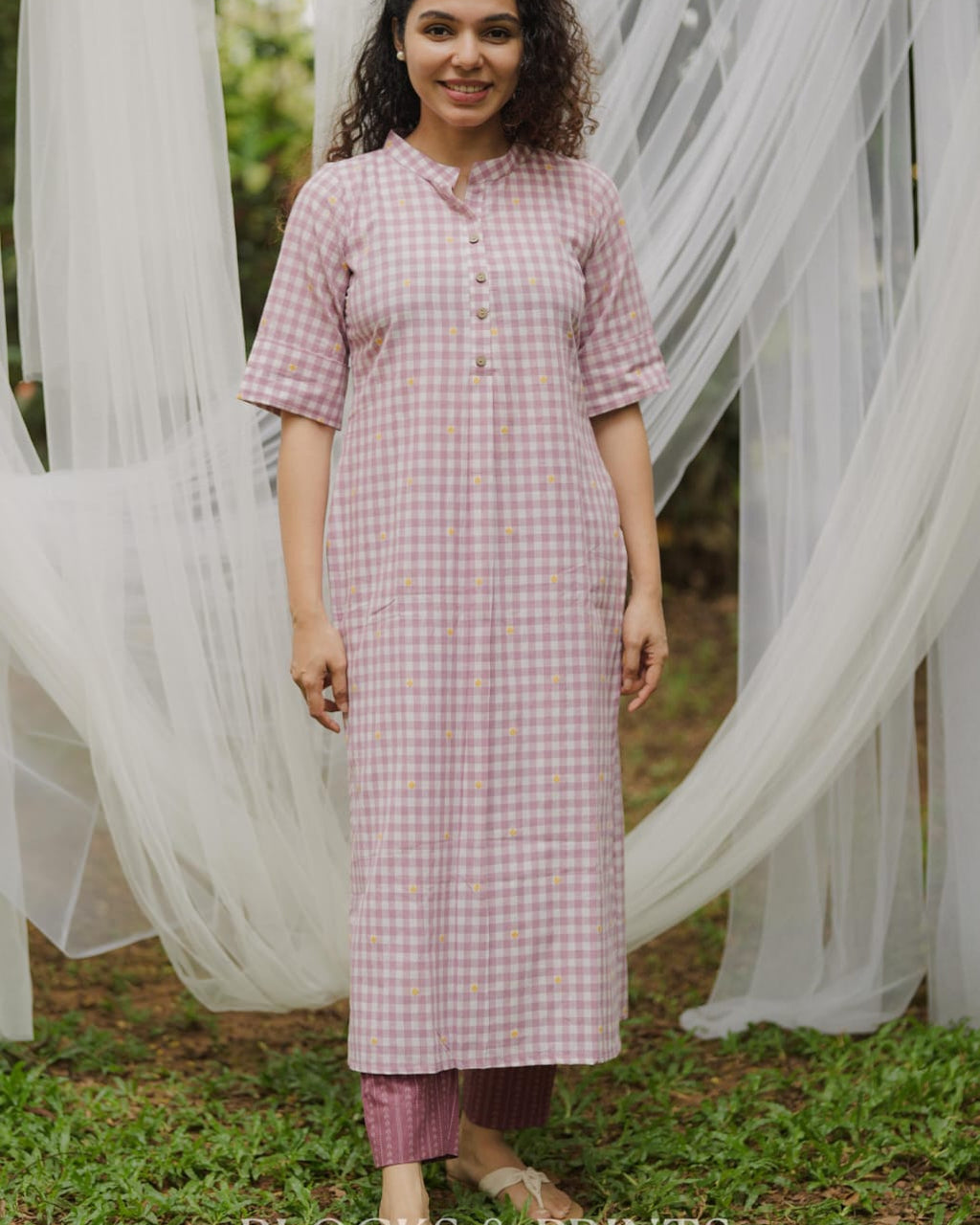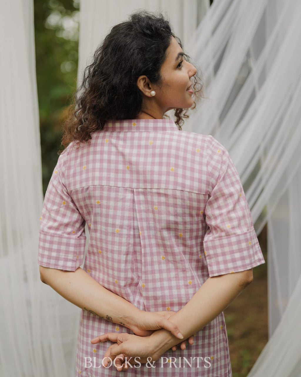 Top - Soft cotton checkered slit top with all-over woven butti. Designed with a closed collar neck and buttons on the yoke for detailing. Inverted pleat at the neck pattern and single pleat on the back.