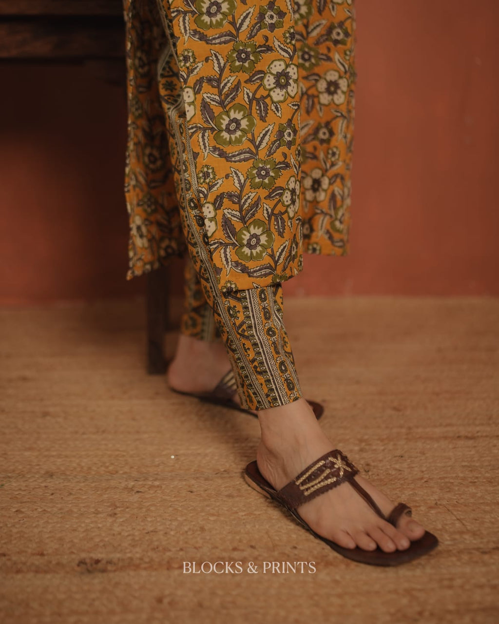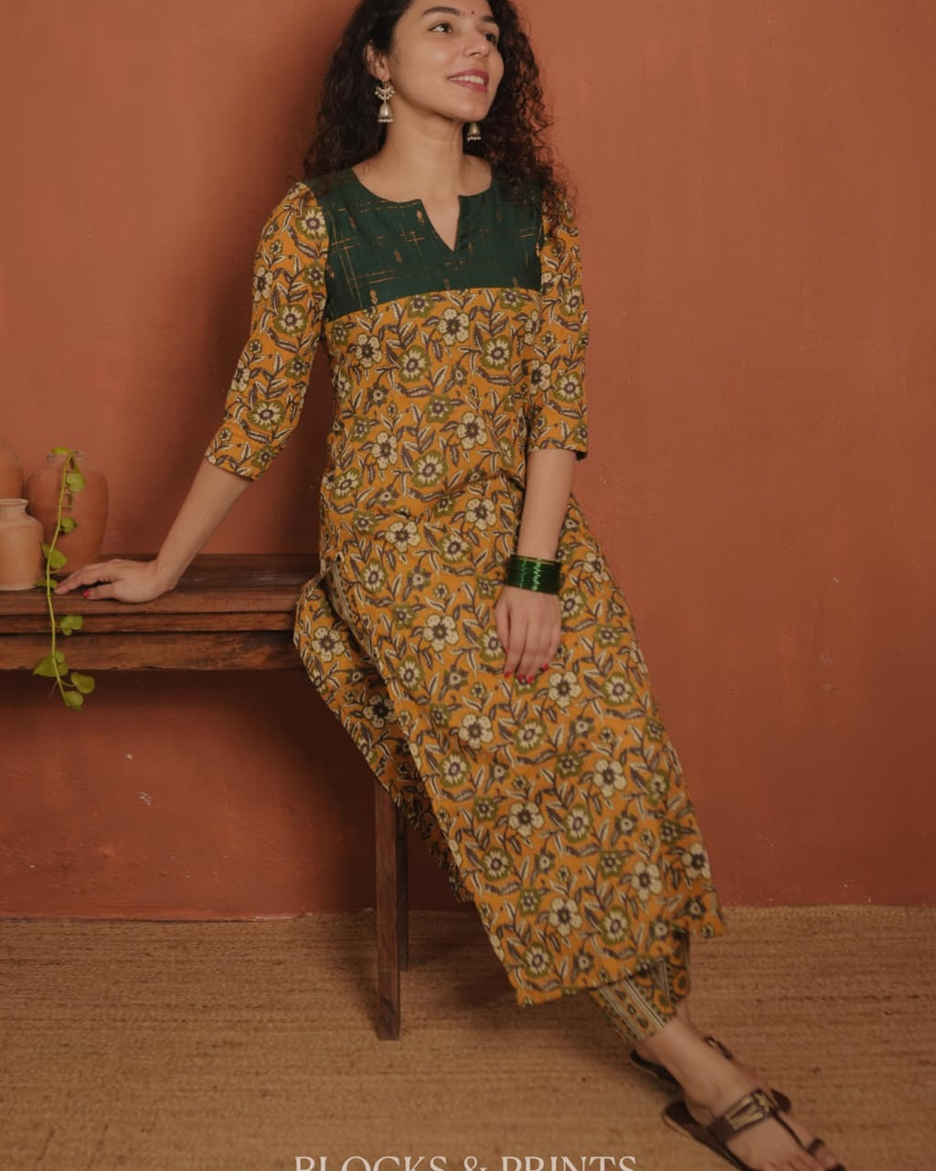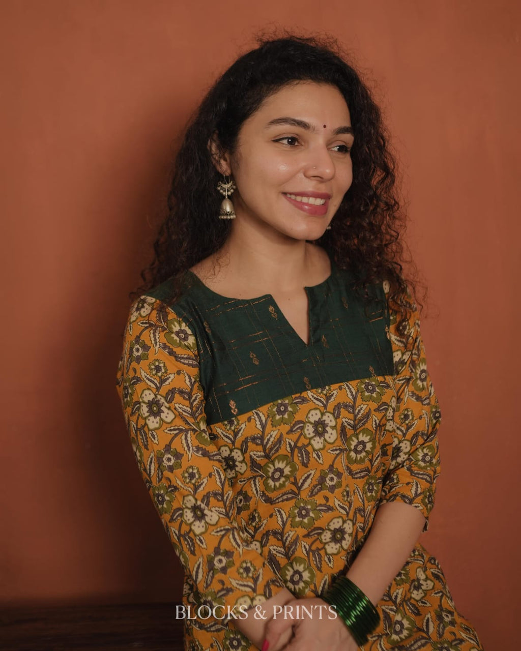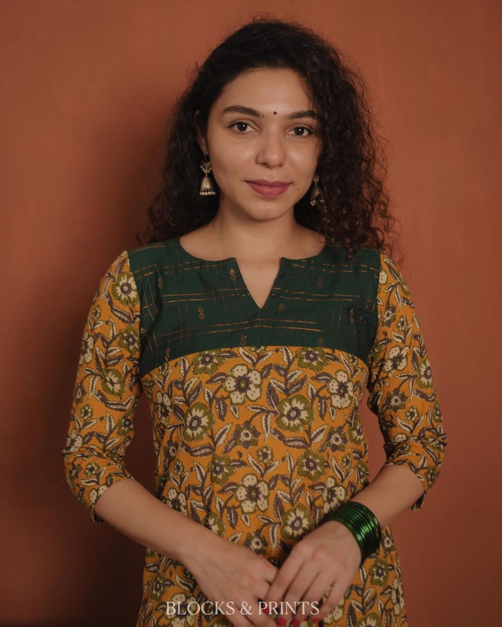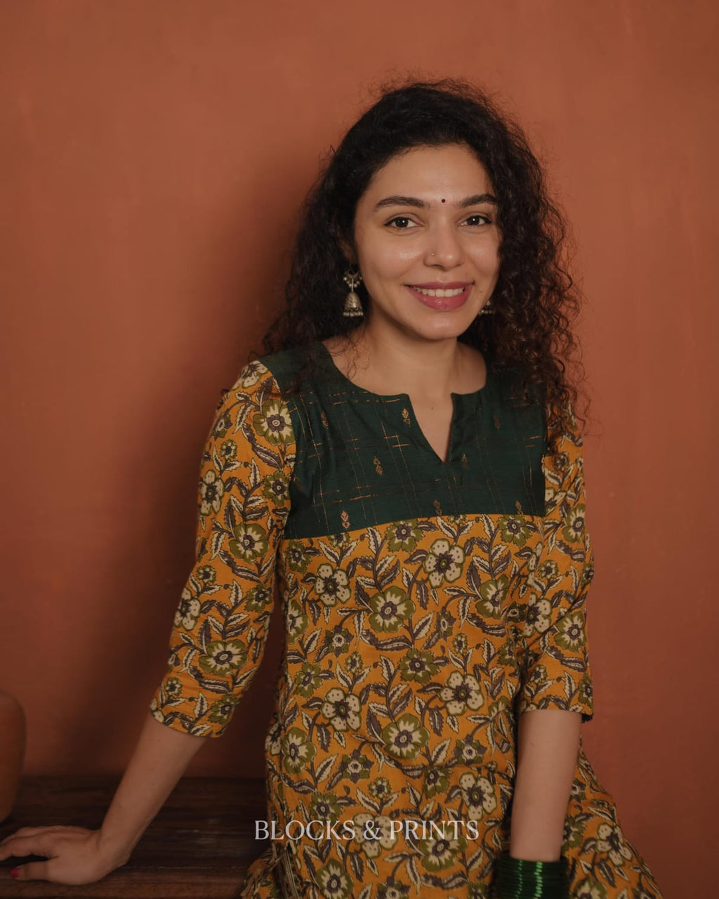 Top - Printed cotton slit kurthi with slit V neck. Cotton silk woven check fabric on yoke.