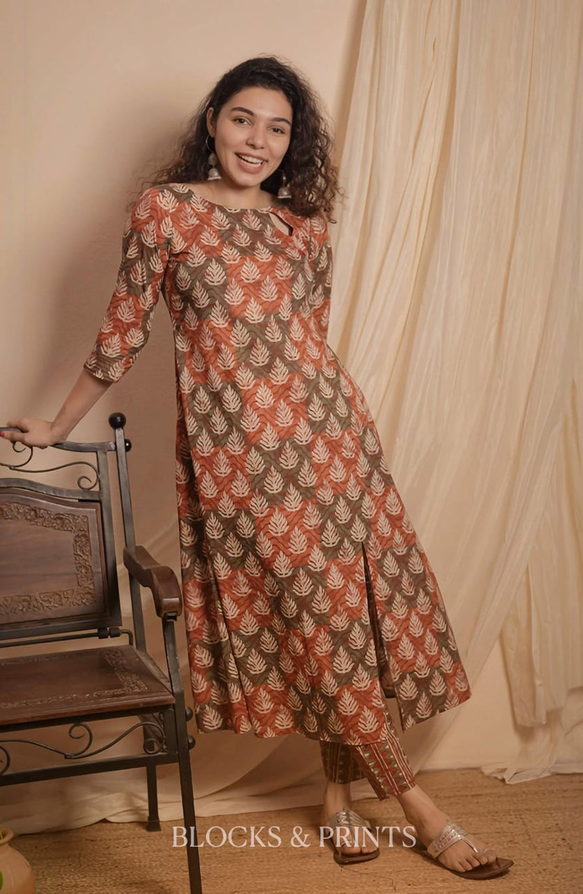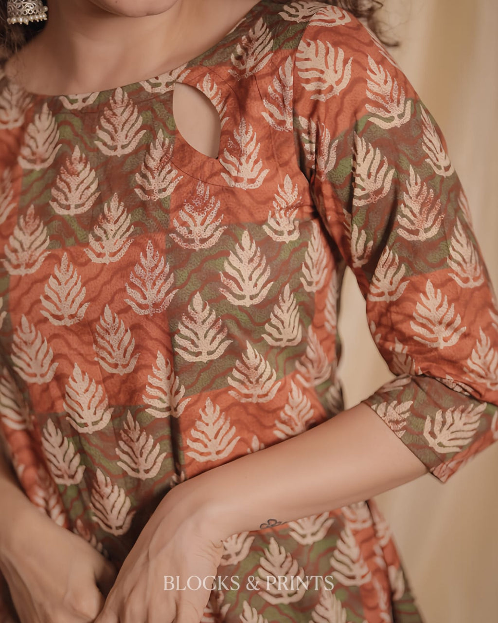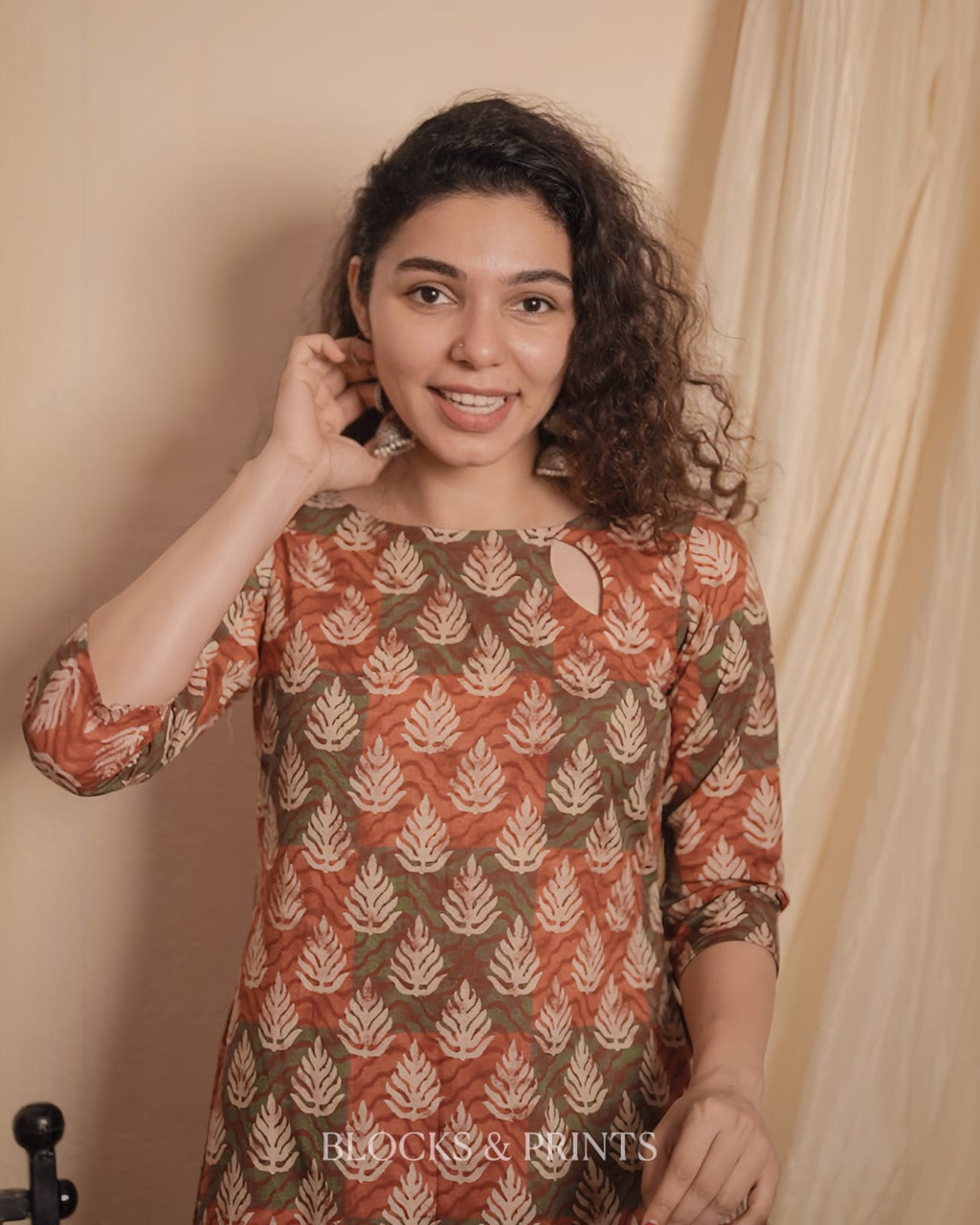 Top - Printed cotton A-line kurthi with a boat neck featuring a keyhole detail, three-quarter sleeves, an all-over leaf print, and a front slit.