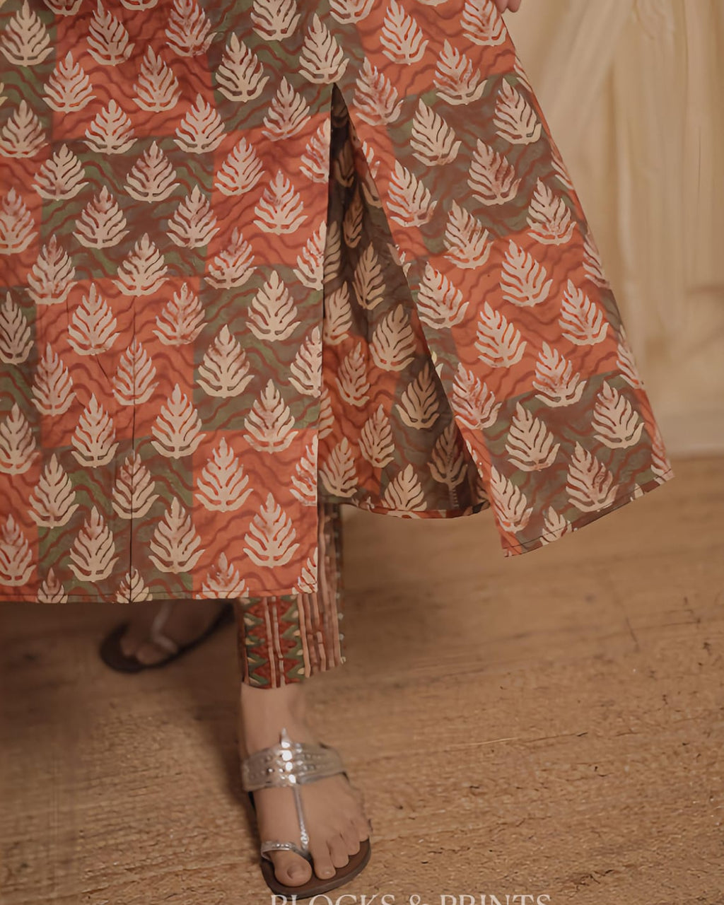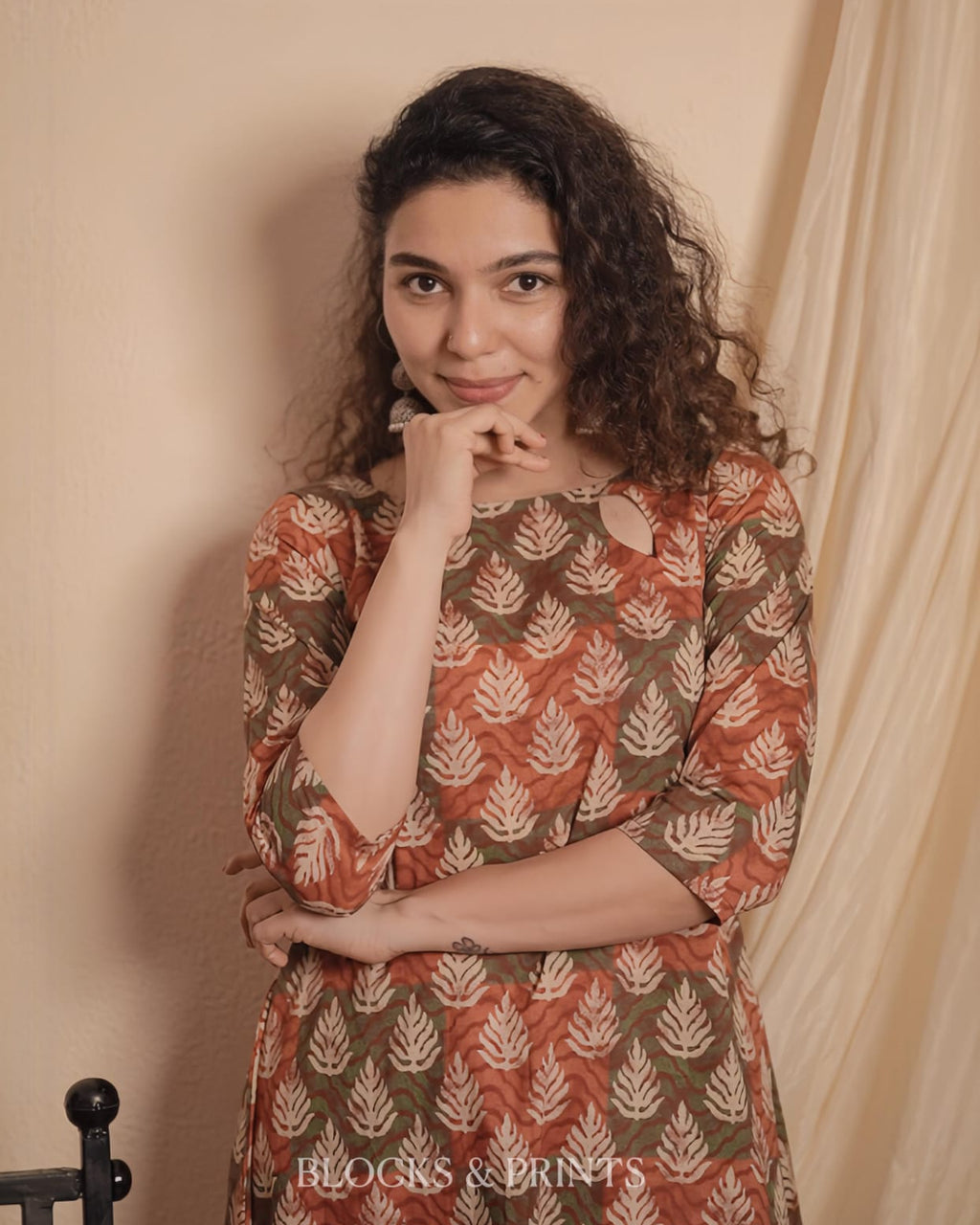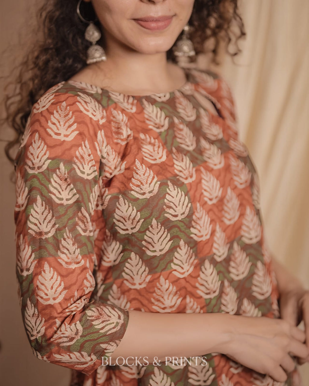Top - Printed cotton A-line kurthi with a boat neck featuring a keyhole detail, three-quarter sleeves, an all-over leaf print, and a front slit.