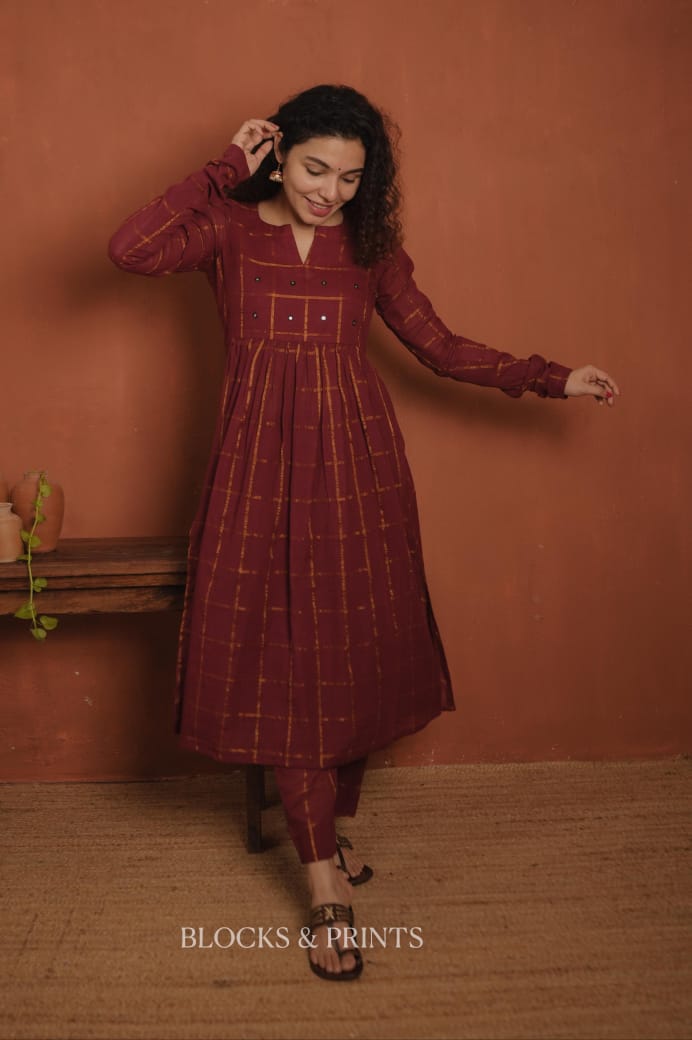 Top :- Sungudi Cotton Check Slit Kurthi with Slit V neck. Embroidery mirror work on yoke, Gathers on yoke. (Stitched with Half Lining.)