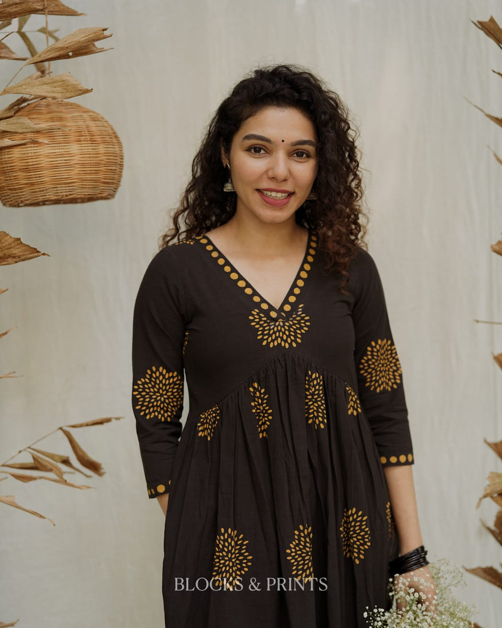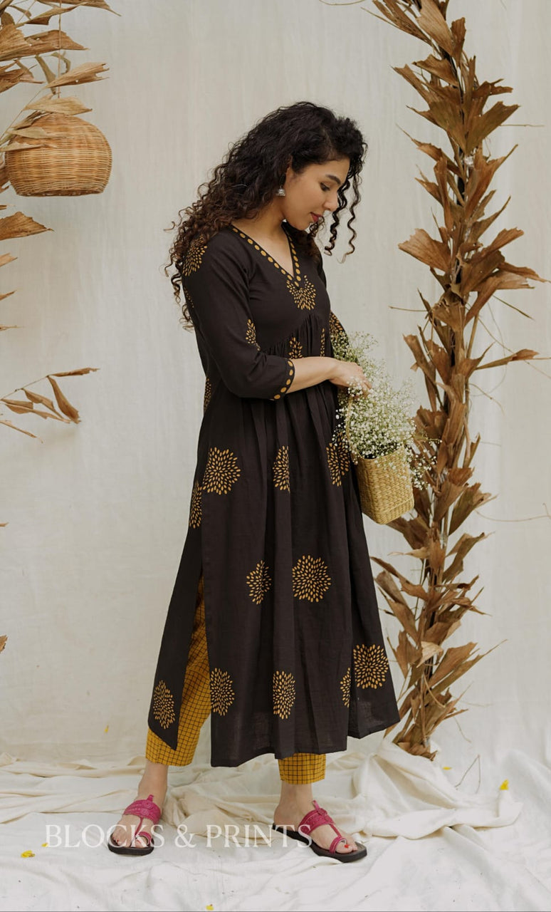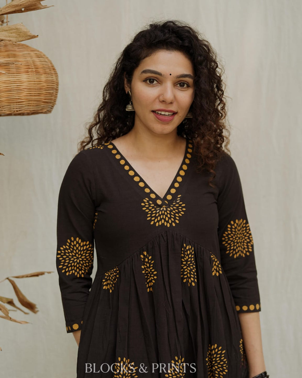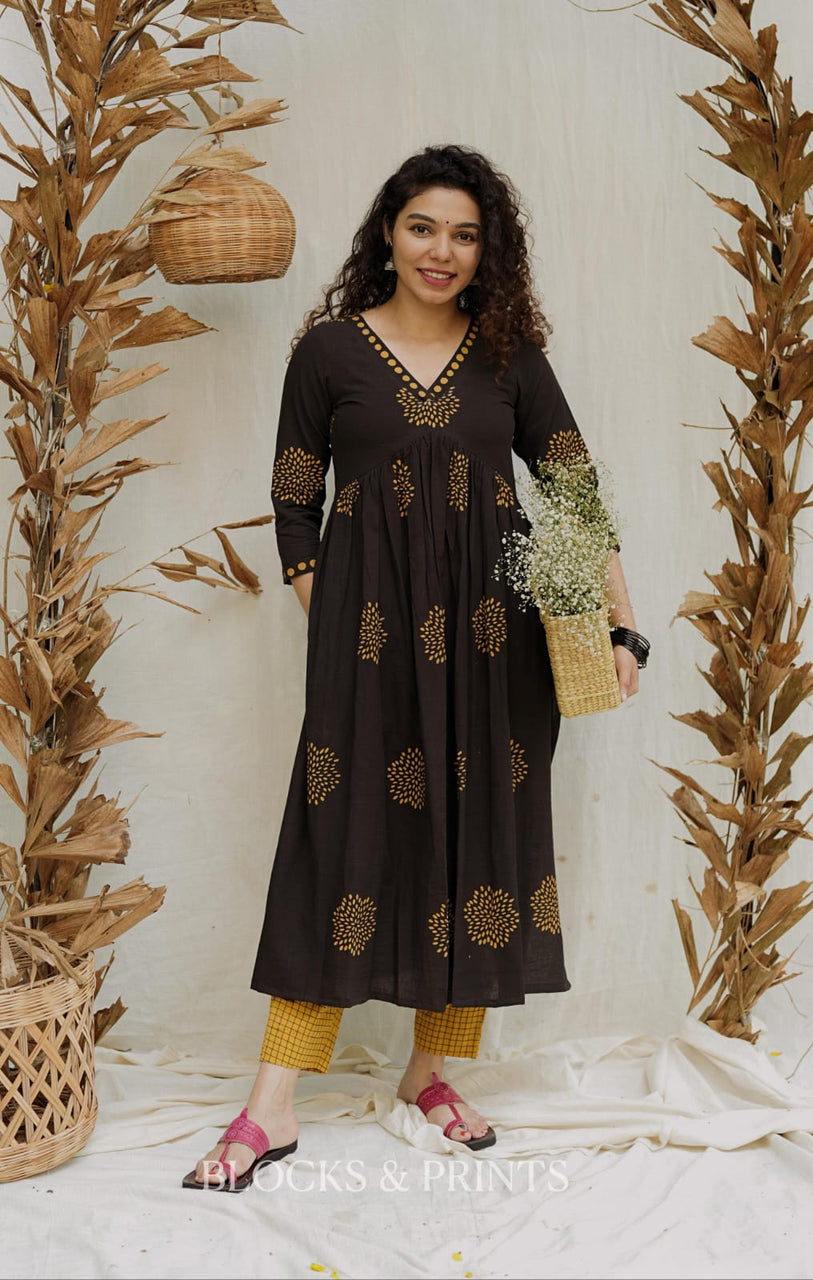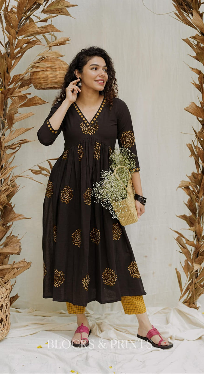 Top - Printed Cotton Slitted Alia cut kurthi with V neck and one side pocket.