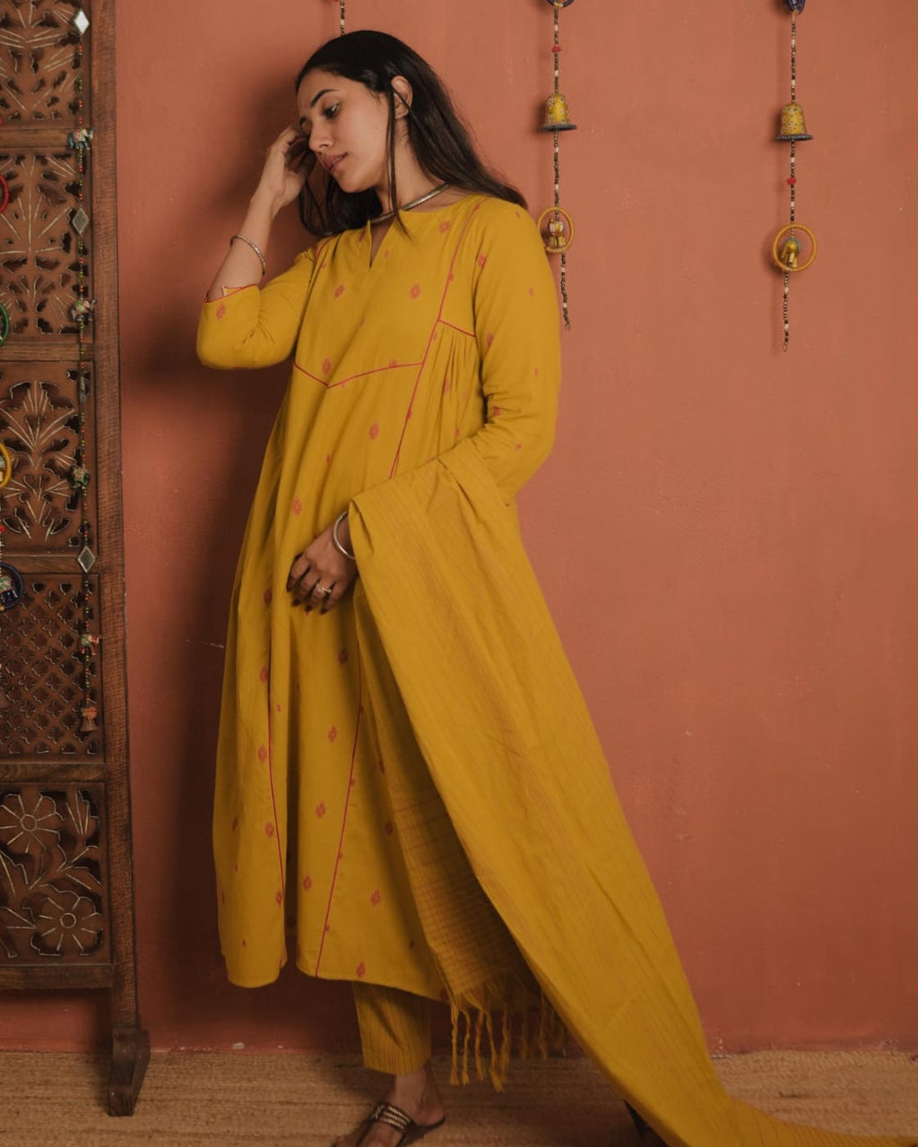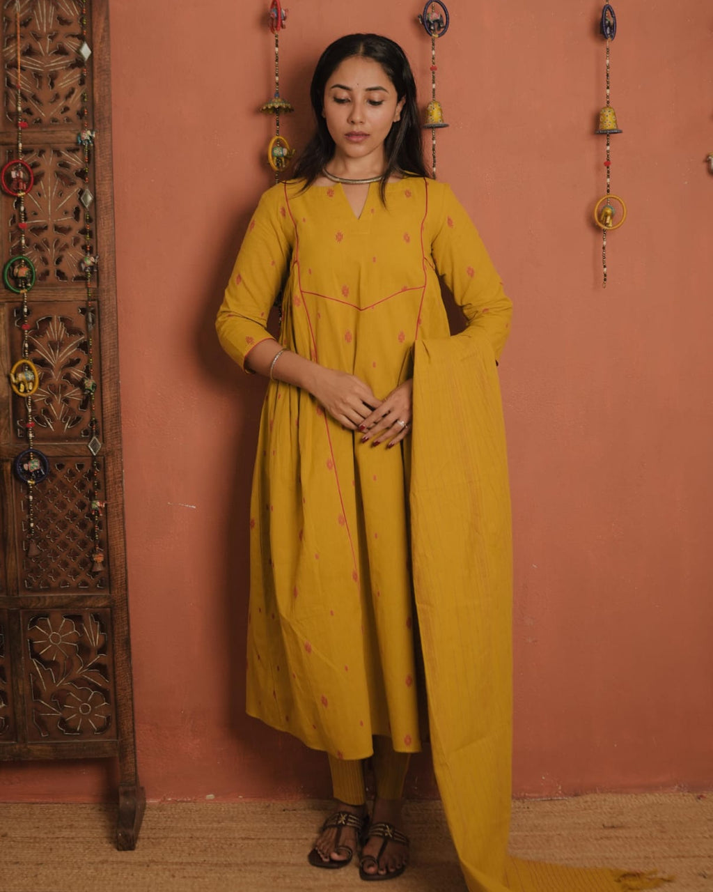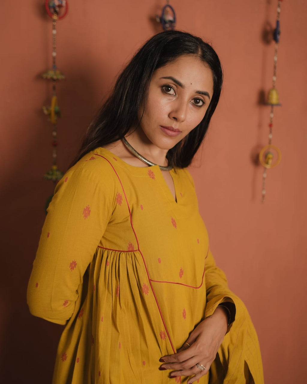 Top - Handloom Cotton A-Line with Slit V neck, Contrast Piping on the Yoke Sides and Sleeves End. Gathers on Each side of the Yoke.
