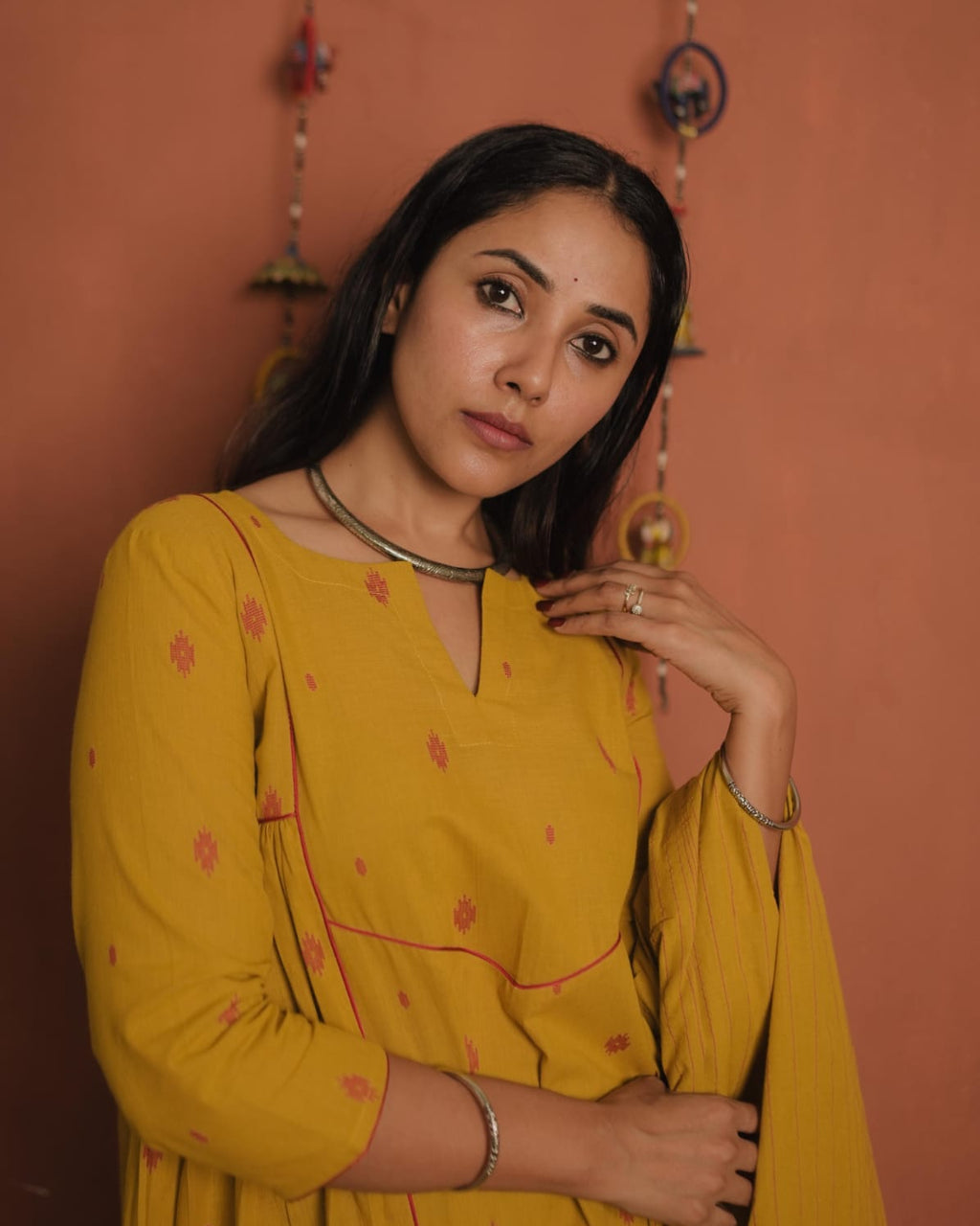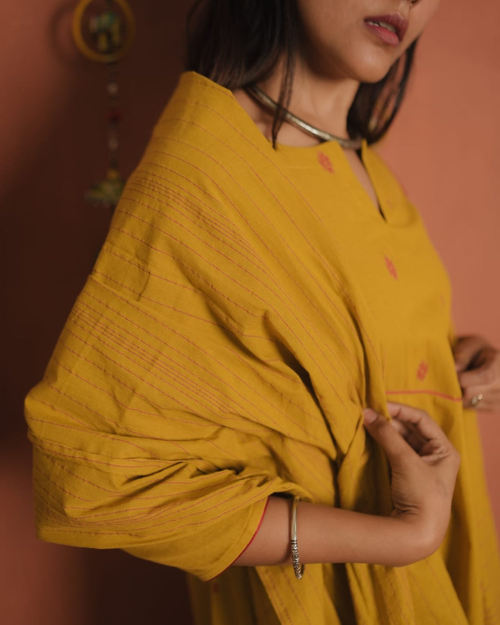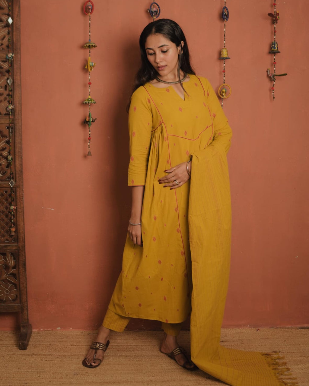 Top - Handloom Cotton A-Line with Slit V neck, Contrast Piping on the Yoke Sides and Sleeves End. Gathers on Each side of the Yoke.