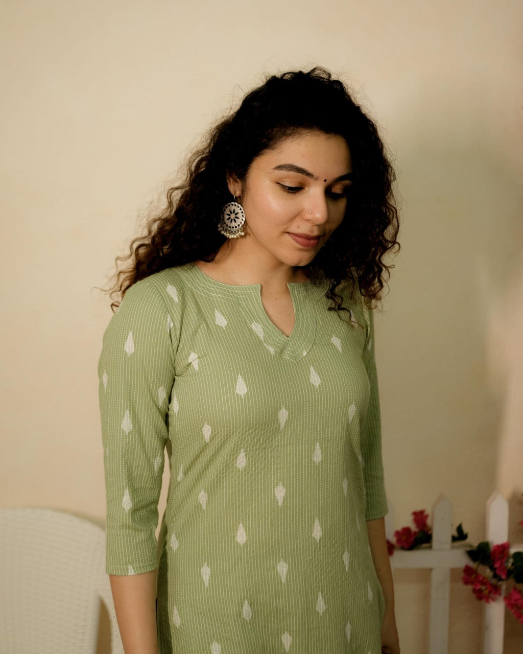 Top - Printed Kantha Cotton slit top with Oval Slit on Neck. Running Stitch on Neck.