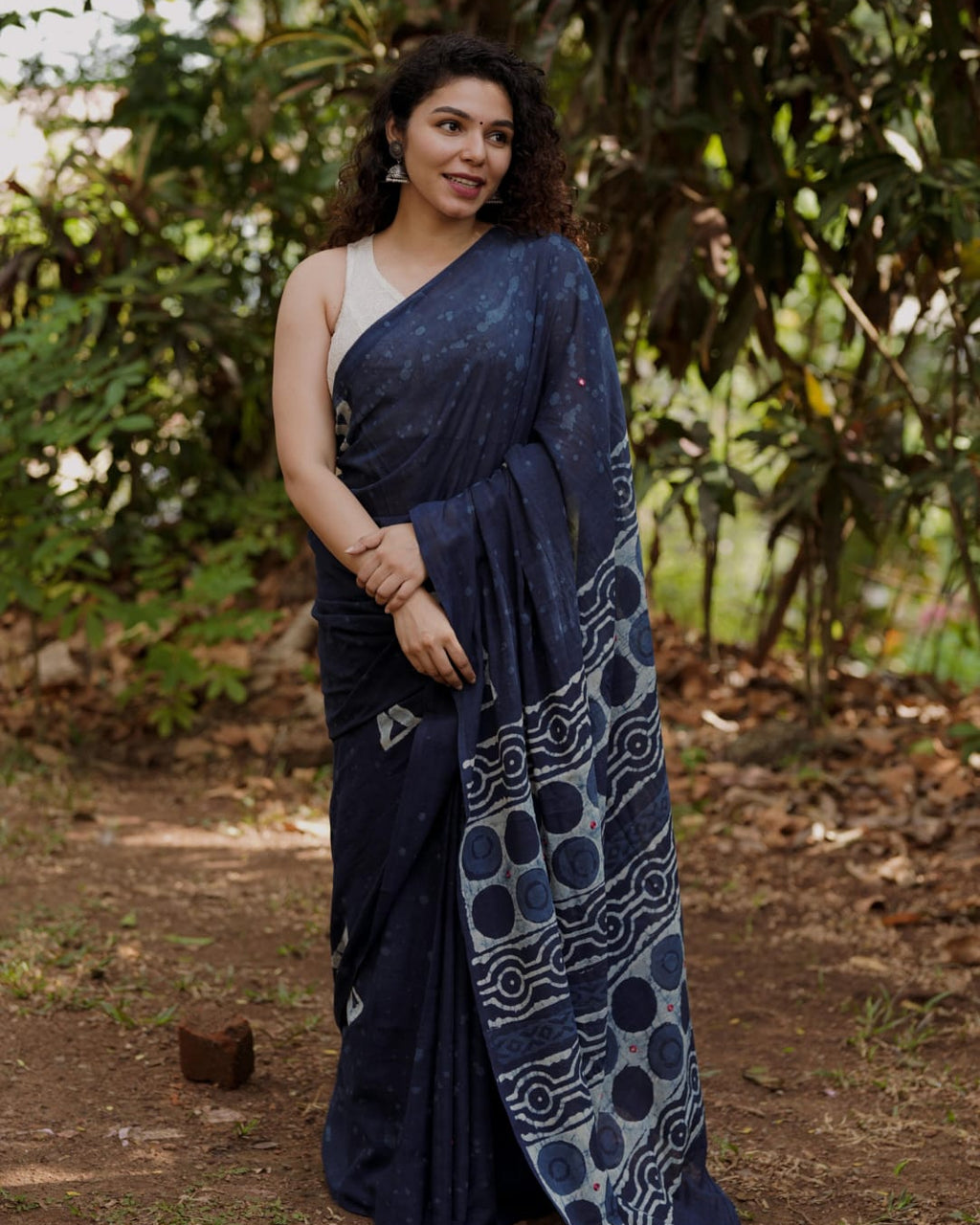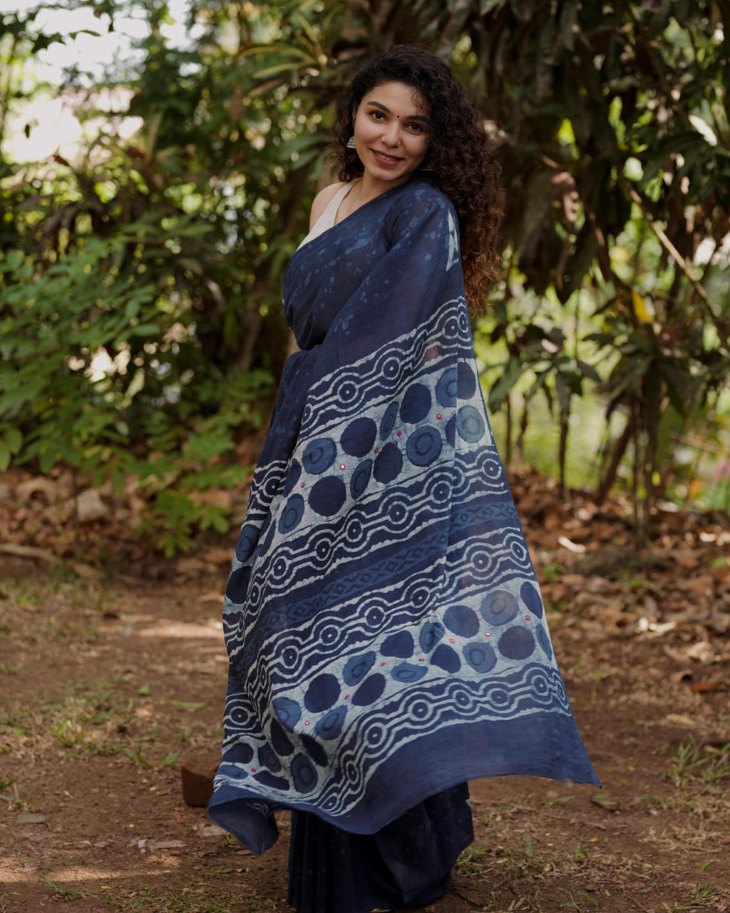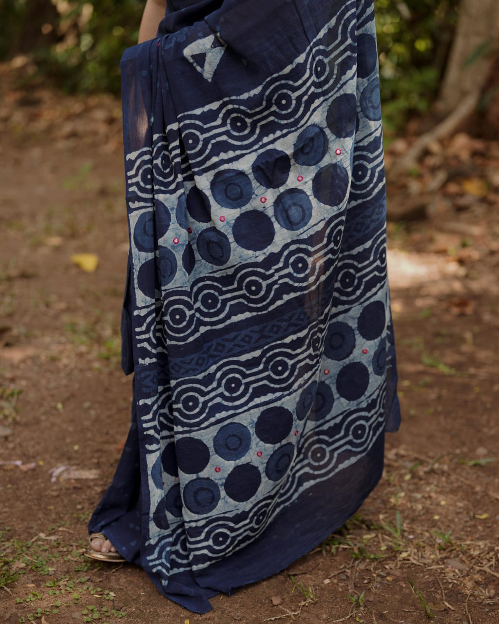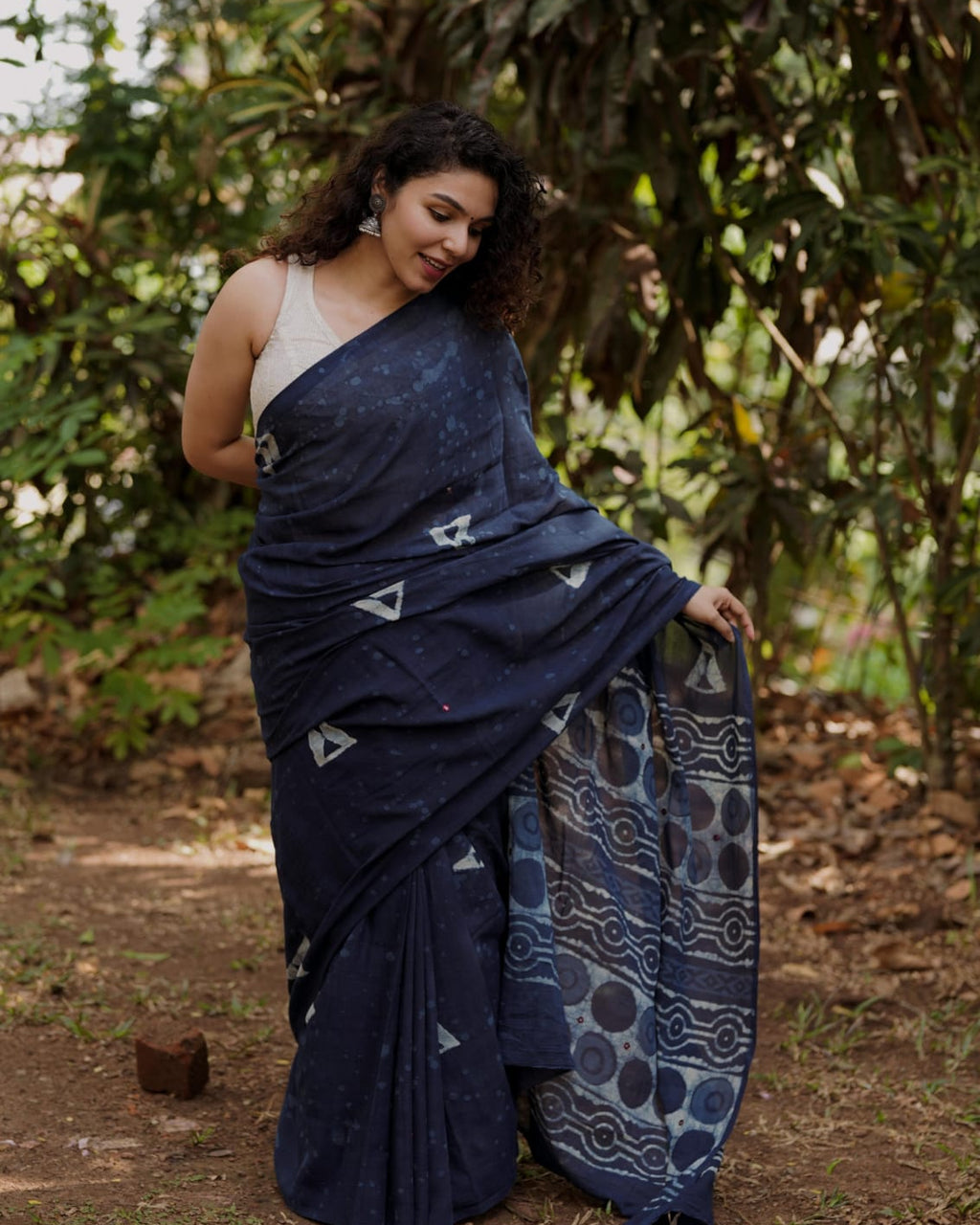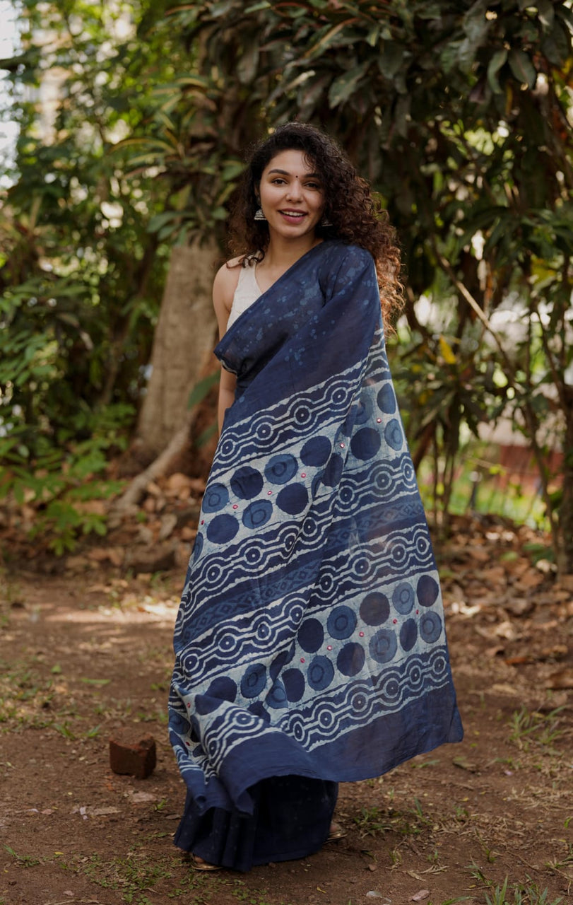 Designer natural indigo print saree with Mirror Work on Pallu,
