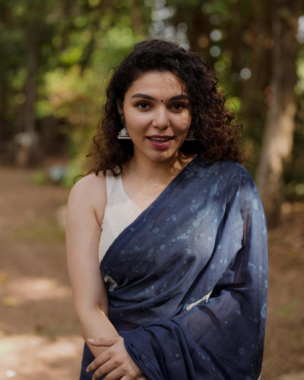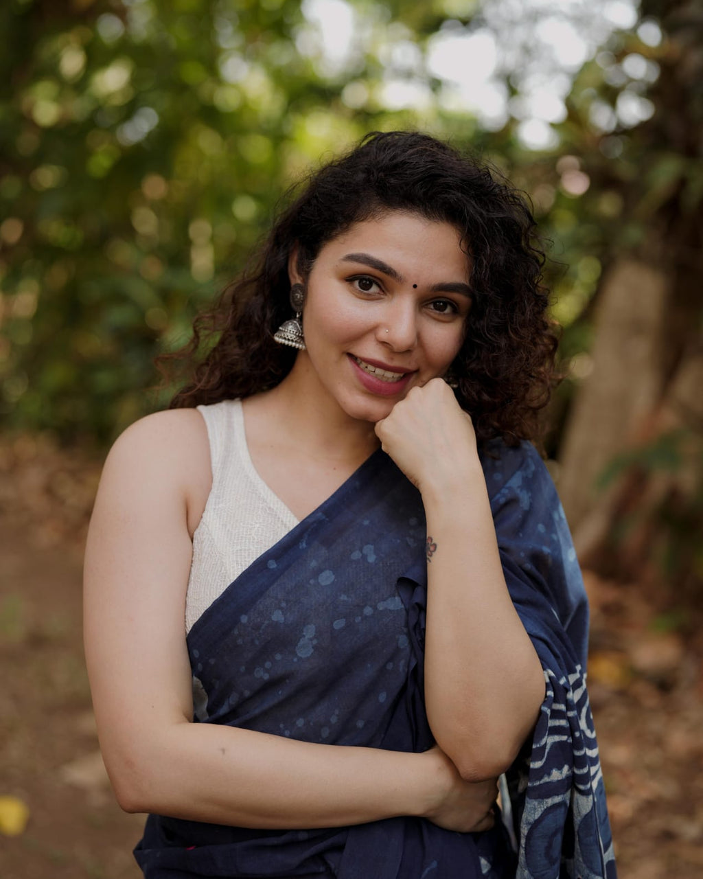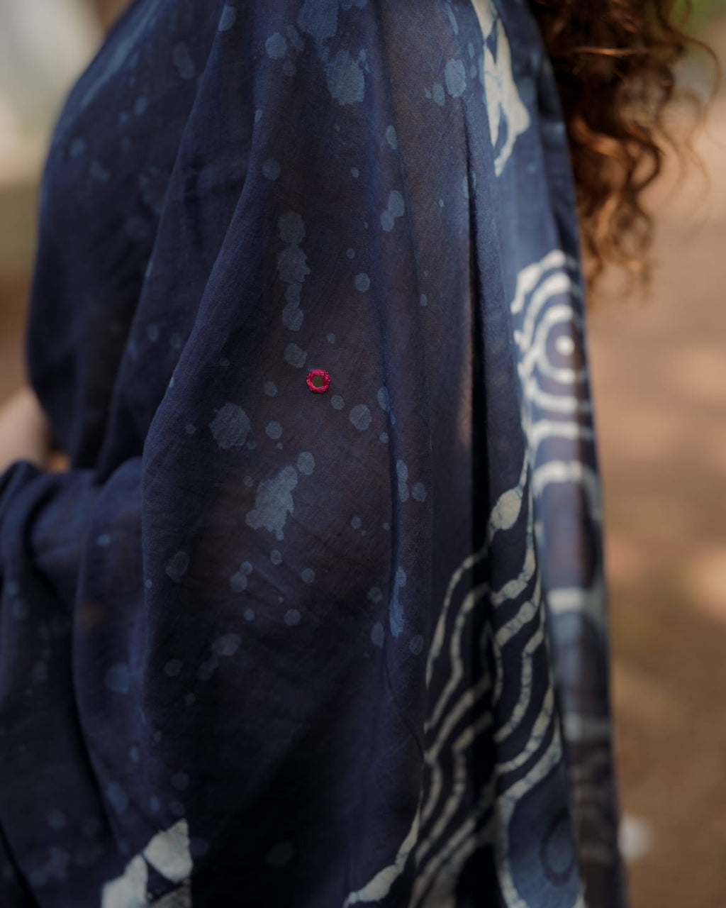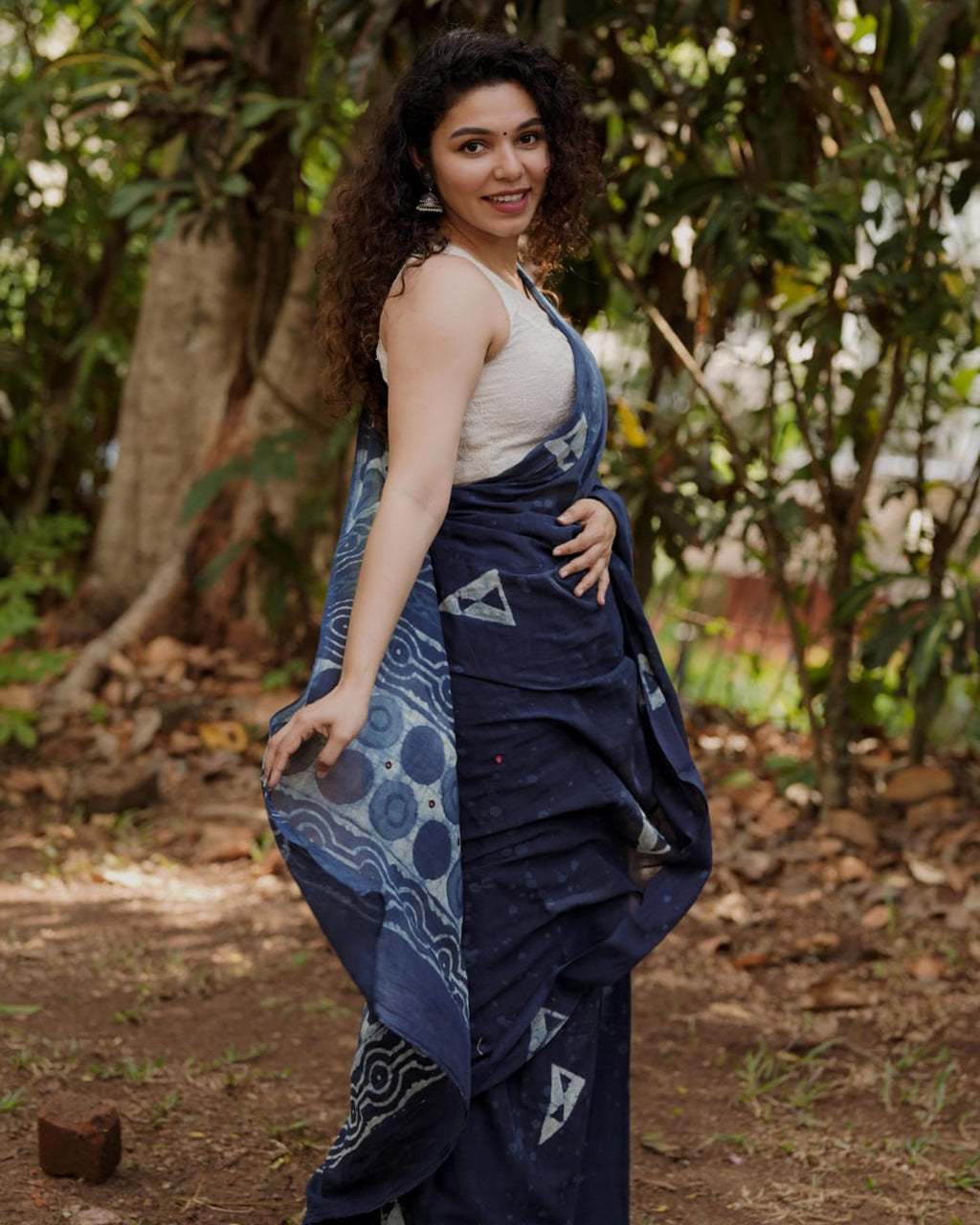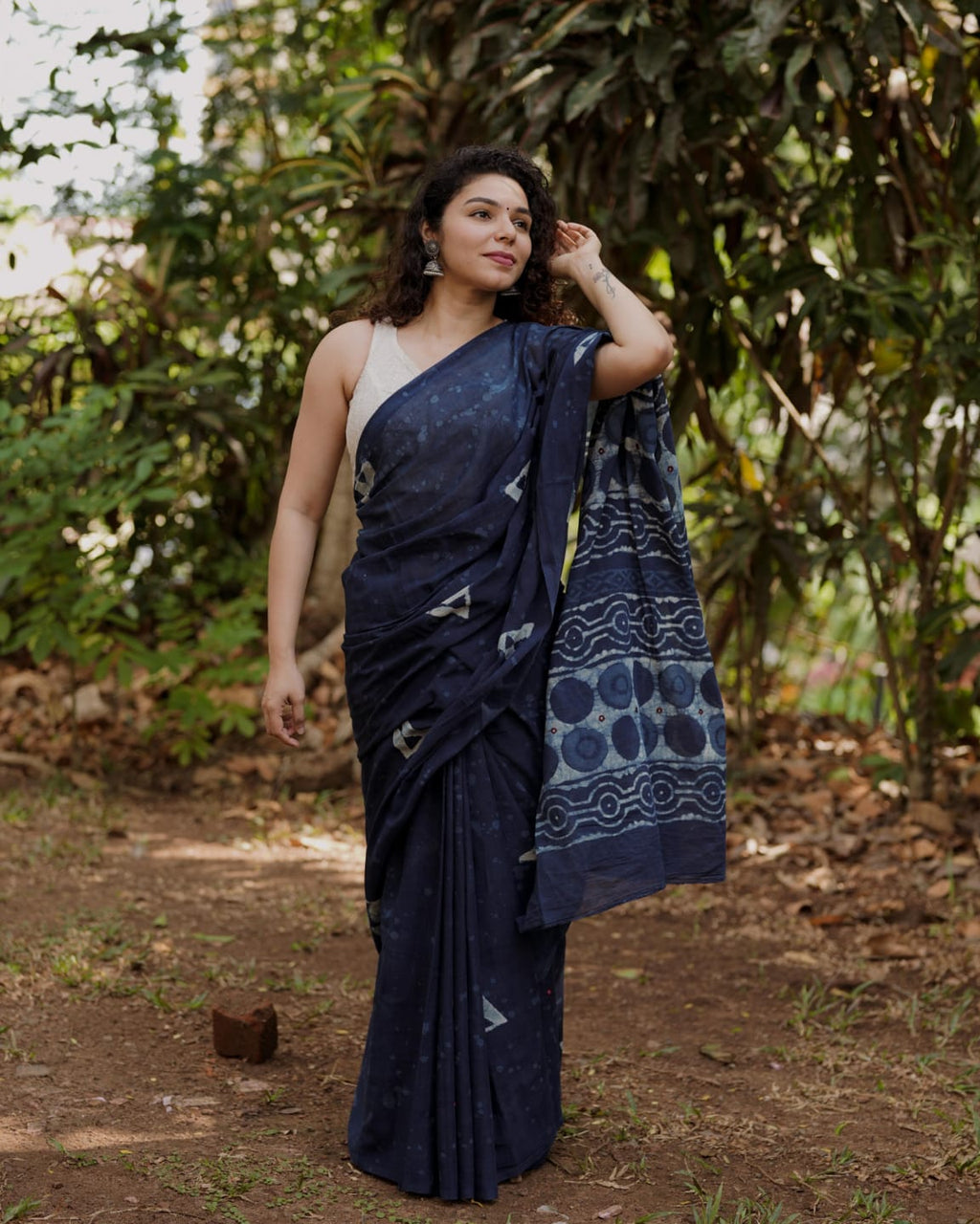 Designer natural indigo print saree with Mirror Work on Pallu,