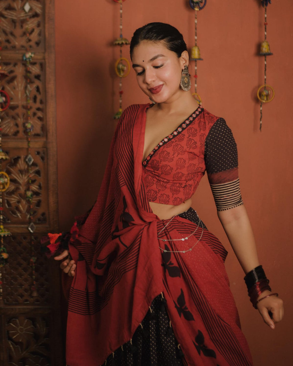 Blouse -  Natural Ajrakh Cotton Deep V Neck with Heavy Hand Embroidery Mirror work on Neck. Back open Pattern. Black Print in Red Color. (Stitched with Lining.)