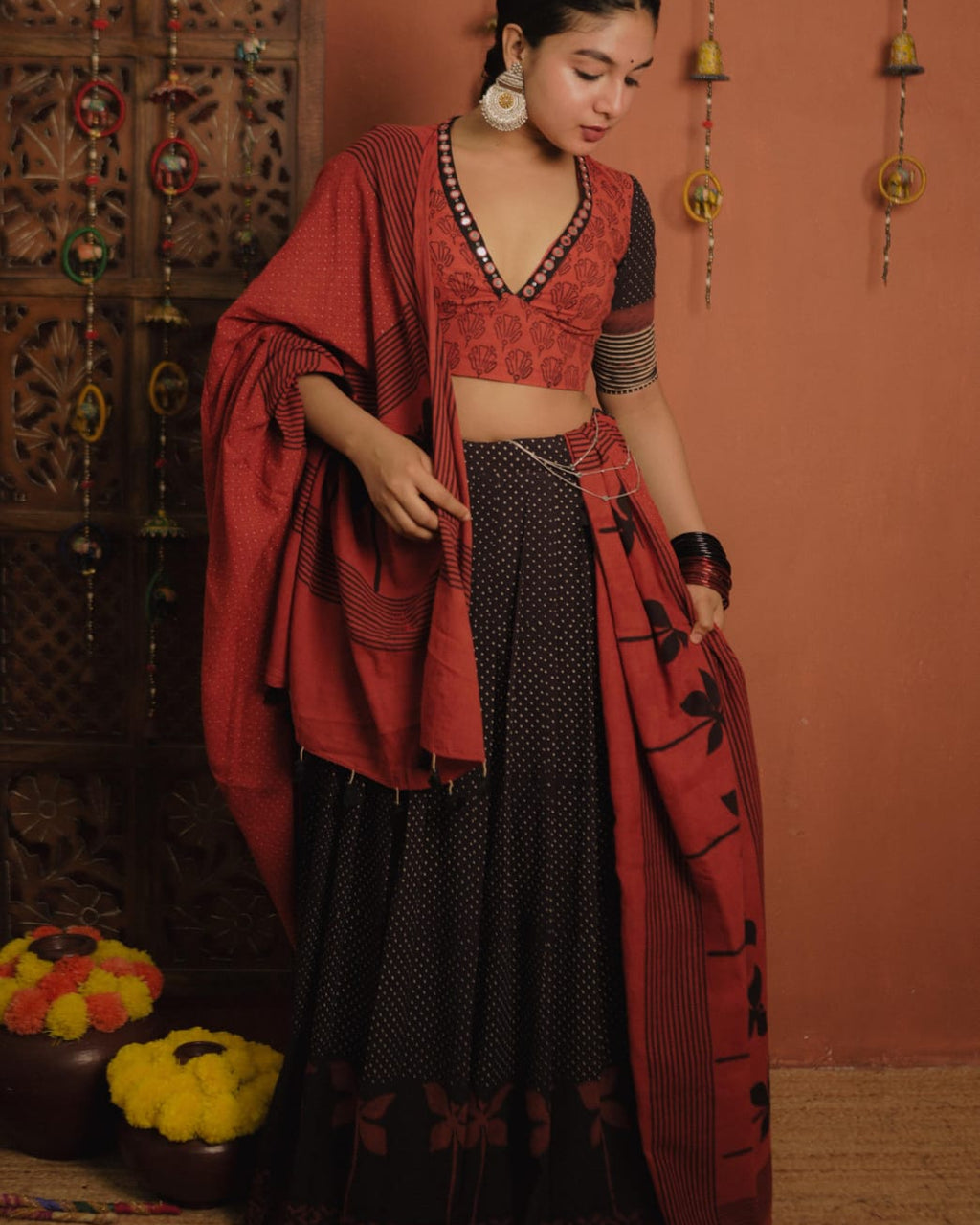 Natural Ajrakh Cotton Dawani Set ( Blouse , Skirt & Dawani)