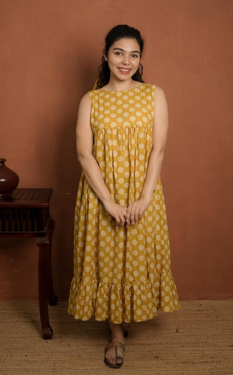Printed Cotton Sleeveless Dress with Closed Neck. Gathers on the Yoke and the Motif.