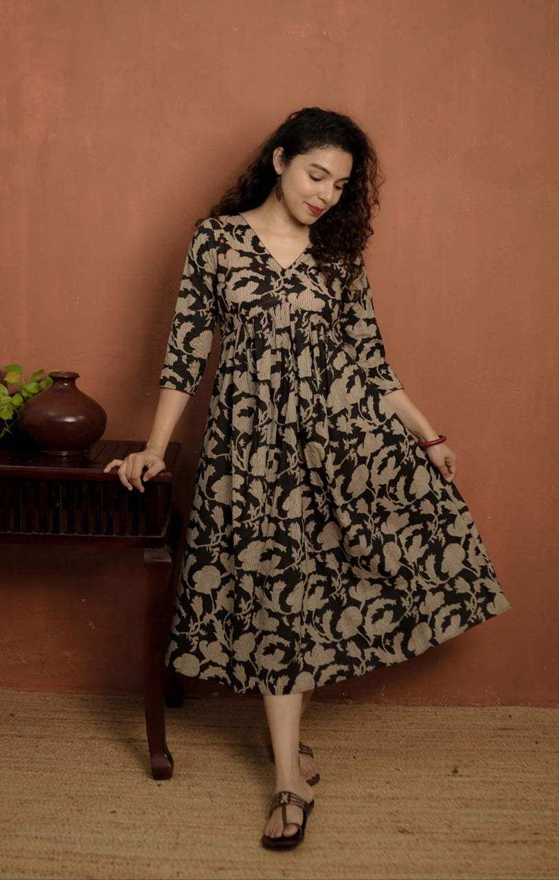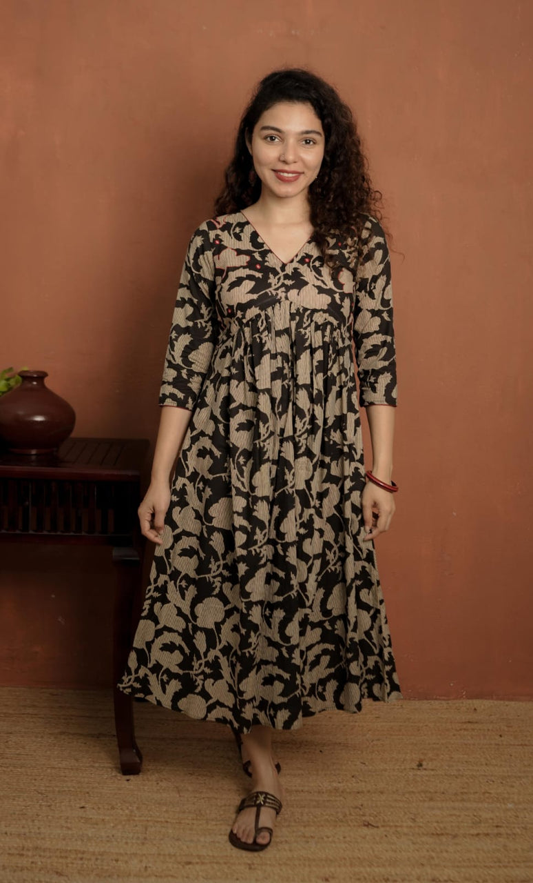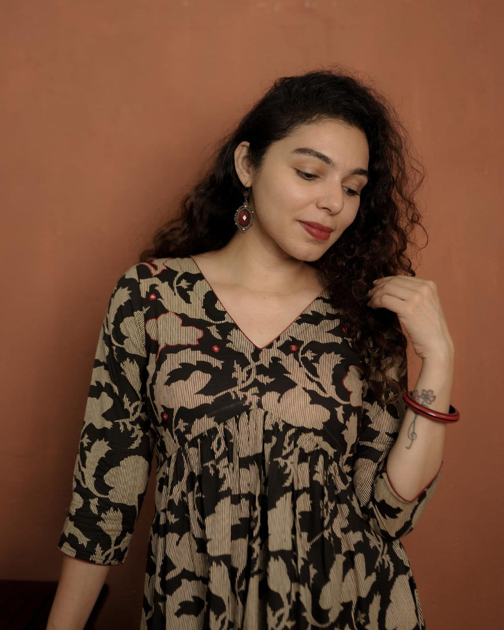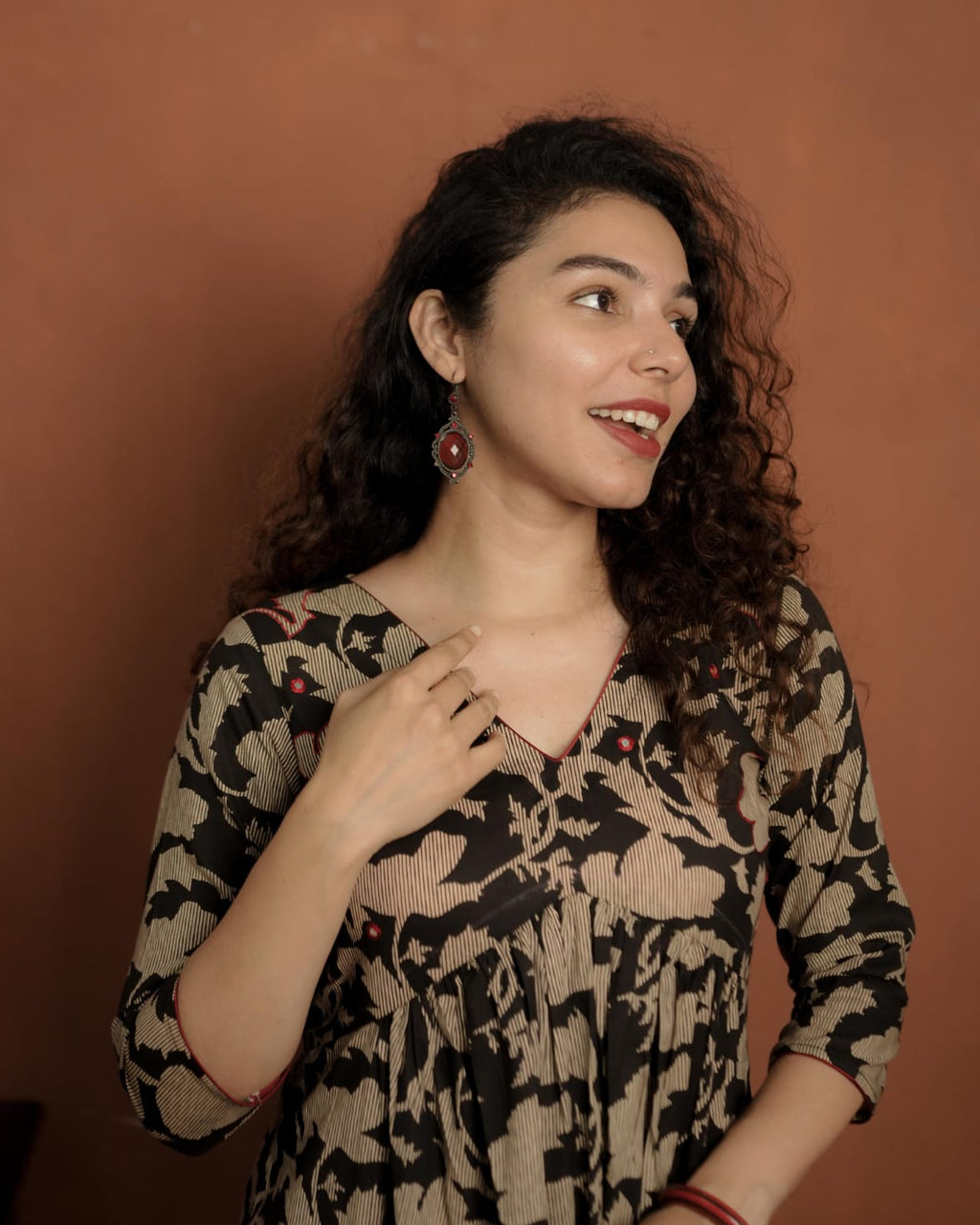 Designer printed cotton Alia cut A-Line kurthi with V Neck. Embroidery and Mirror work on Yoke for detailing. Gathers on yoke portion. Piping on neck and sleeves end.