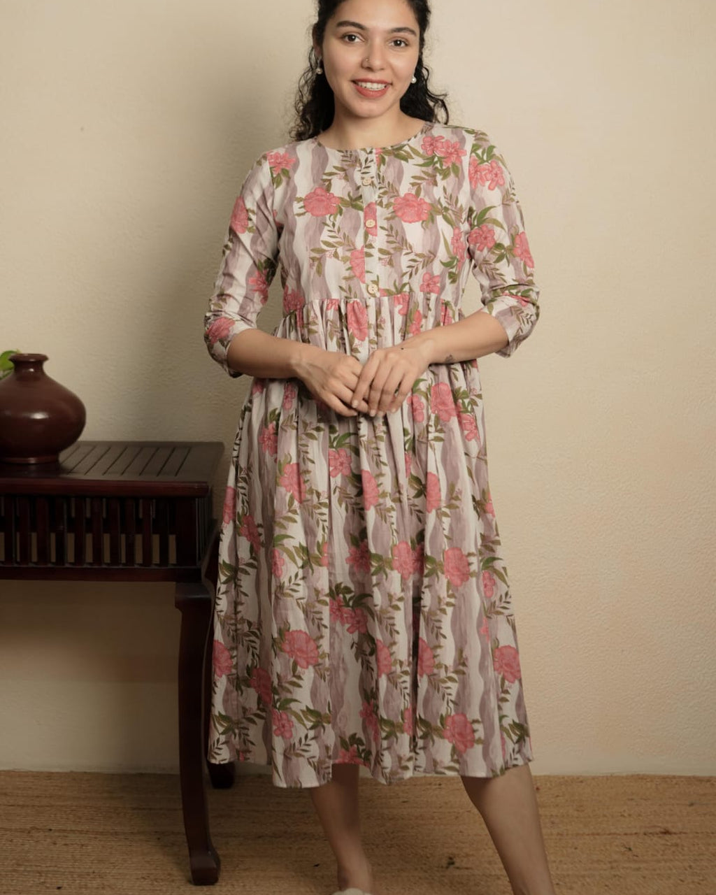 Cotton A line Dress with Floral Print .Closed Neck & Buttons added for detailing. Gathers on Yoke portion.