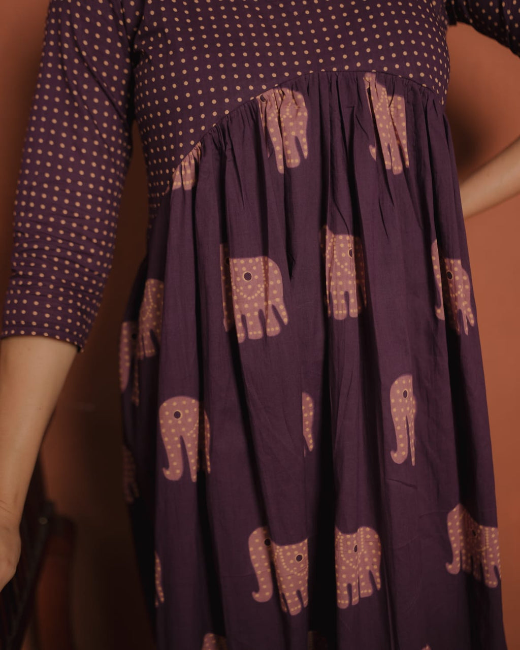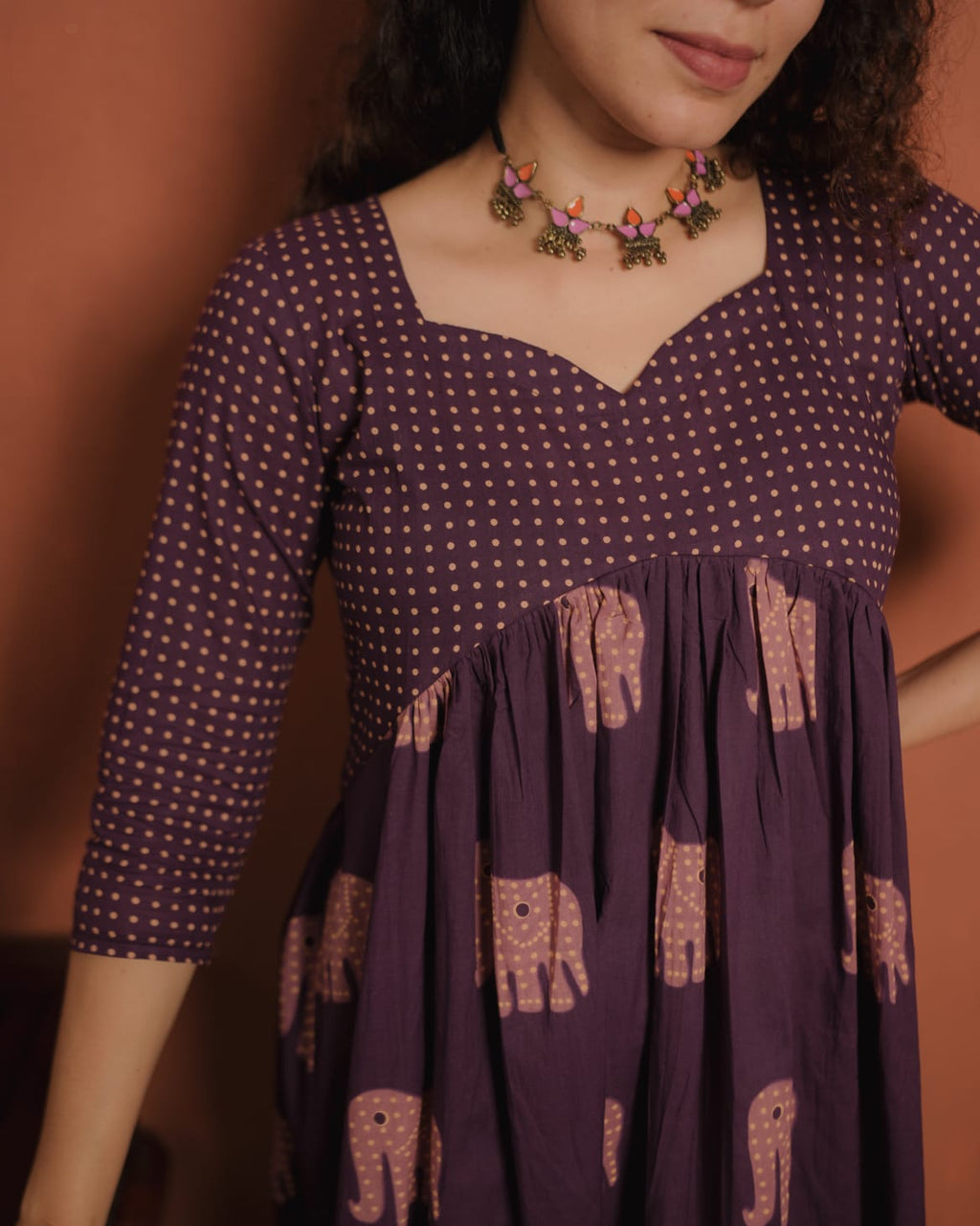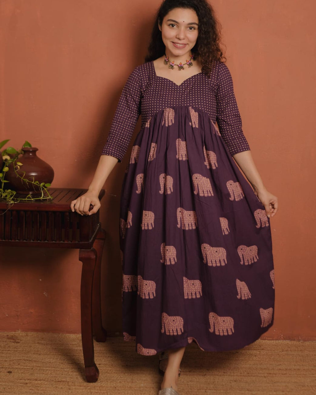 Designer printed cotton Alia cut A-Line dress with V Neck. Dot print on Yoke and Sleeves. Piping on neck for detailing.