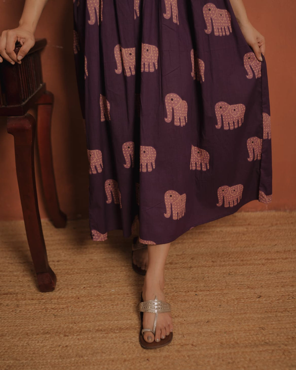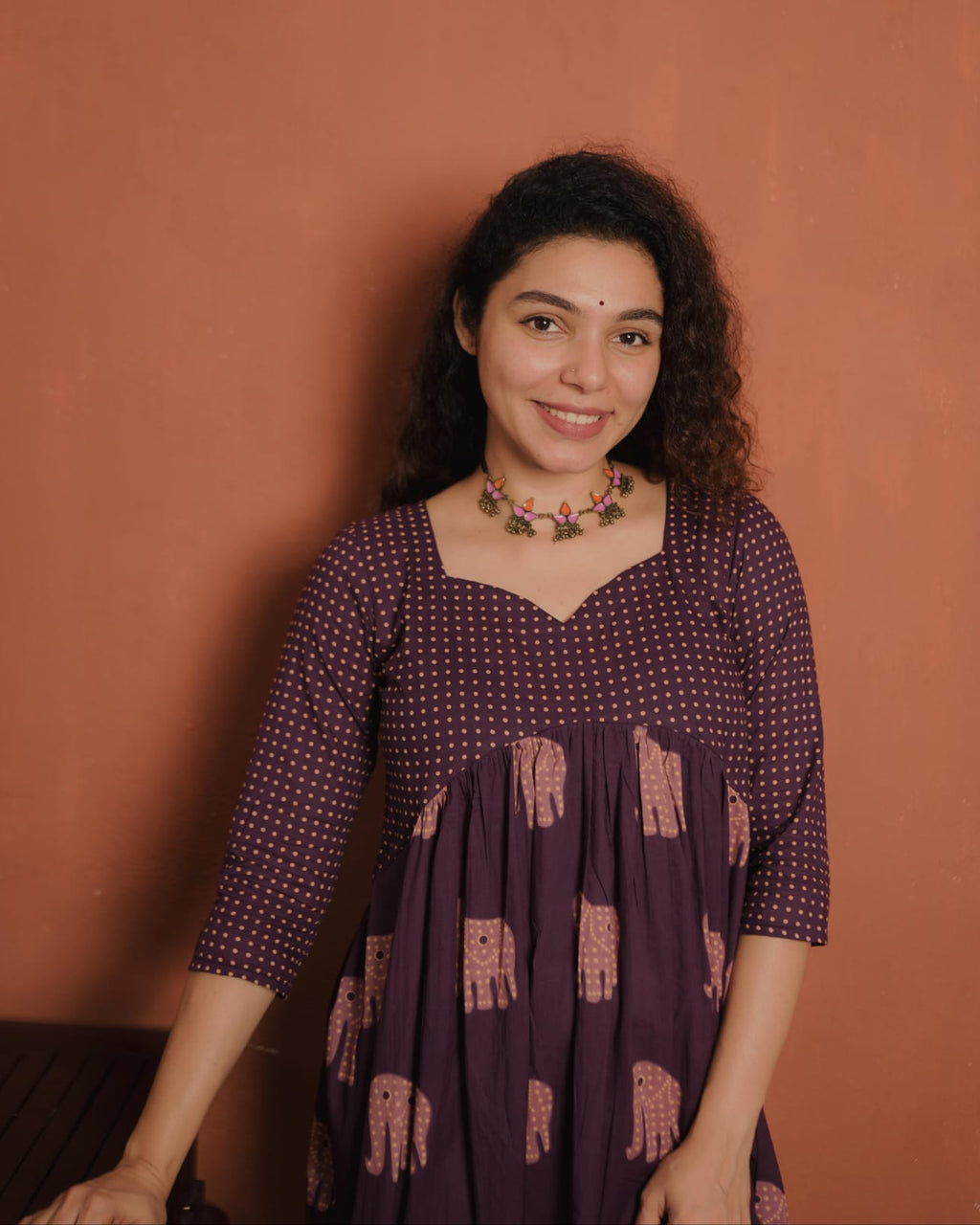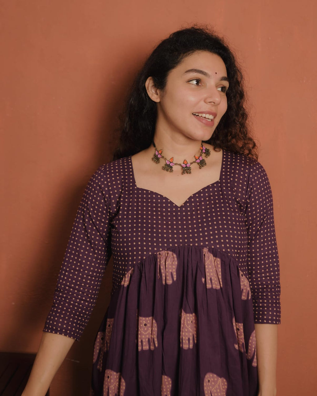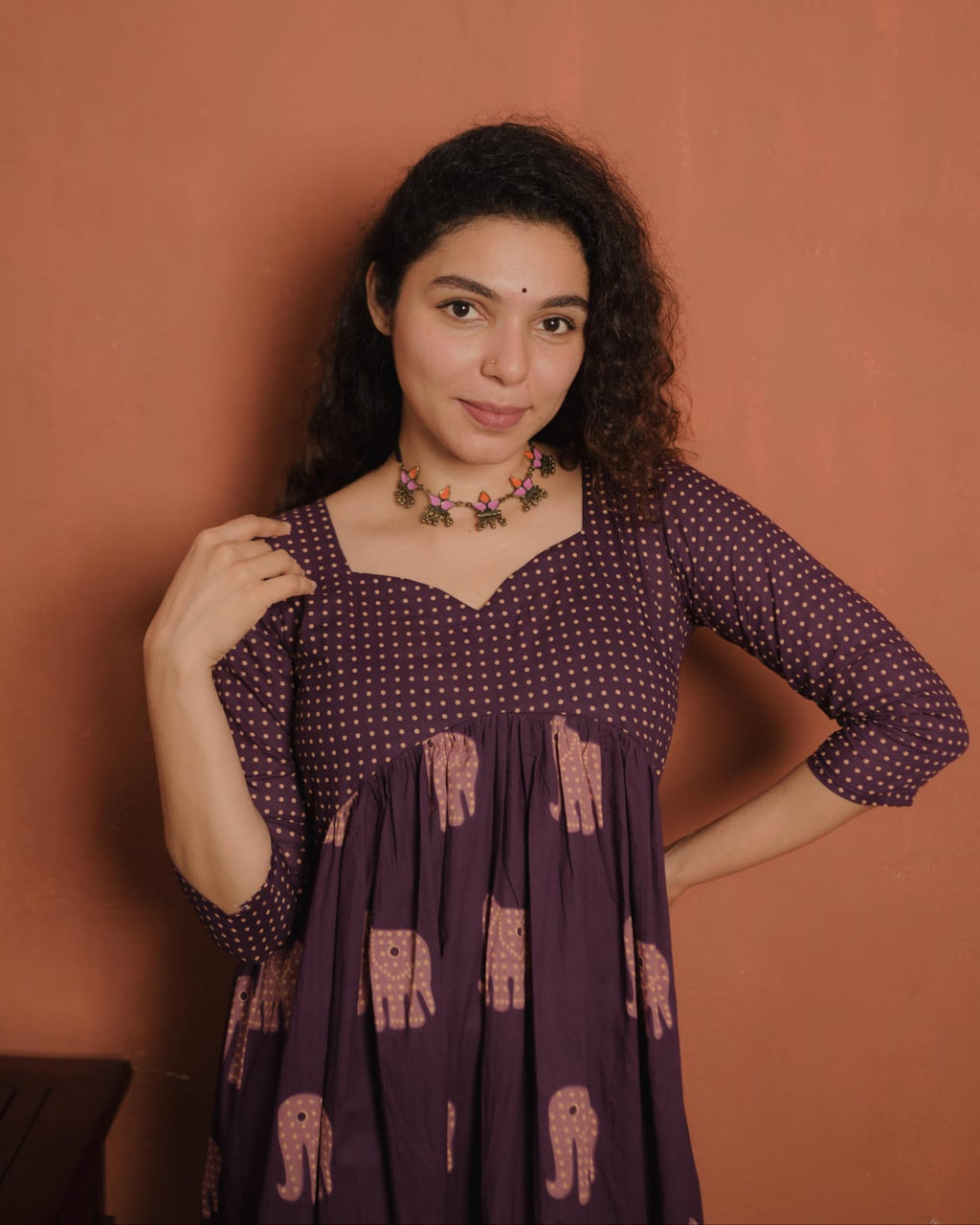 Designer printed cotton Alia cut A-Line dress with V Neck. Dot print on Yoke and Sleeves. Piping on neck for detailing.