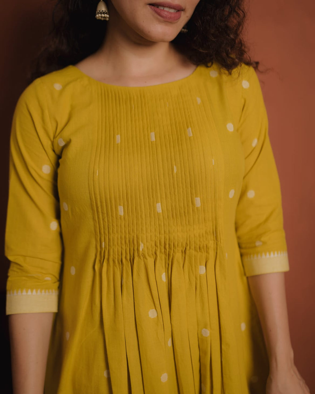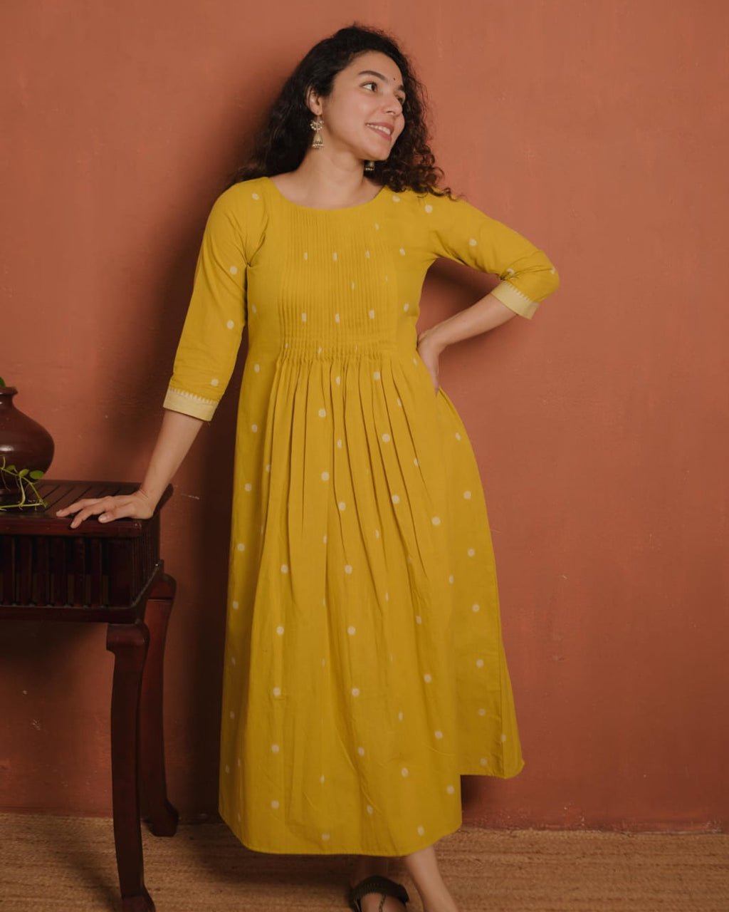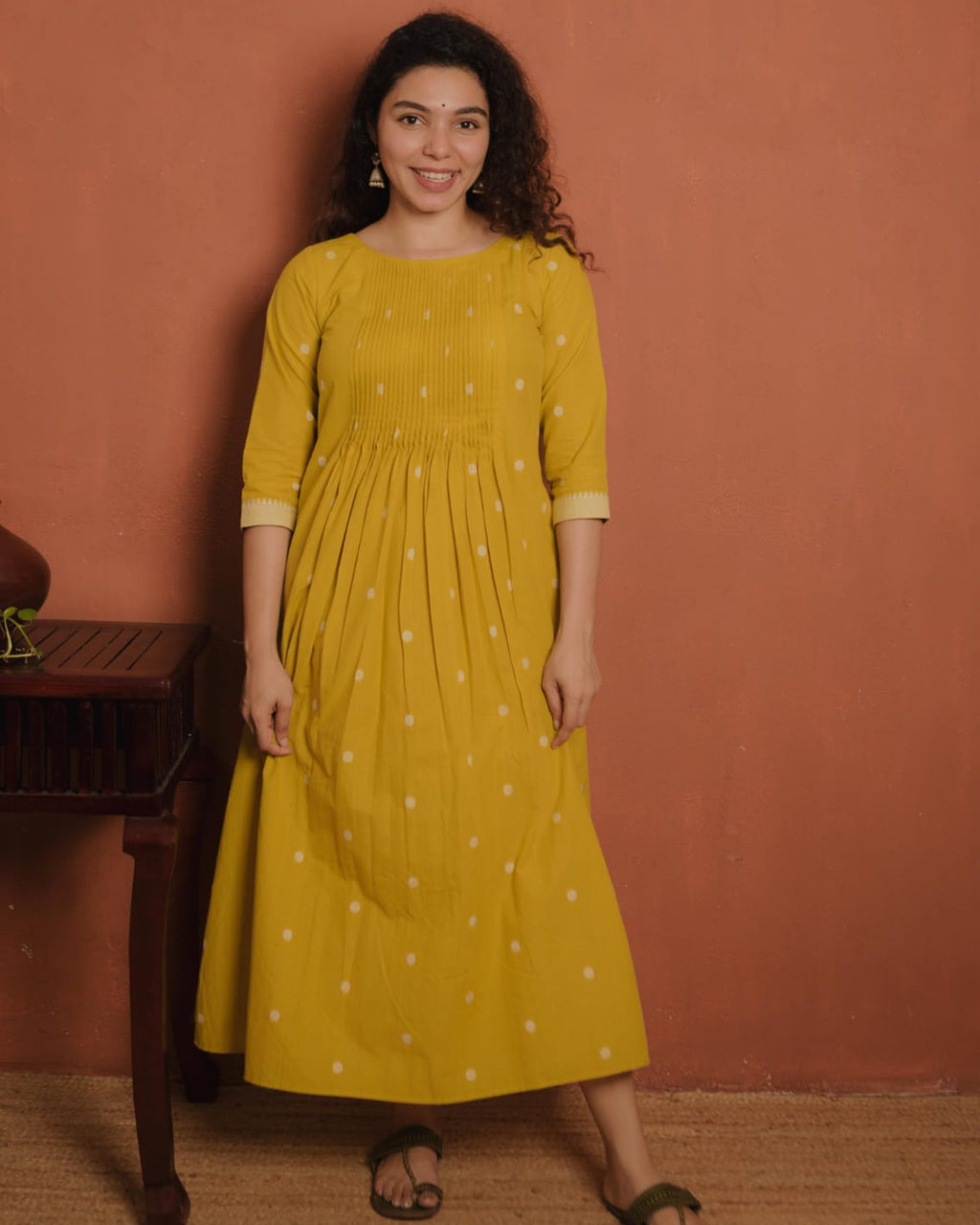 Handloom Cotton A-Line Dress with Woven buttis all over. Close Neck with small Pleats on the Yoke portion for detailing. Woven patch at the sleeves end.