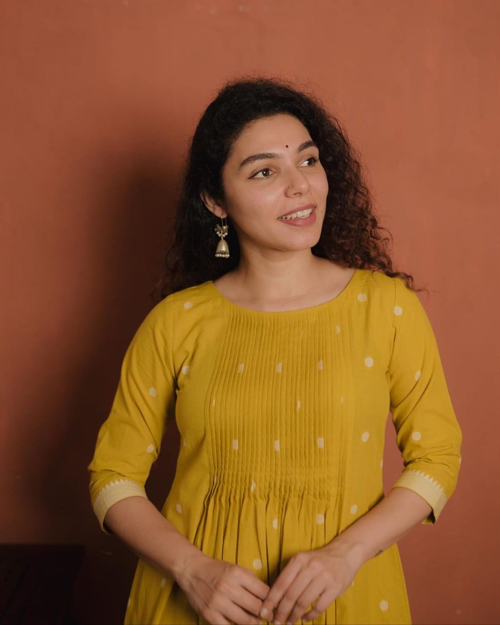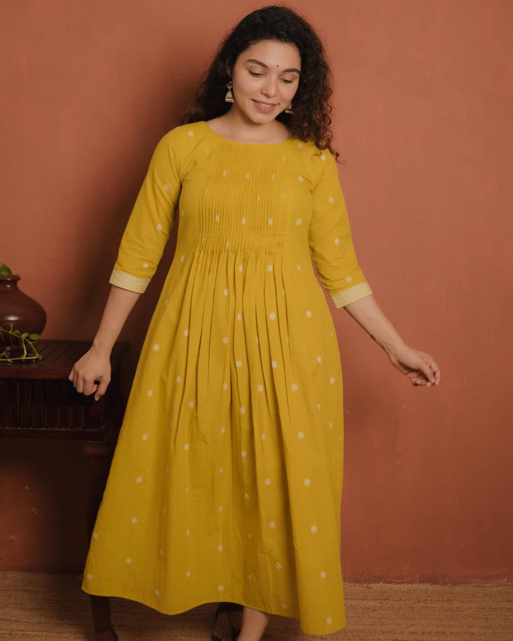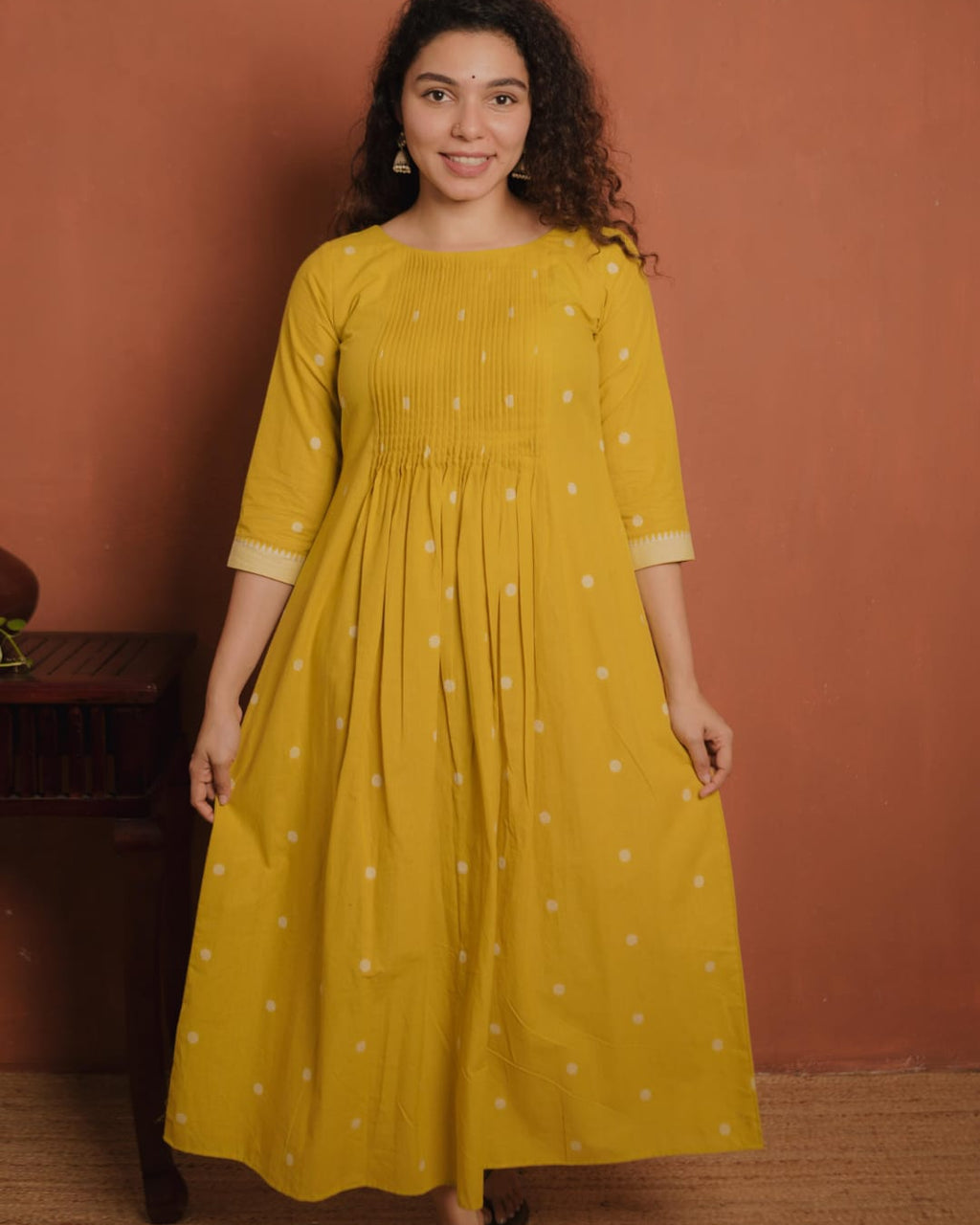 Handloom Cotton A-Line Dress with Woven buttis all over. Close Neck with small Pleats on the Yoke portion for detailing. Woven patch at the sleeves end.