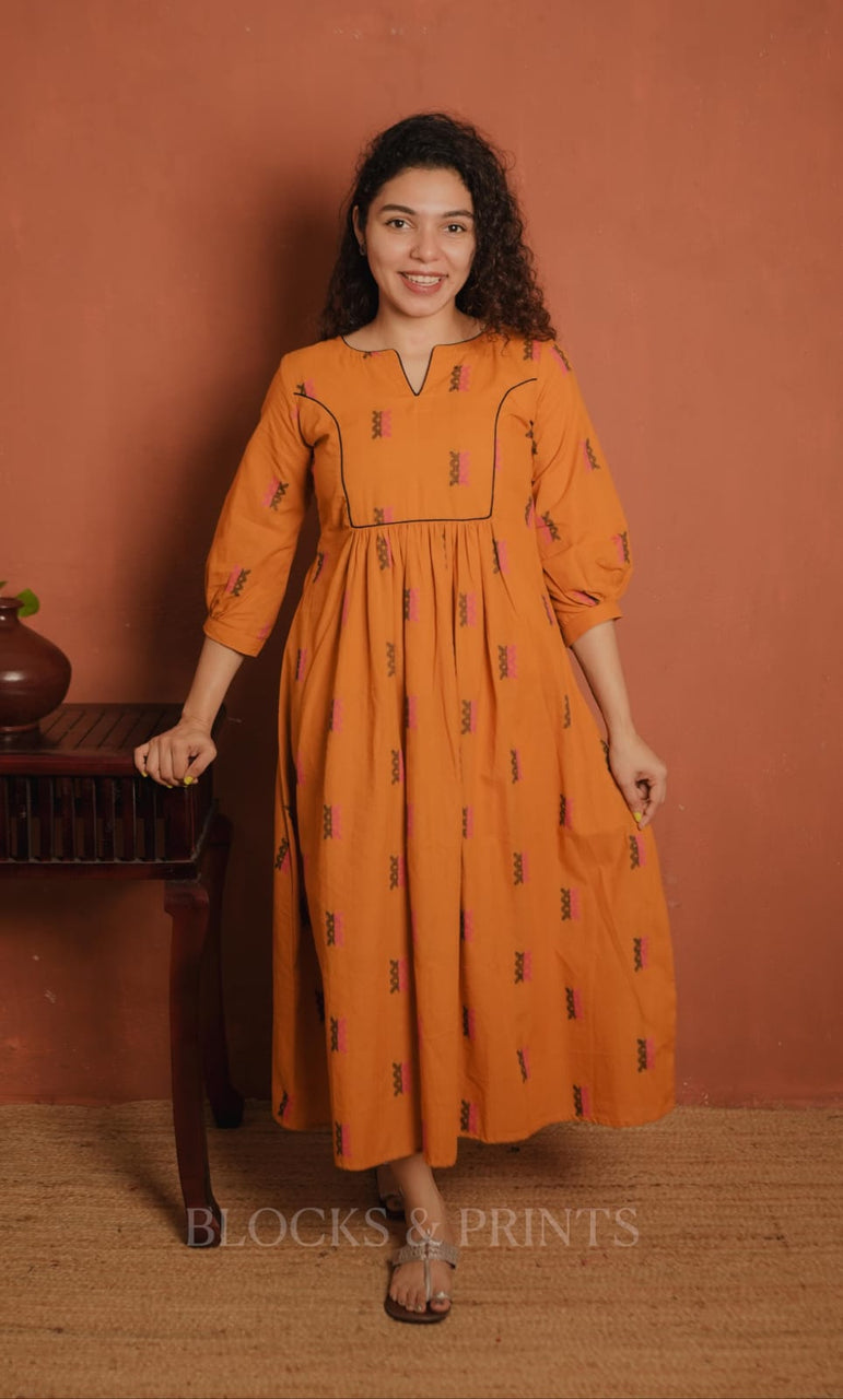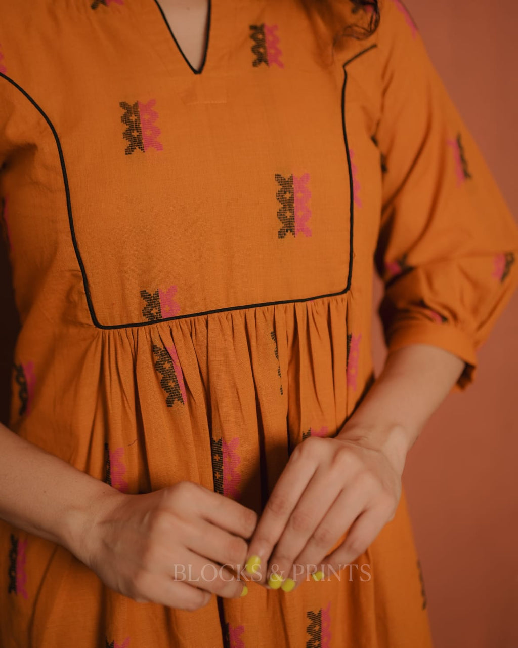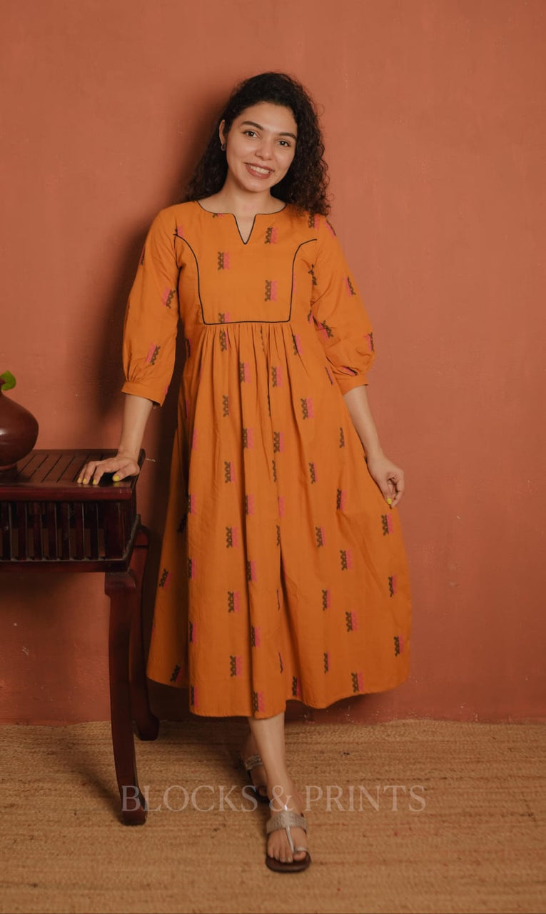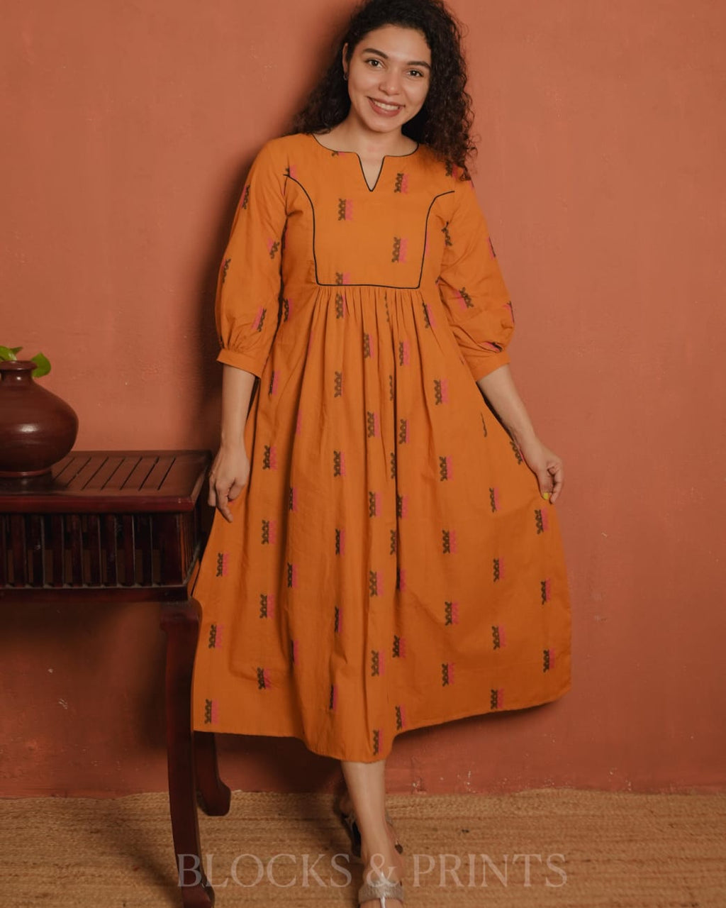 Handloom Cotton A-Line Dress with Slit V Neck. Gathers at the yoke portion. Contrast Piping on Yoke and neck. Puff at the Sleeves end.