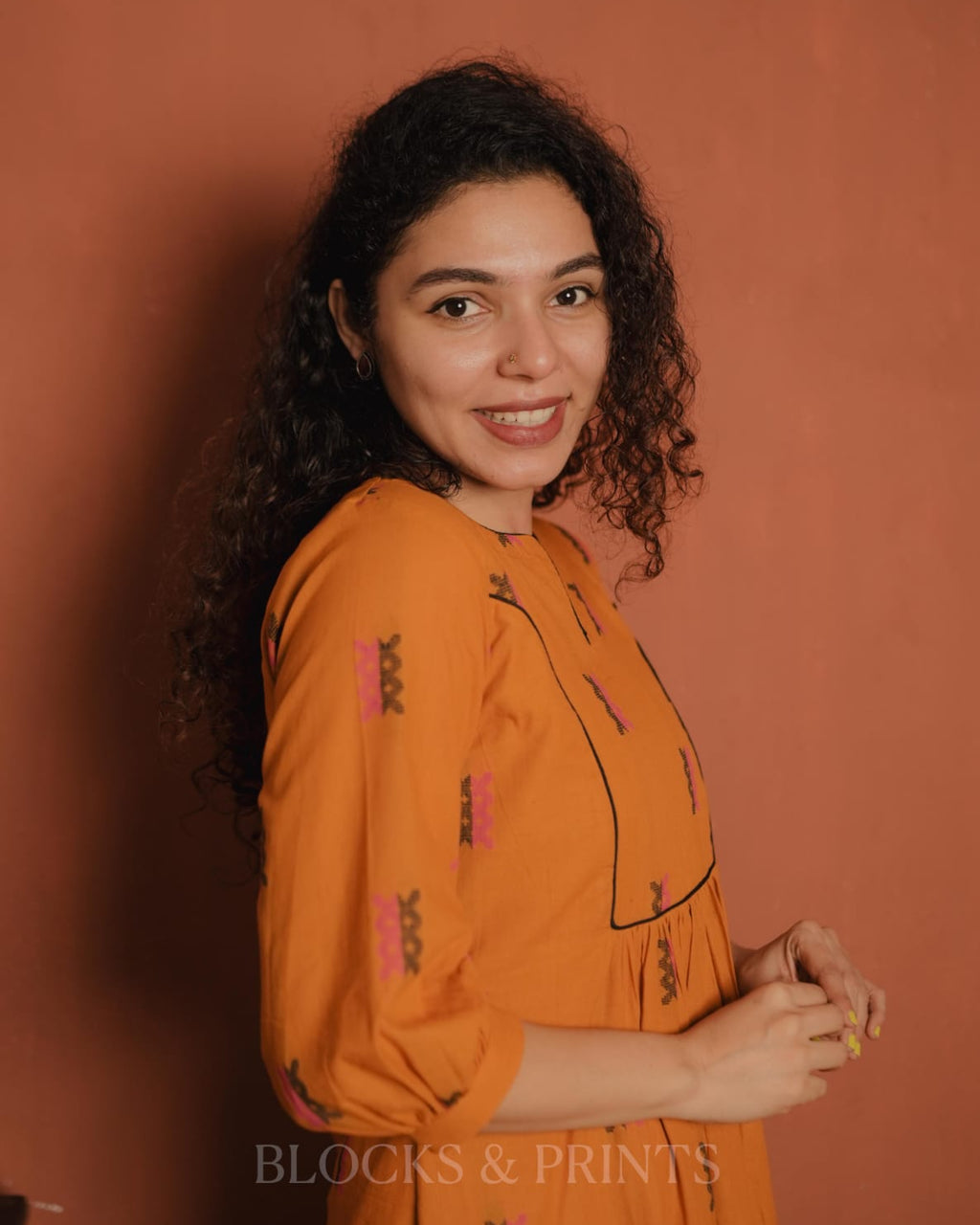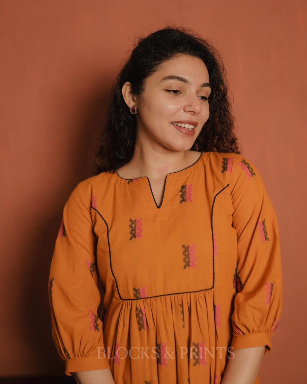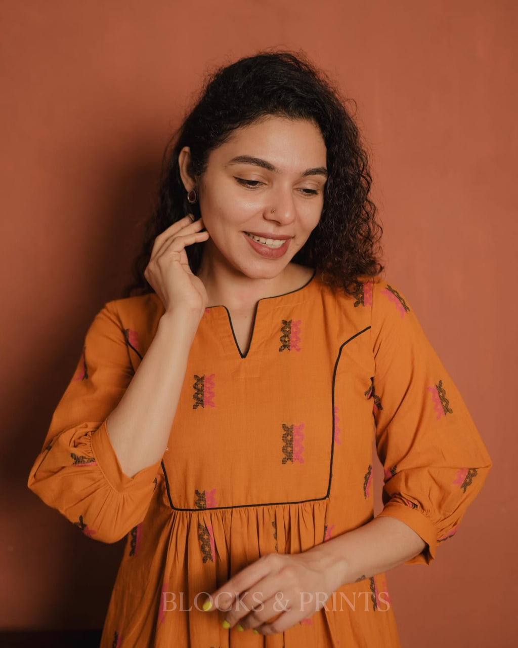 Handloom Cotton A-Line Dress with Slit V Neck. Gathers at the yoke portion. Contrast Piping on Yoke and neck. Puff at the Sleeves end.