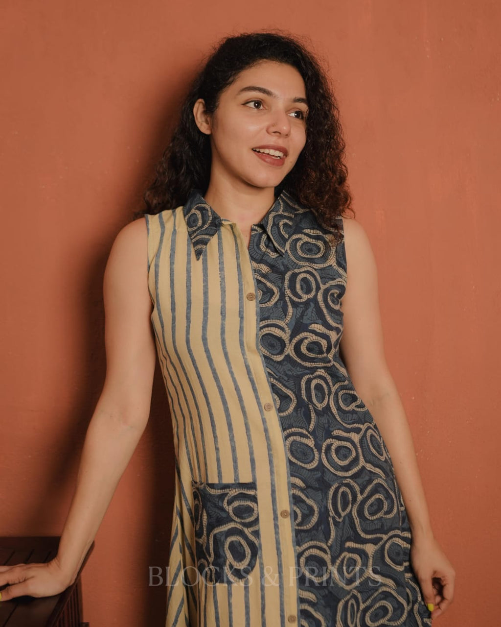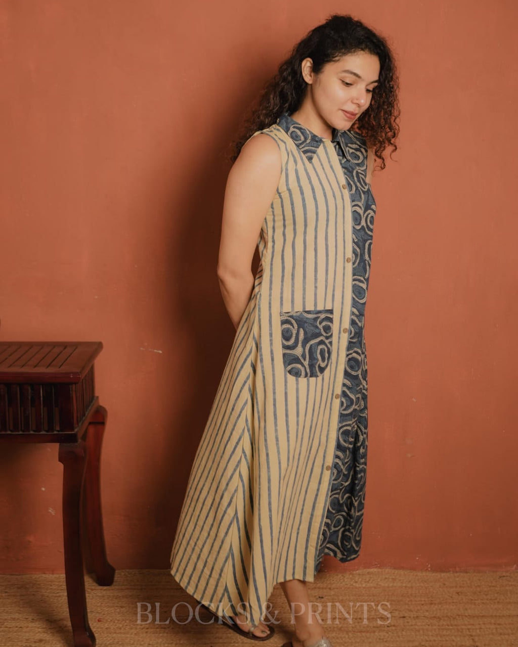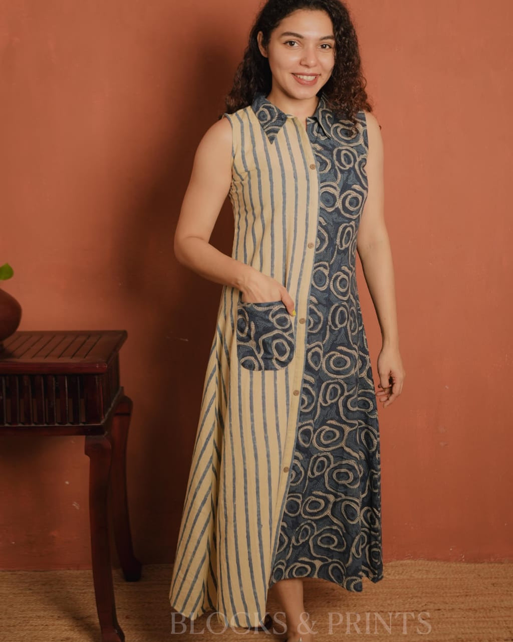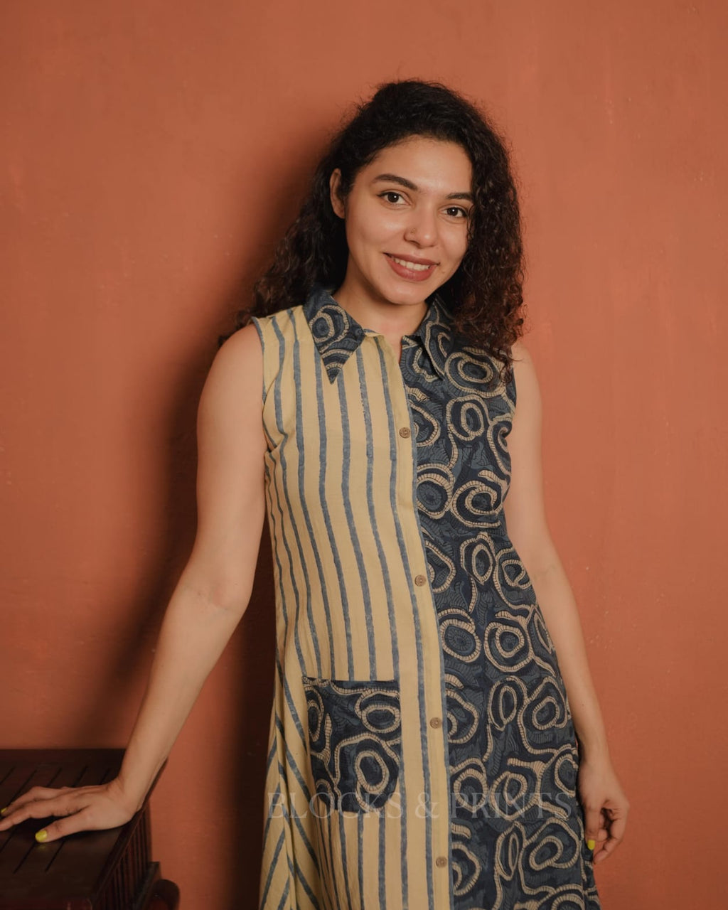 Natural dyed Indigo and Dabu Printed Cotton Half and Half  A-Line, Sleeveless, Shirt Collar Dress. Buttons added for detailing. Pocket on Front side and small slit given in the front