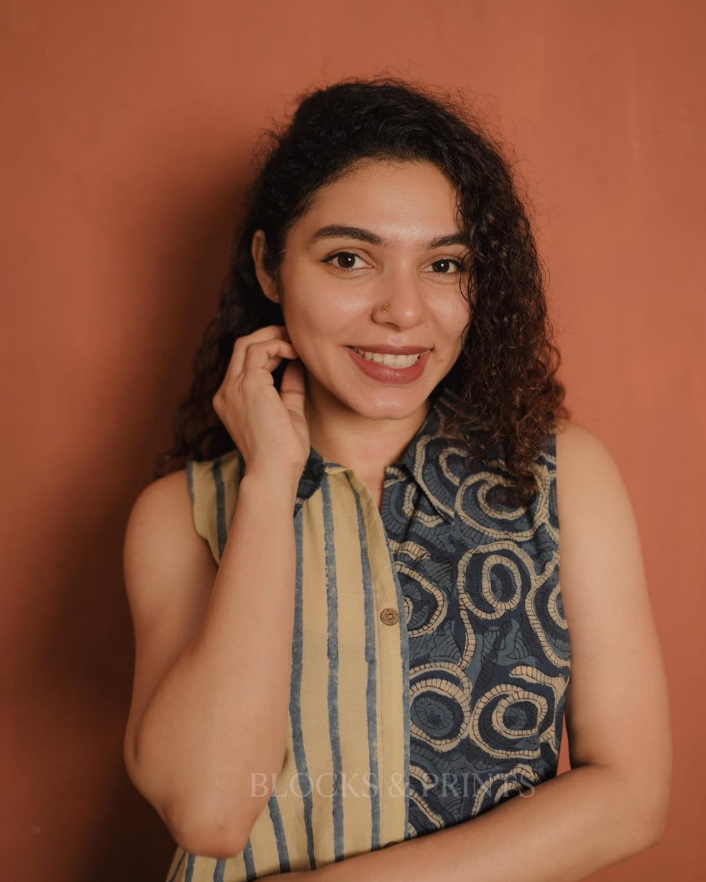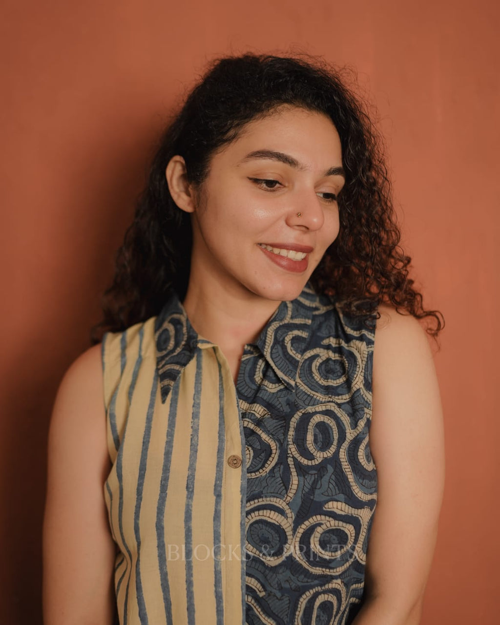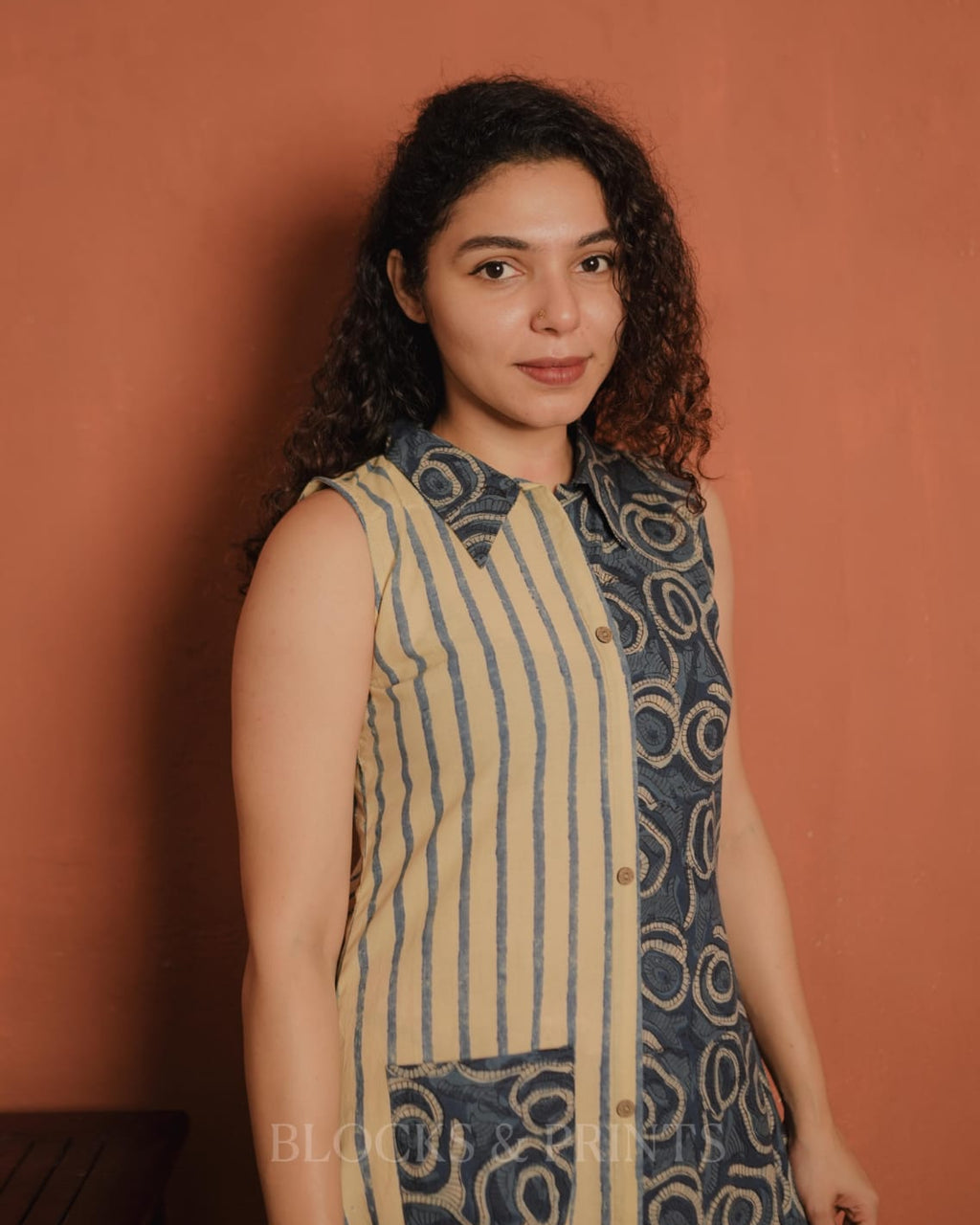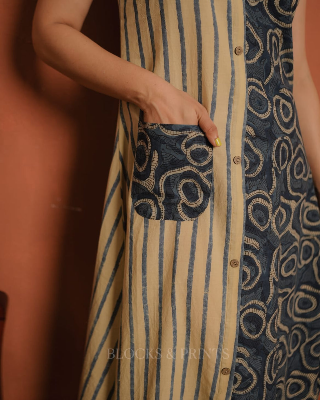 Natural dyed Indigo and Dabu Printed Cotton Half and Half  A-Line, Sleeveless, Shirt Collar Dress. Buttons added for detailing. Pocket on Front side and small slit given in the front