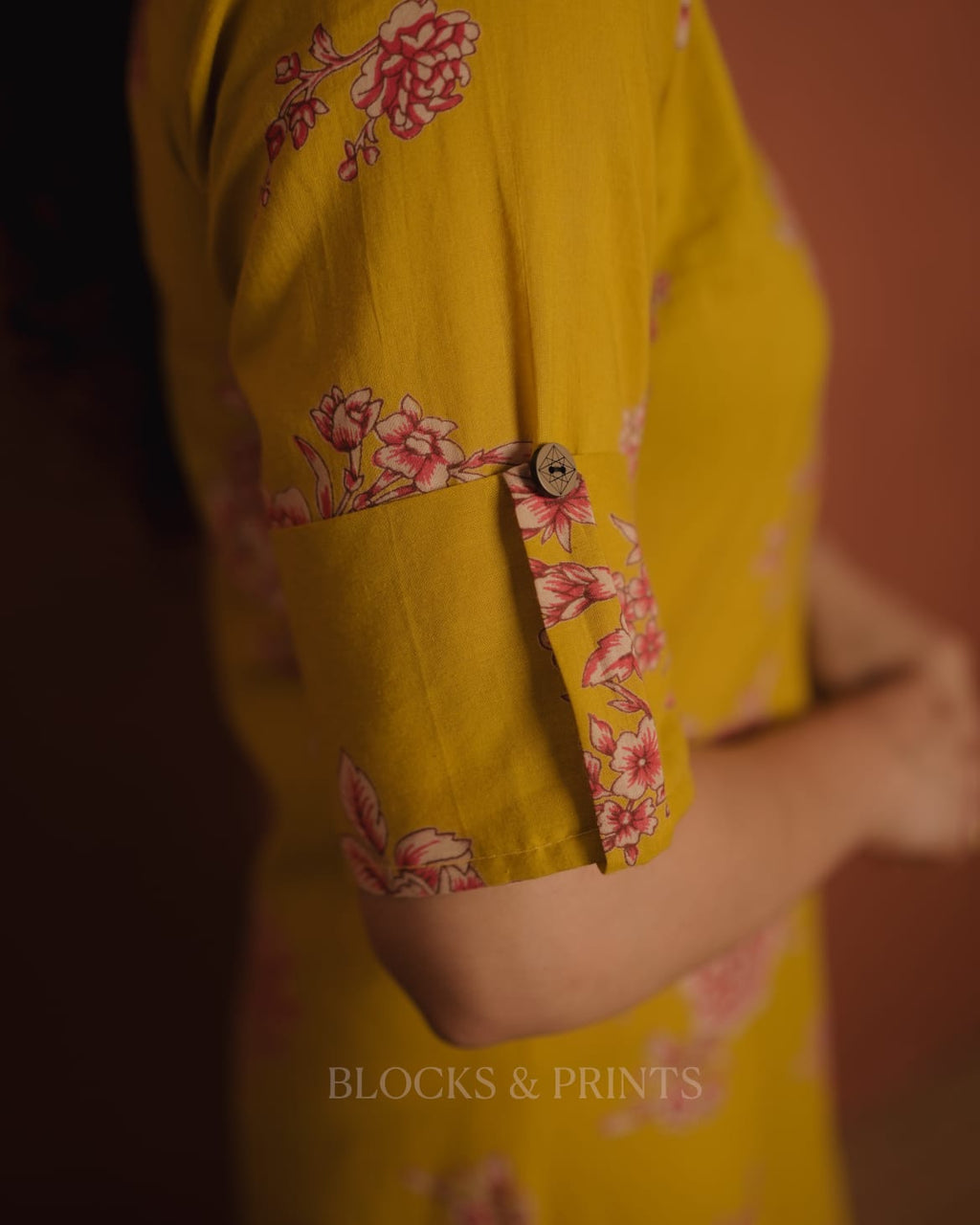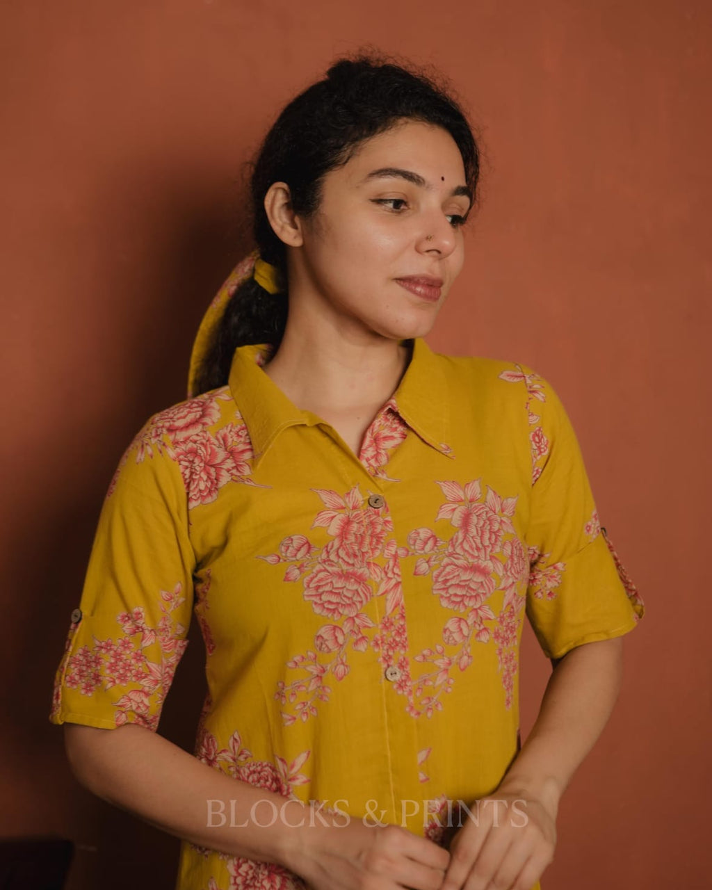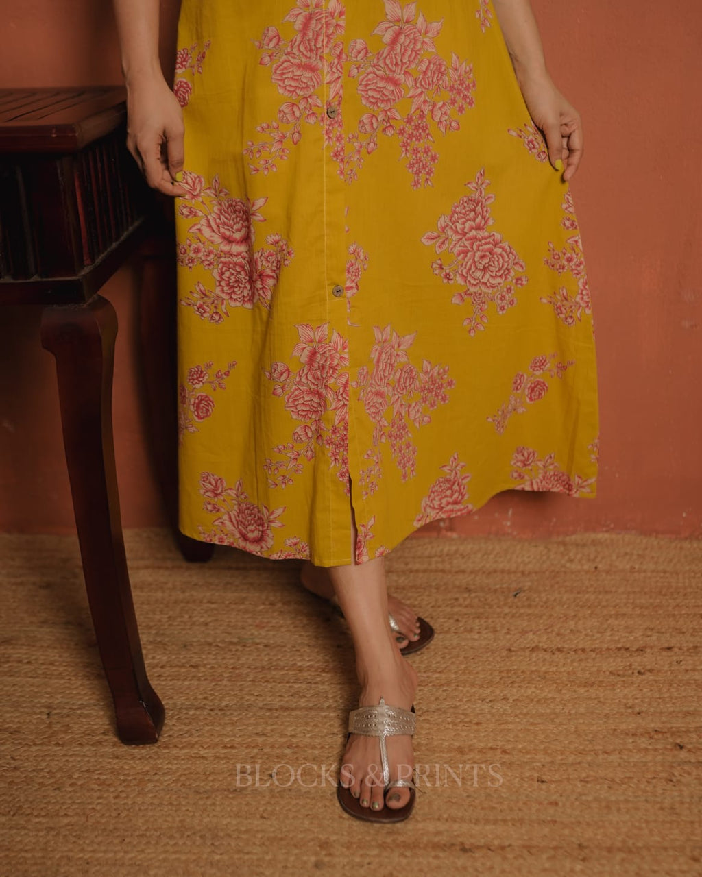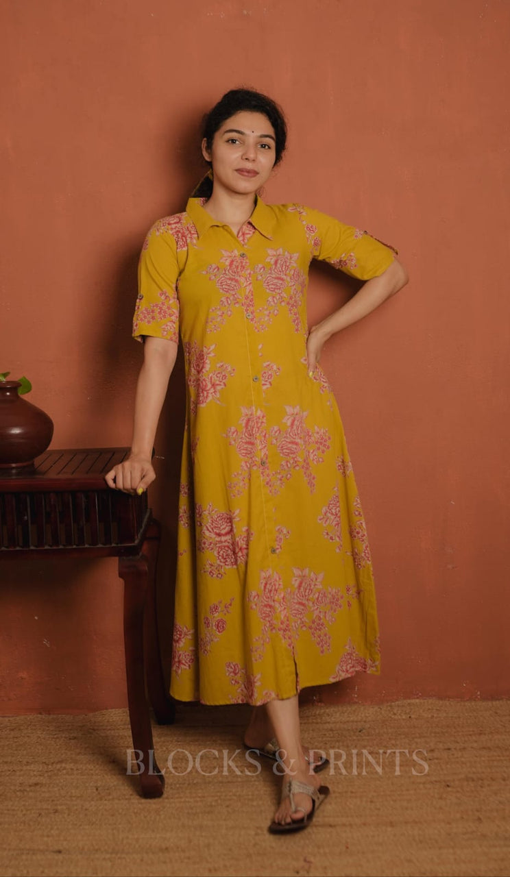 Floral Printed Cotton A Line Dress with Collar Neck. Buttons on front portion for detailing . Flaps on the sleeves. Small silt in front.