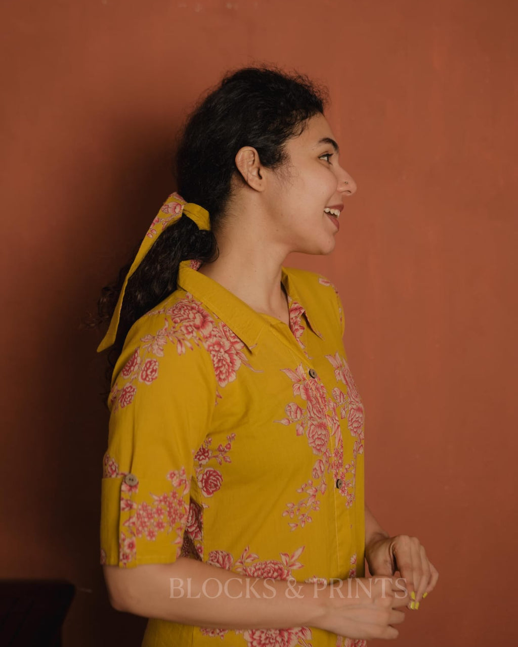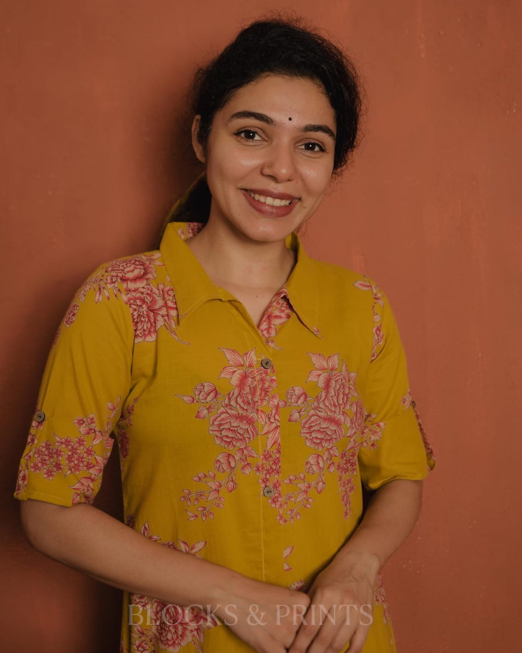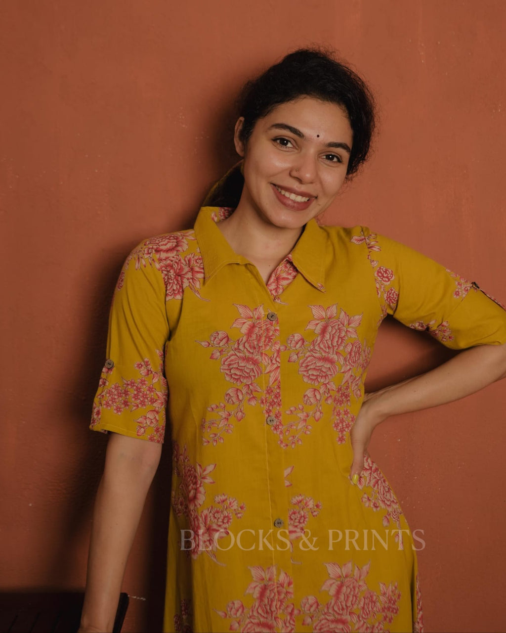 Floral Printed Cotton A Line Dress with Collar Neck. Buttons on front portion for detailing . Flaps on the sleeves. Small silt in front.
