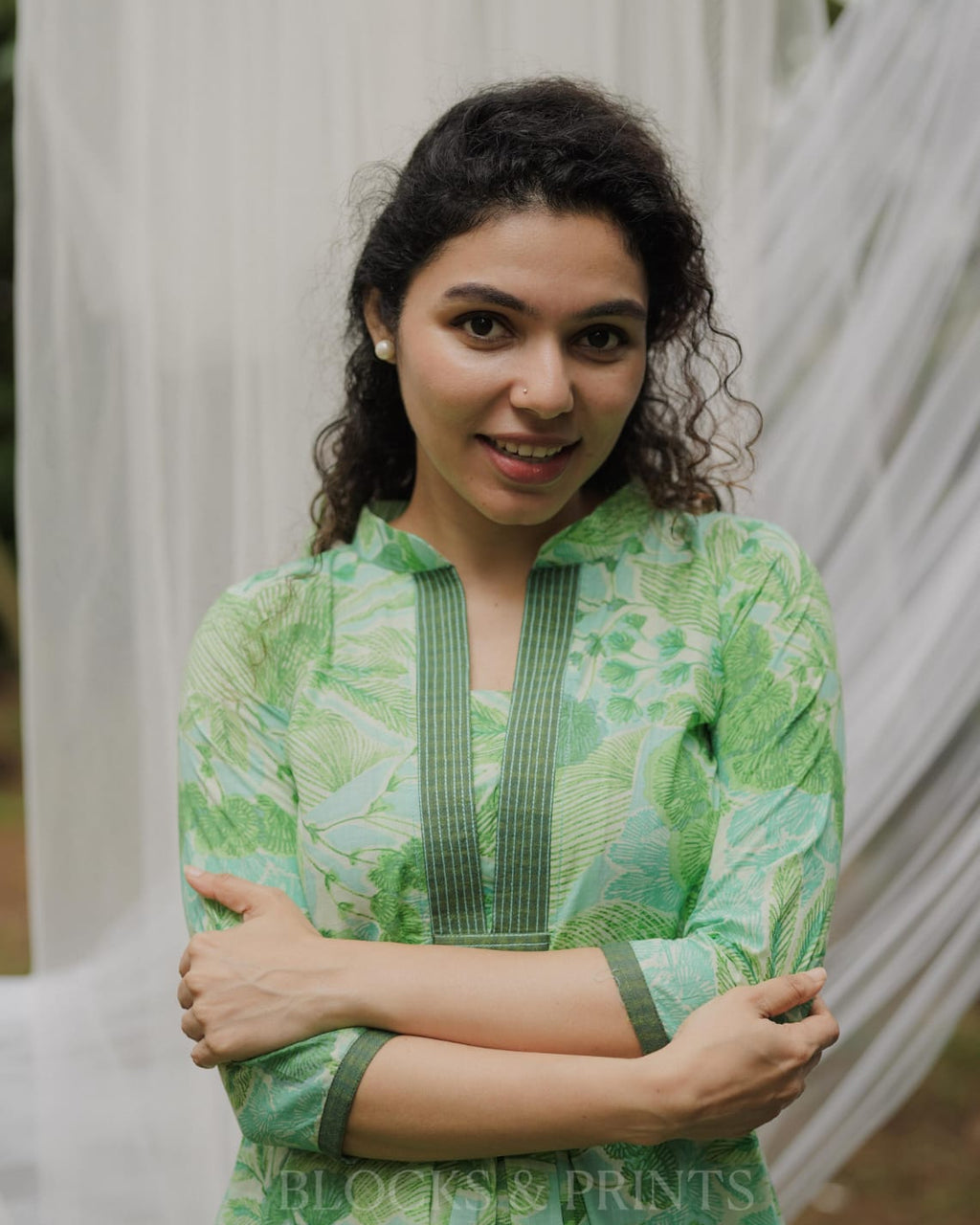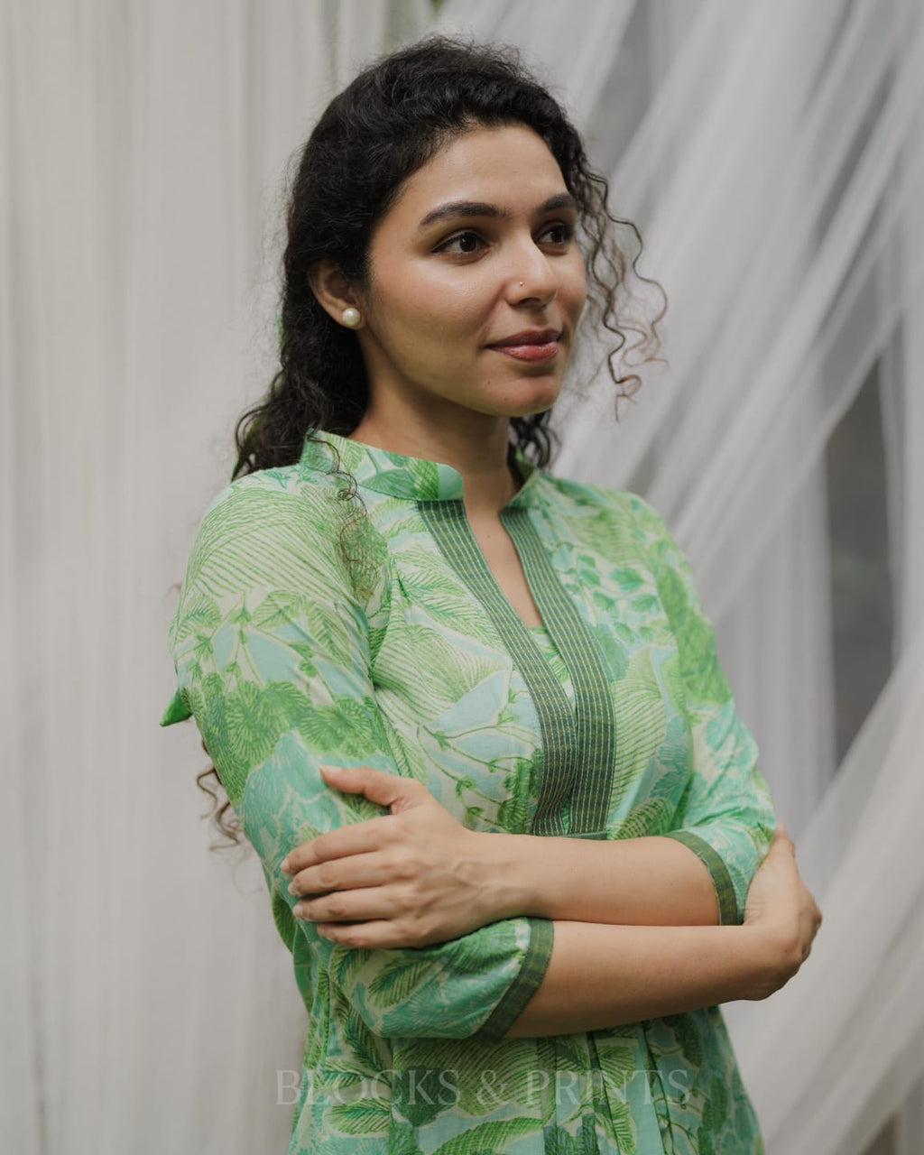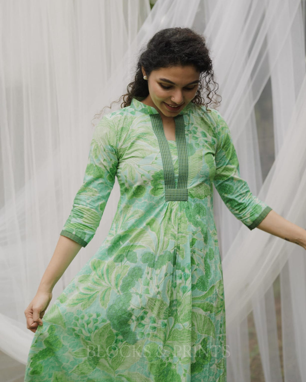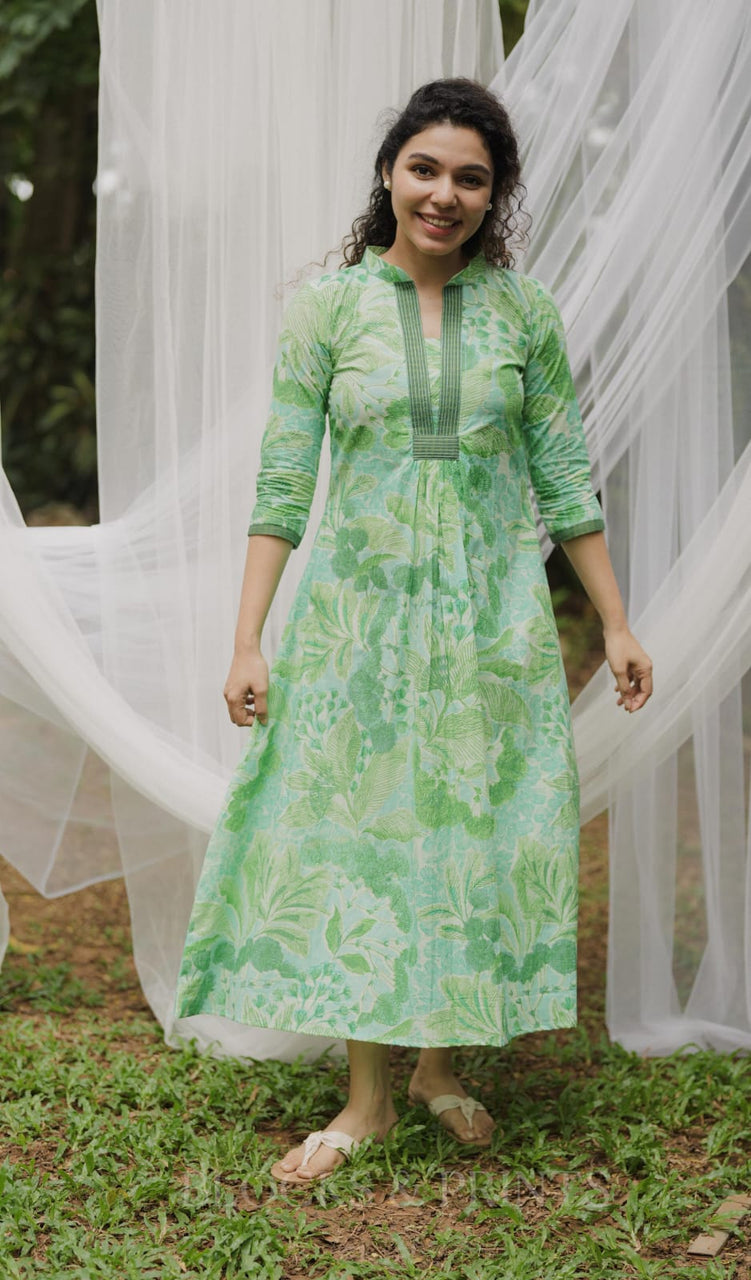 Soft Cotton printed A-Line dress with collar neck. Dobby cotton check patch on neck, yoke with running stitch and at the sleeves end. Small gathers on yoke.