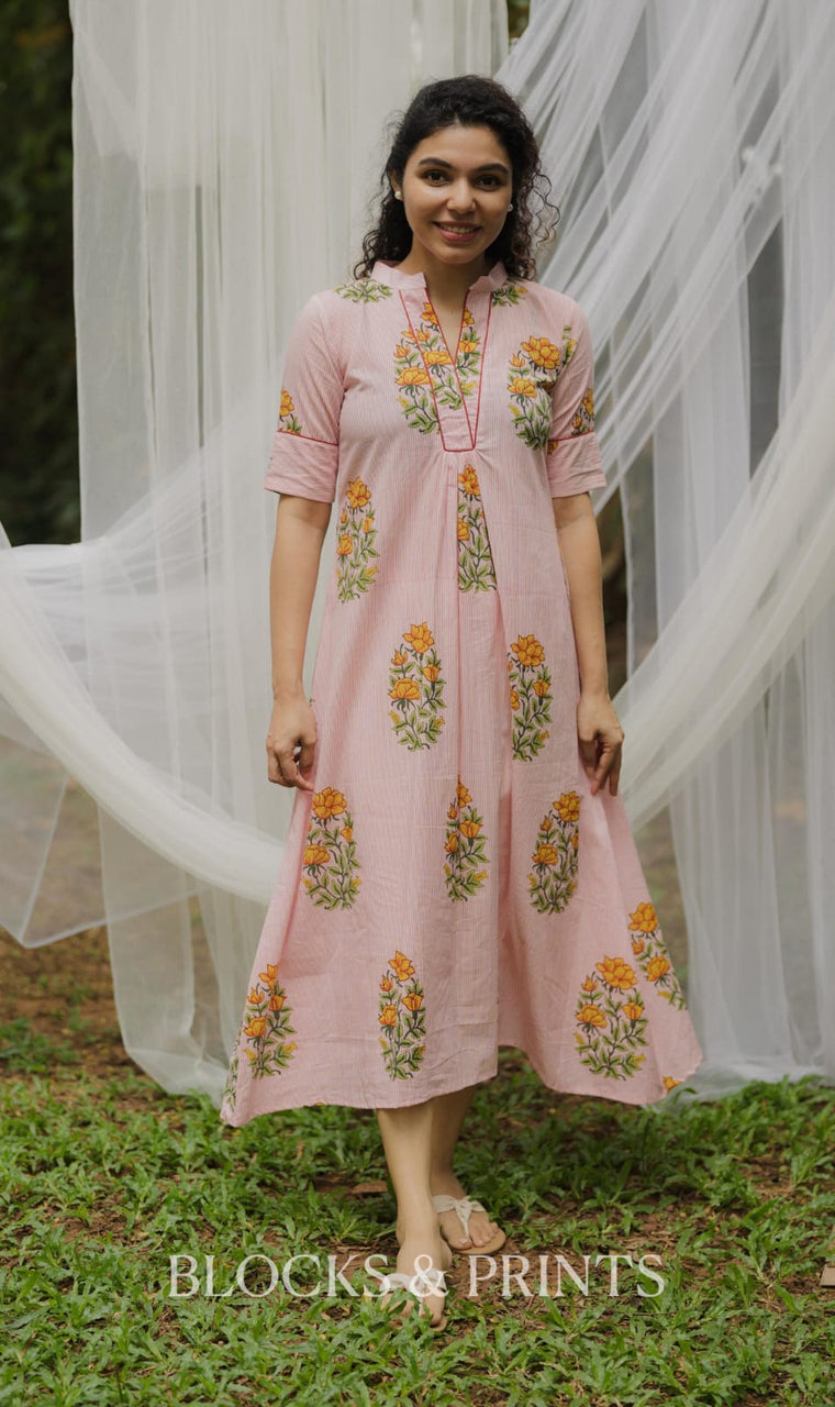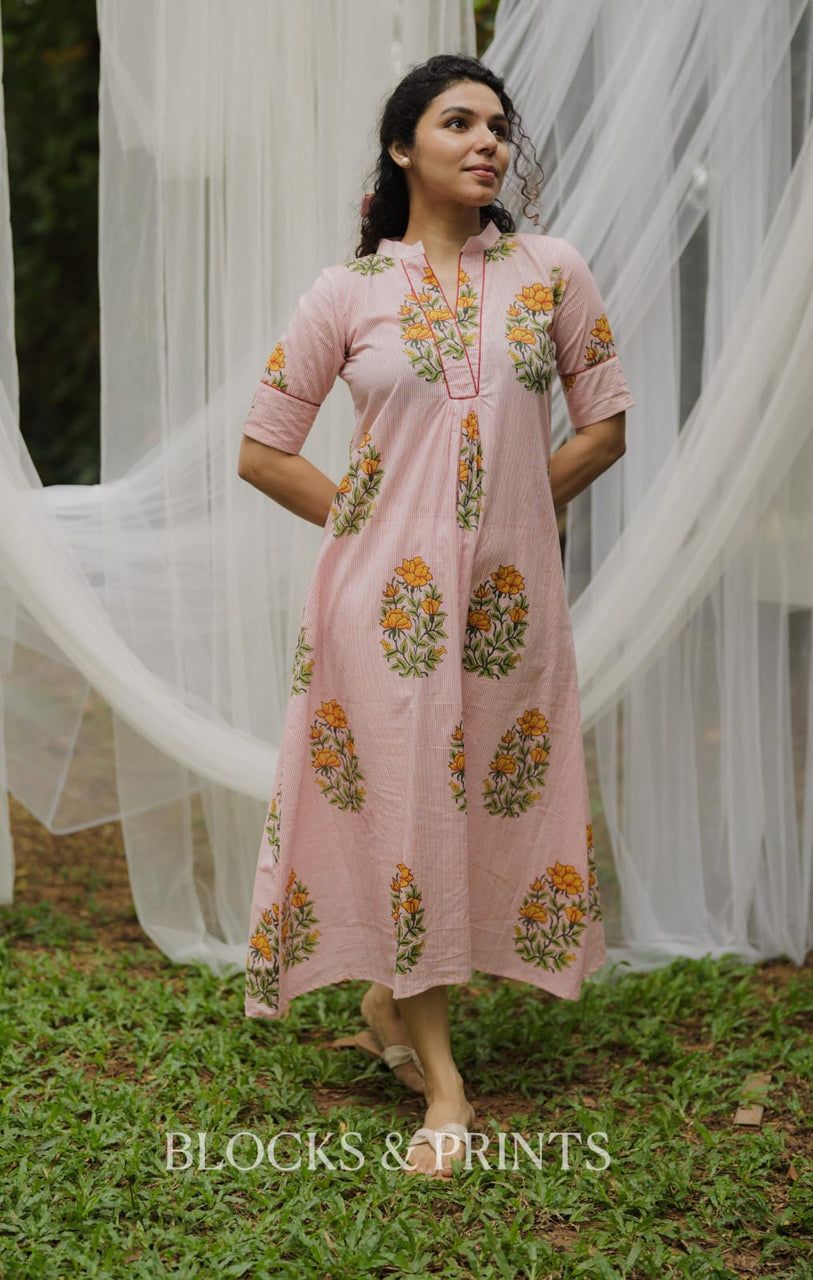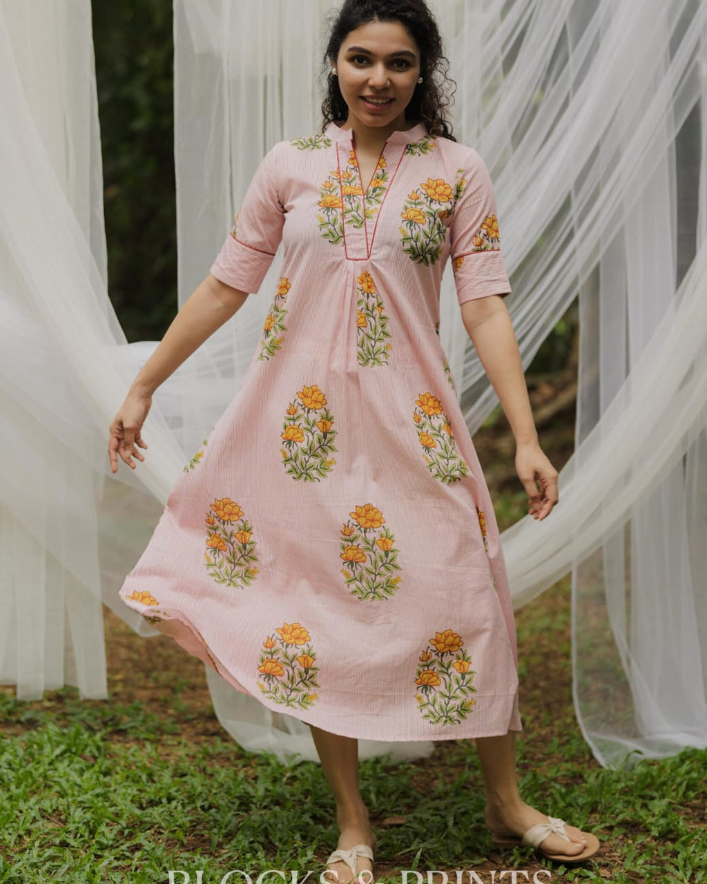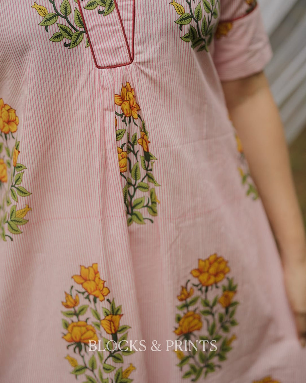 Printed Cotton A-Line dress with Collar neck. Contrast color Piping on neck, yoke and sleeve end for detailing. Small gathers on the waist.