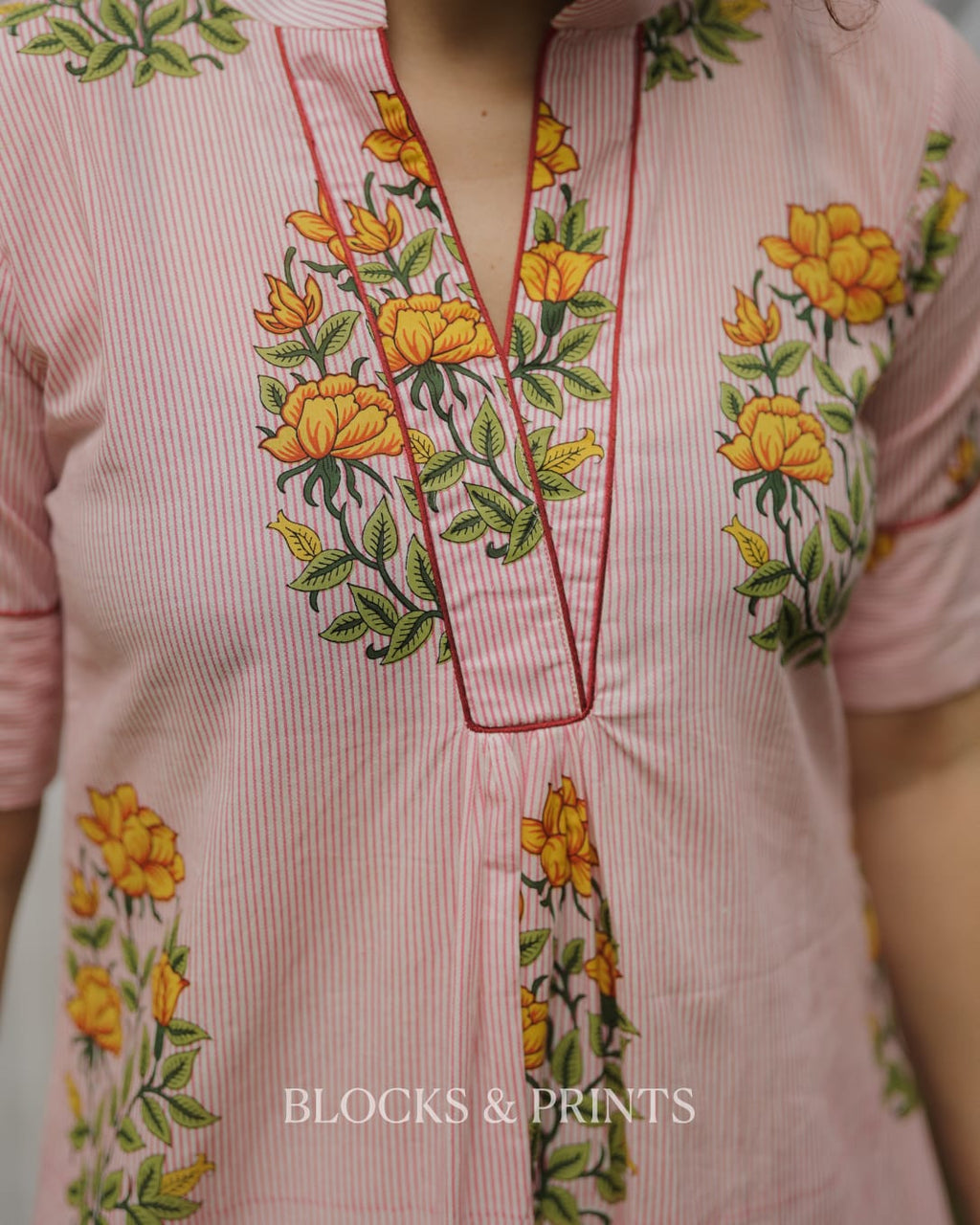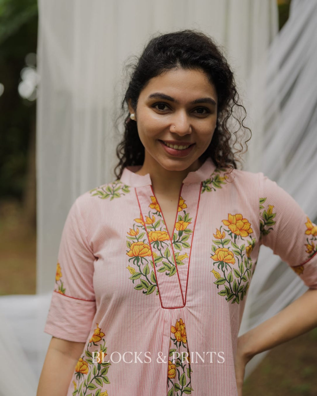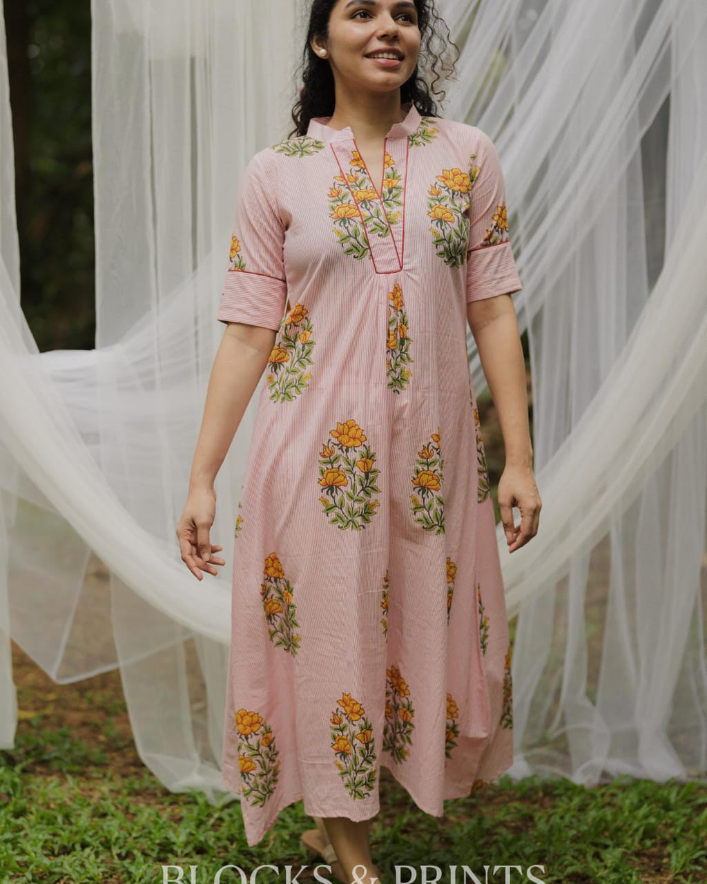 Printed Cotton A-Line dress with Collar neck. Contrast color Piping on neck, yoke and sleeve end for detailing. Small gathers on the waist.