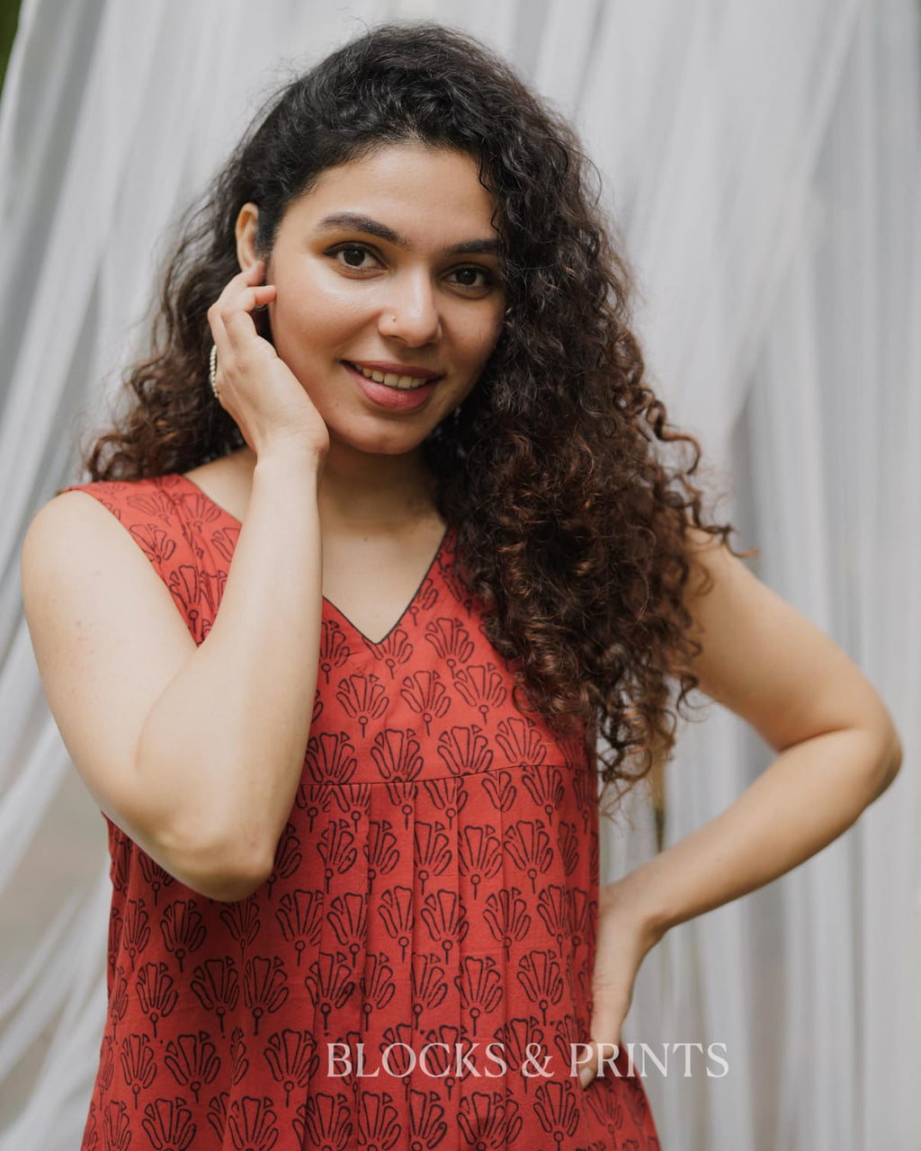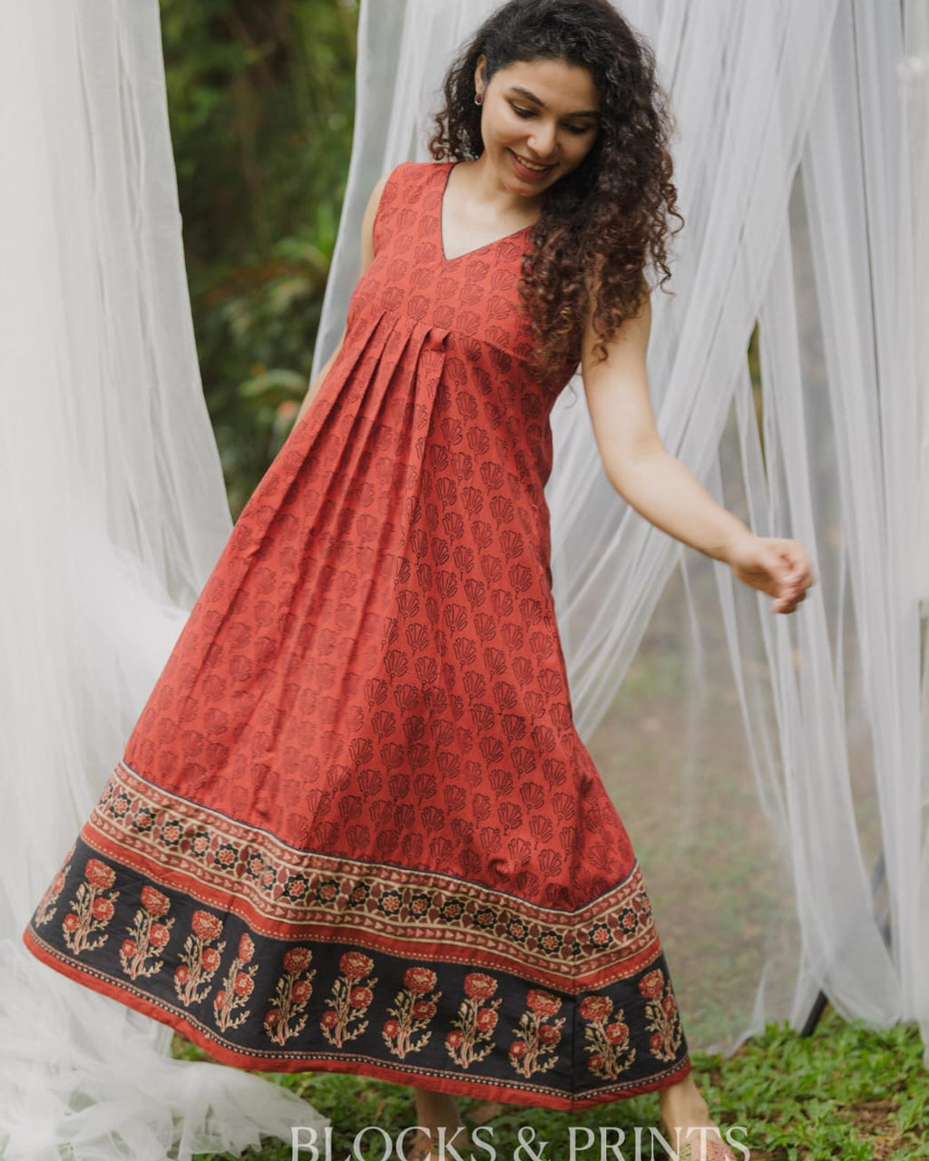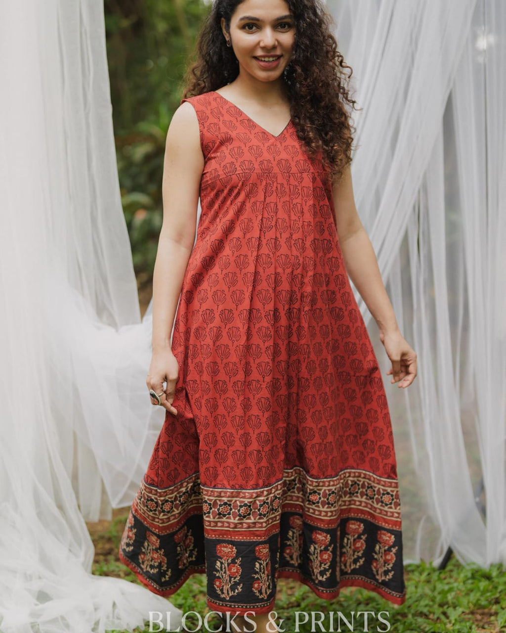 Designer Ajrakh-printed sleeveless A-line dress with V-neckline. The neckline is highlighted with piping for added detailing. Pleats are added at the yoke for an elegant finish. Designer prints on the Daman area.