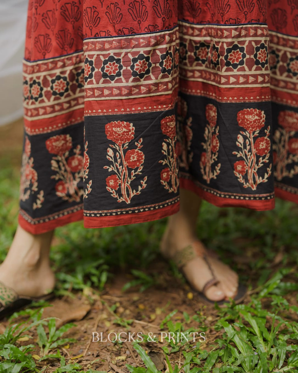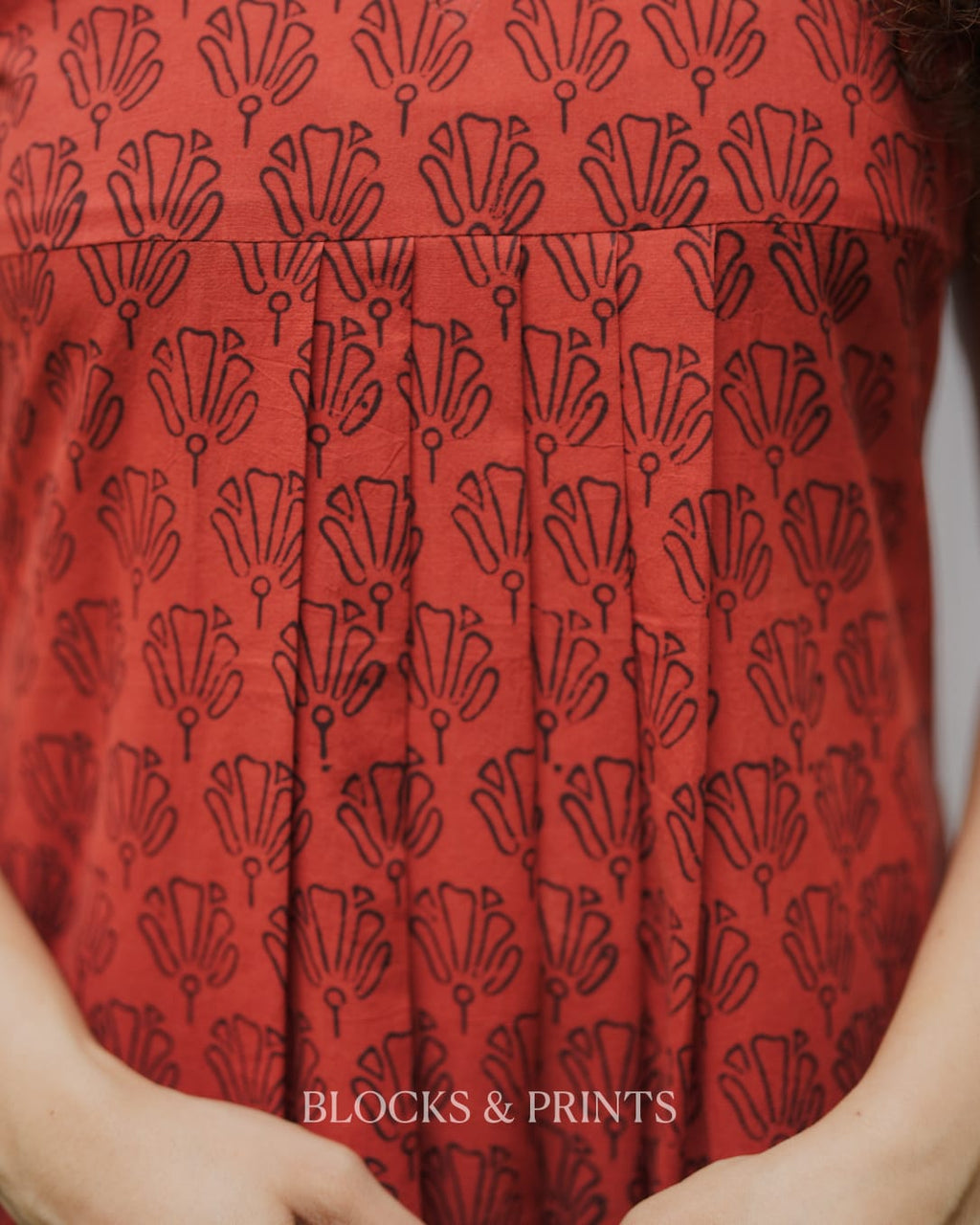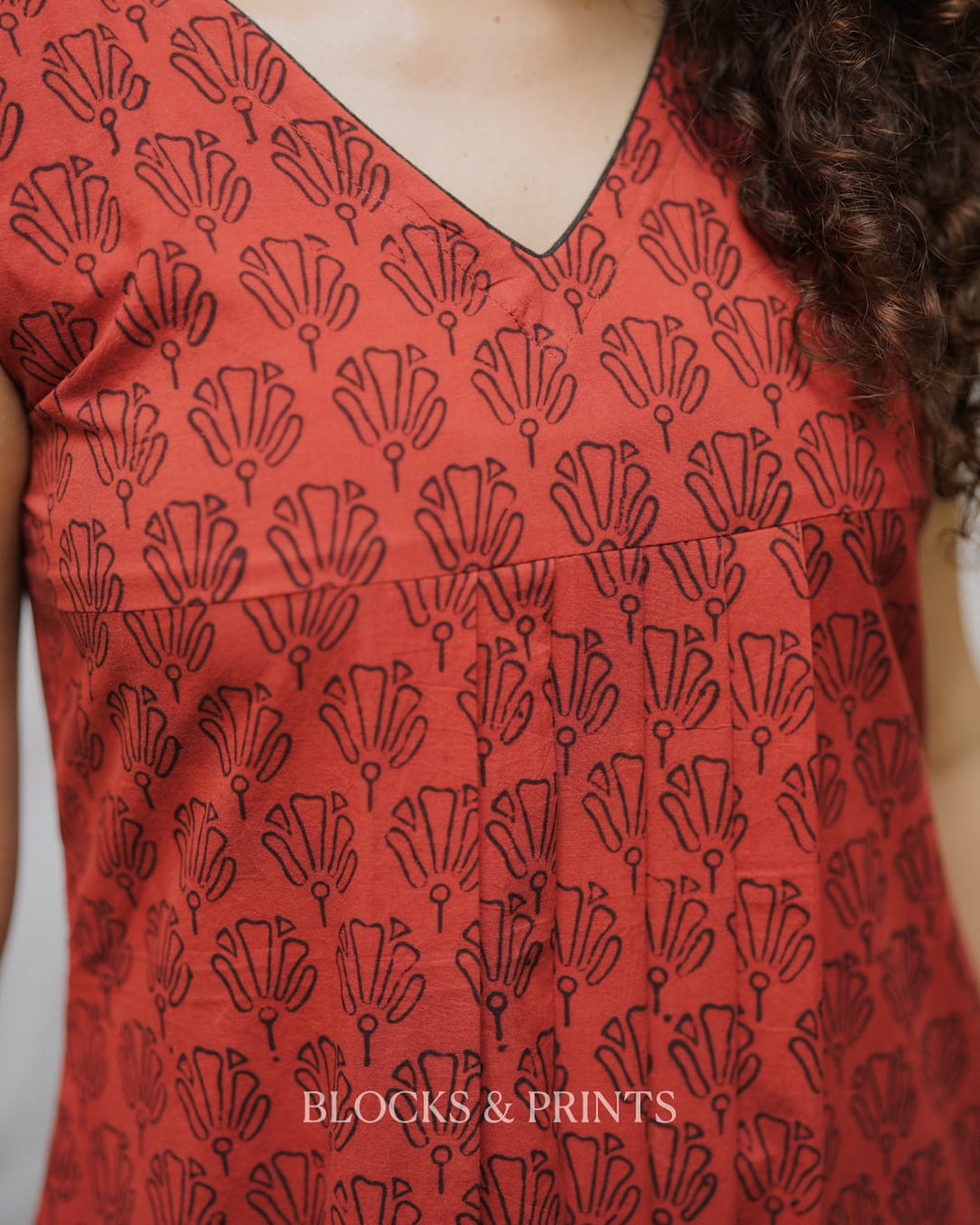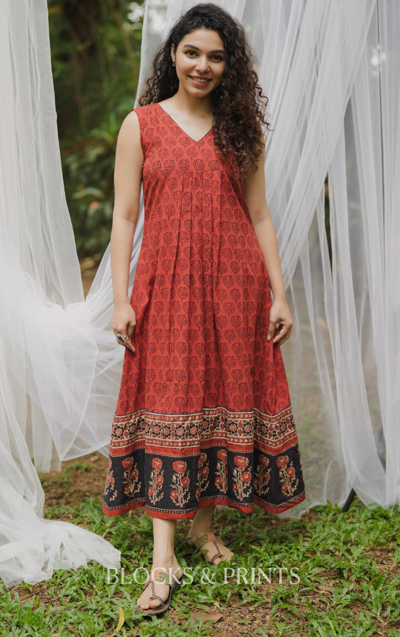 Designer Ajrakh-printed sleeveless A-line dress with V-neckline. The neckline is highlighted with piping for added detailing. Pleats are added at the yoke for an elegant finish. Designer prints on the Daman area.
