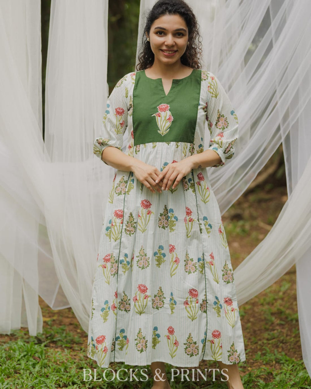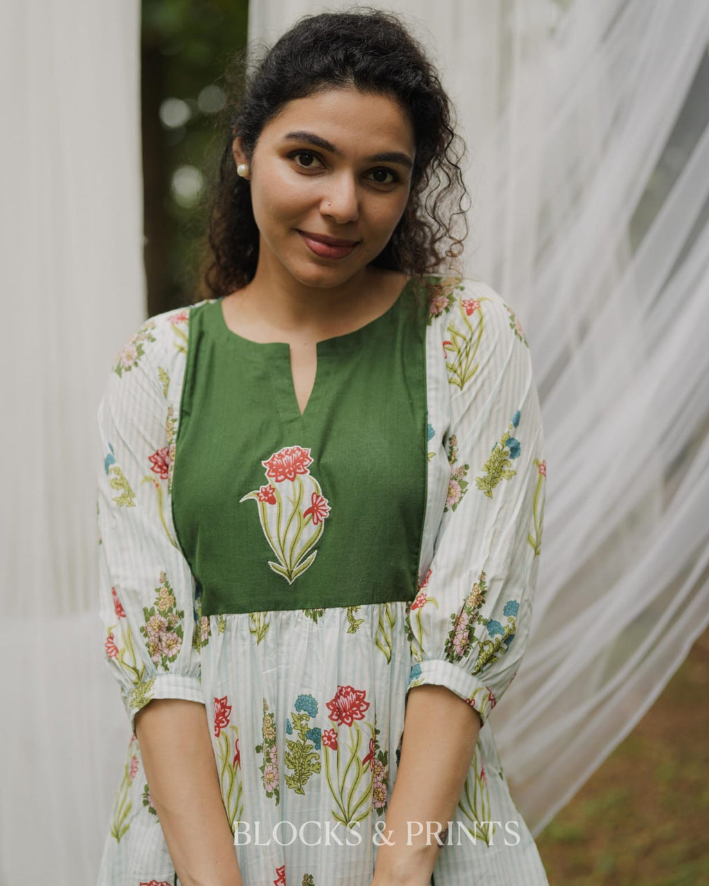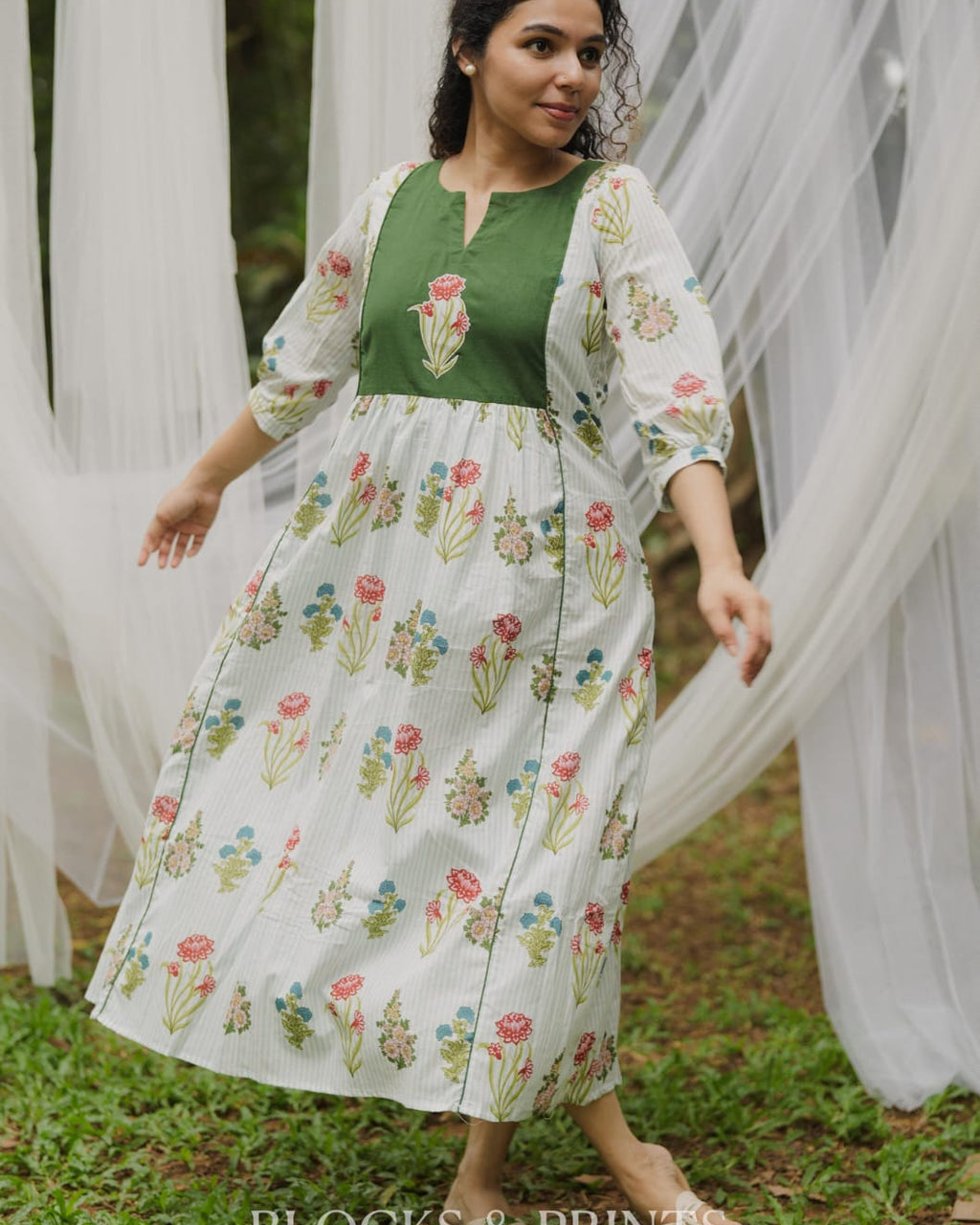 Printed Cotton A-Line dress with Round Slit V neck. Cotton patch on yoke with Embroidery floral applique work. Gathers on waist and piping on the yoke and center panel to highlight the dress. Puff on end of the sleeves.