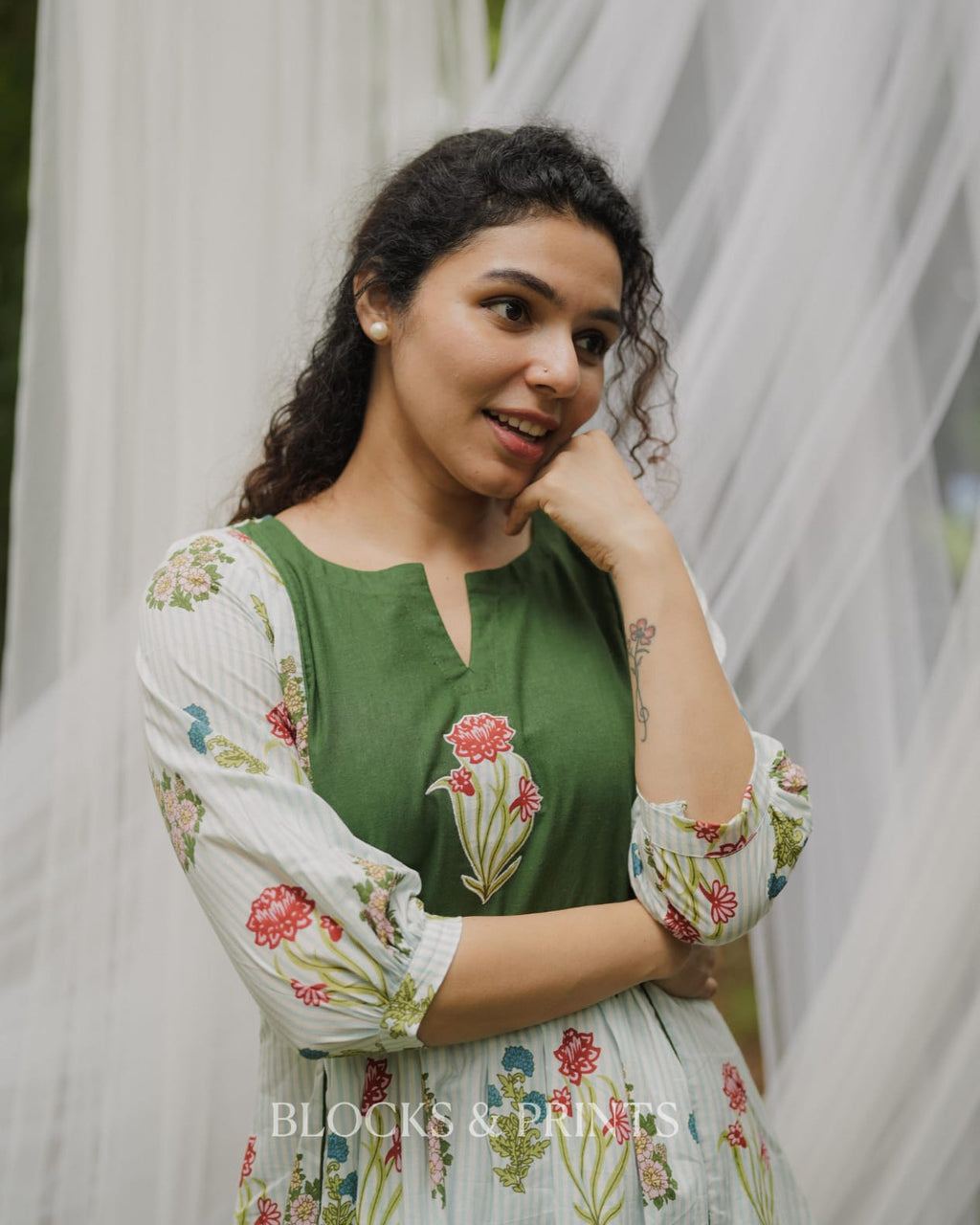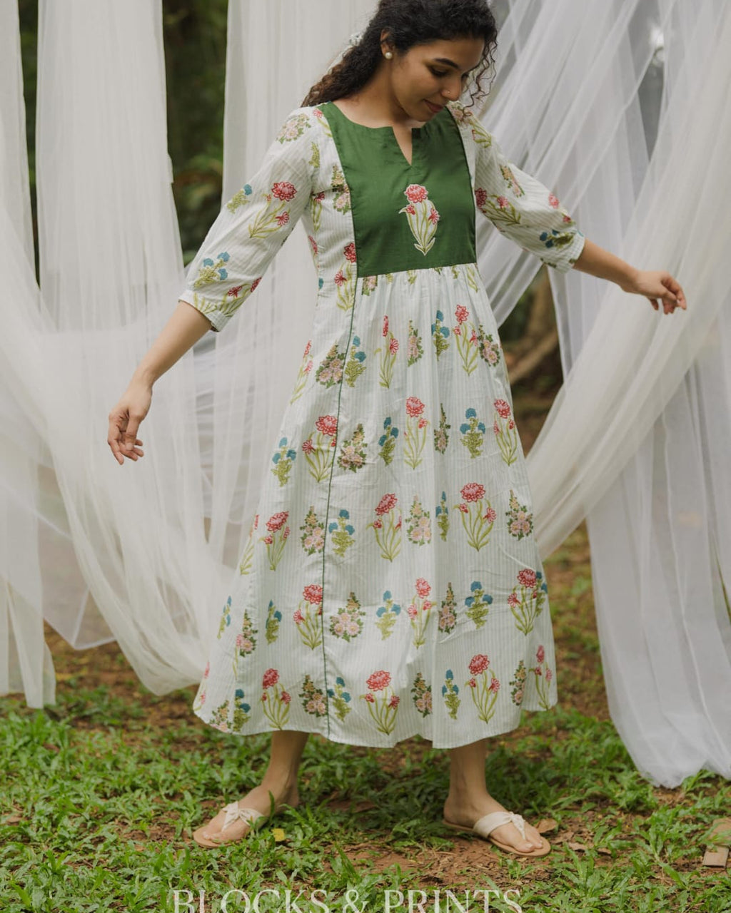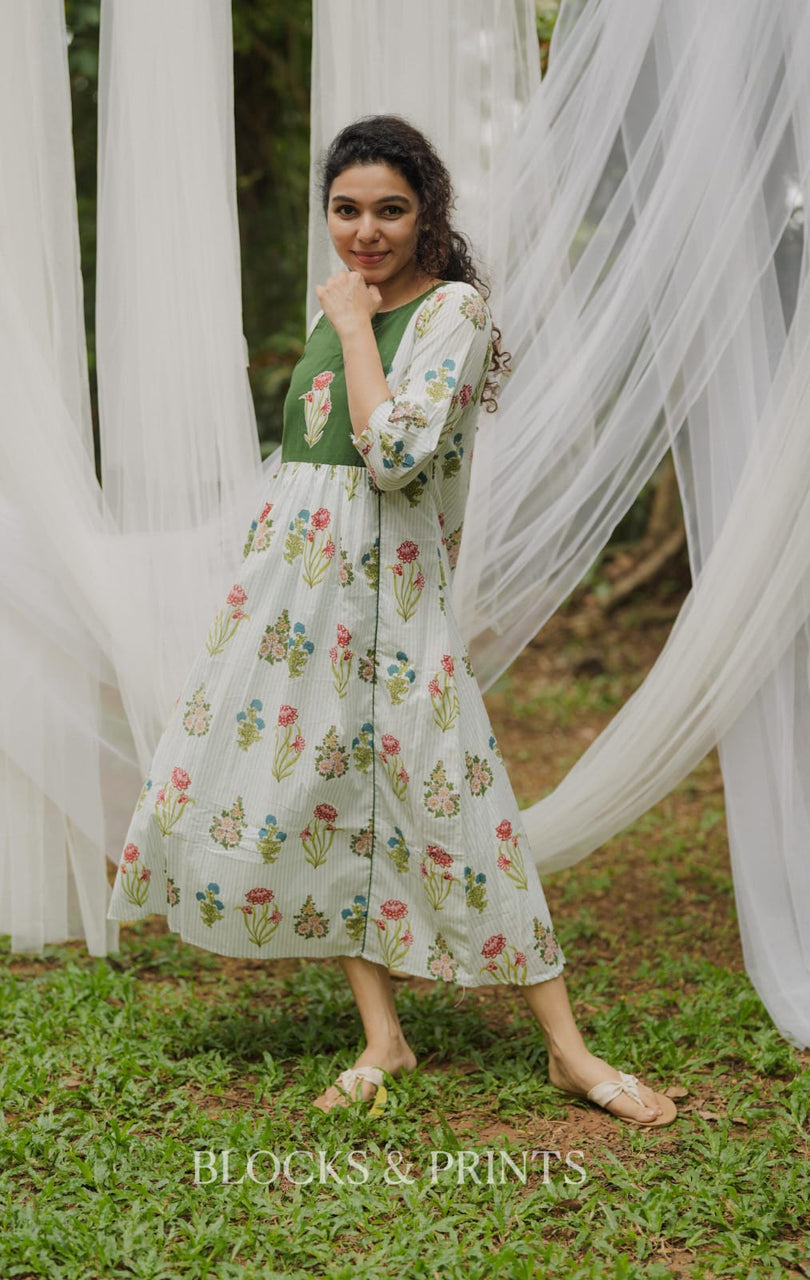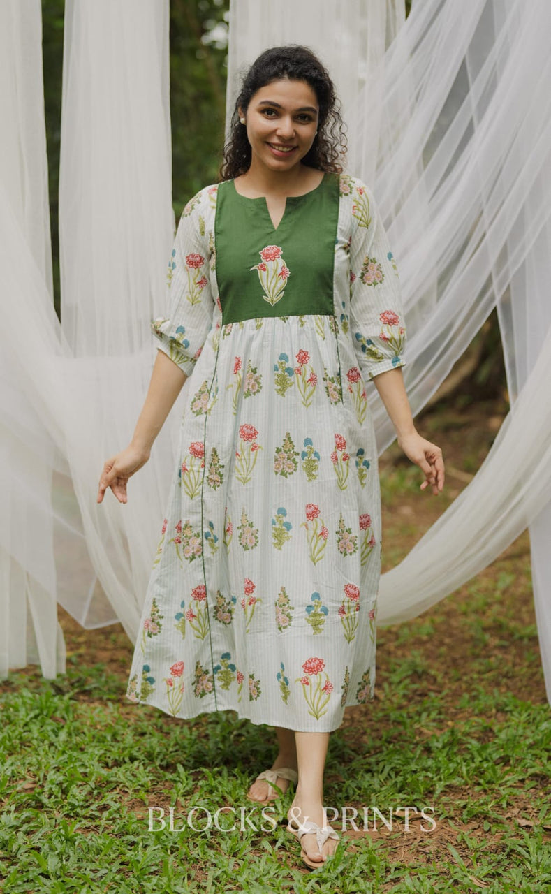 Printed Cotton A-Line dress with Round Slit V neck. Cotton patch on yoke with Embroidery floral applique work. Gathers on waist and piping on the yoke and center panel to highlight the dress. Puff on end of the sleeves.