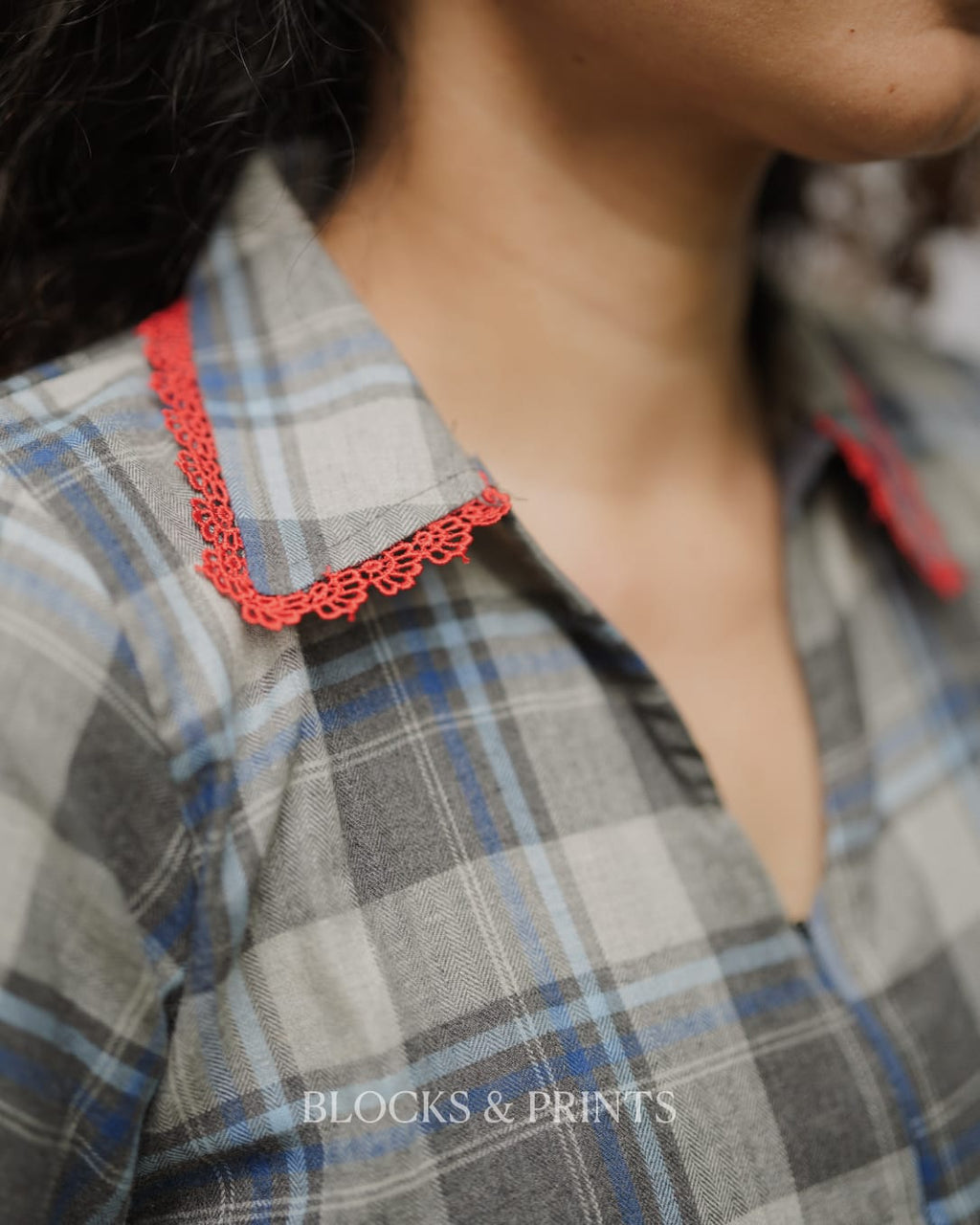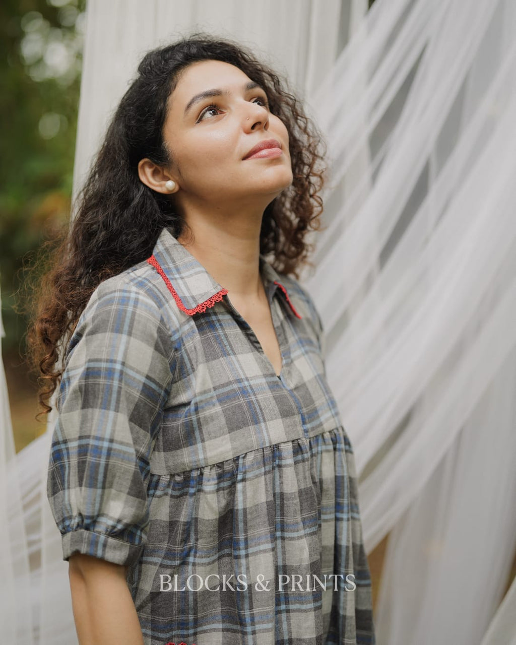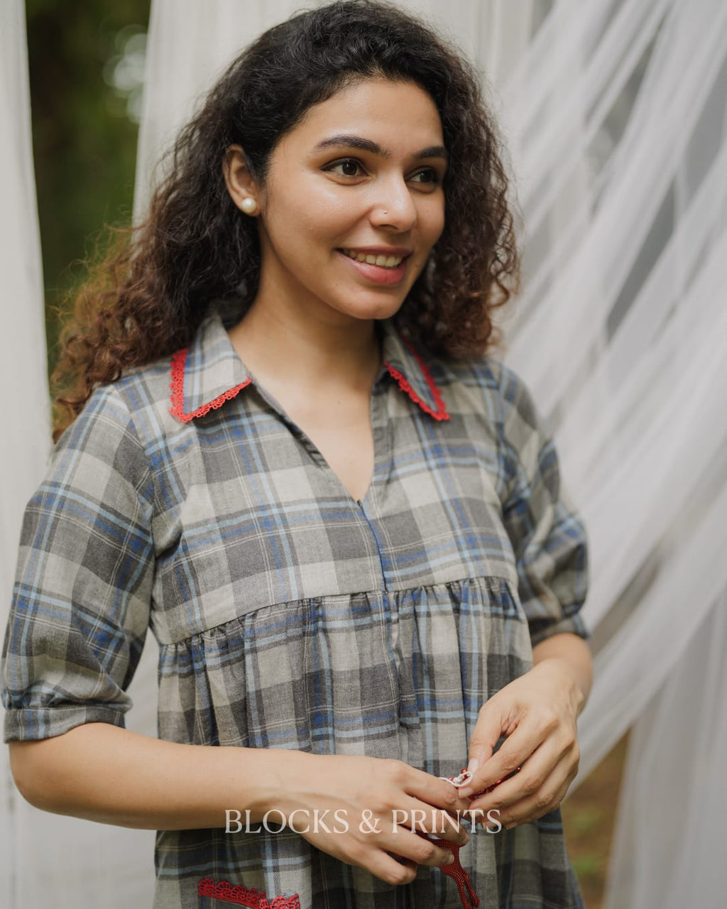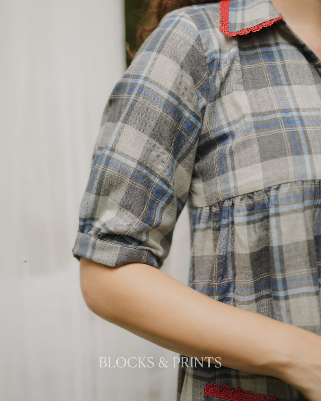 High-quality soft cotton A-line dress with checkered pattern with Collar neckline. Pocket on one side. Lace added on collar and pocket for detailing. Gathers at the yoke. Puff at the sleeves end.