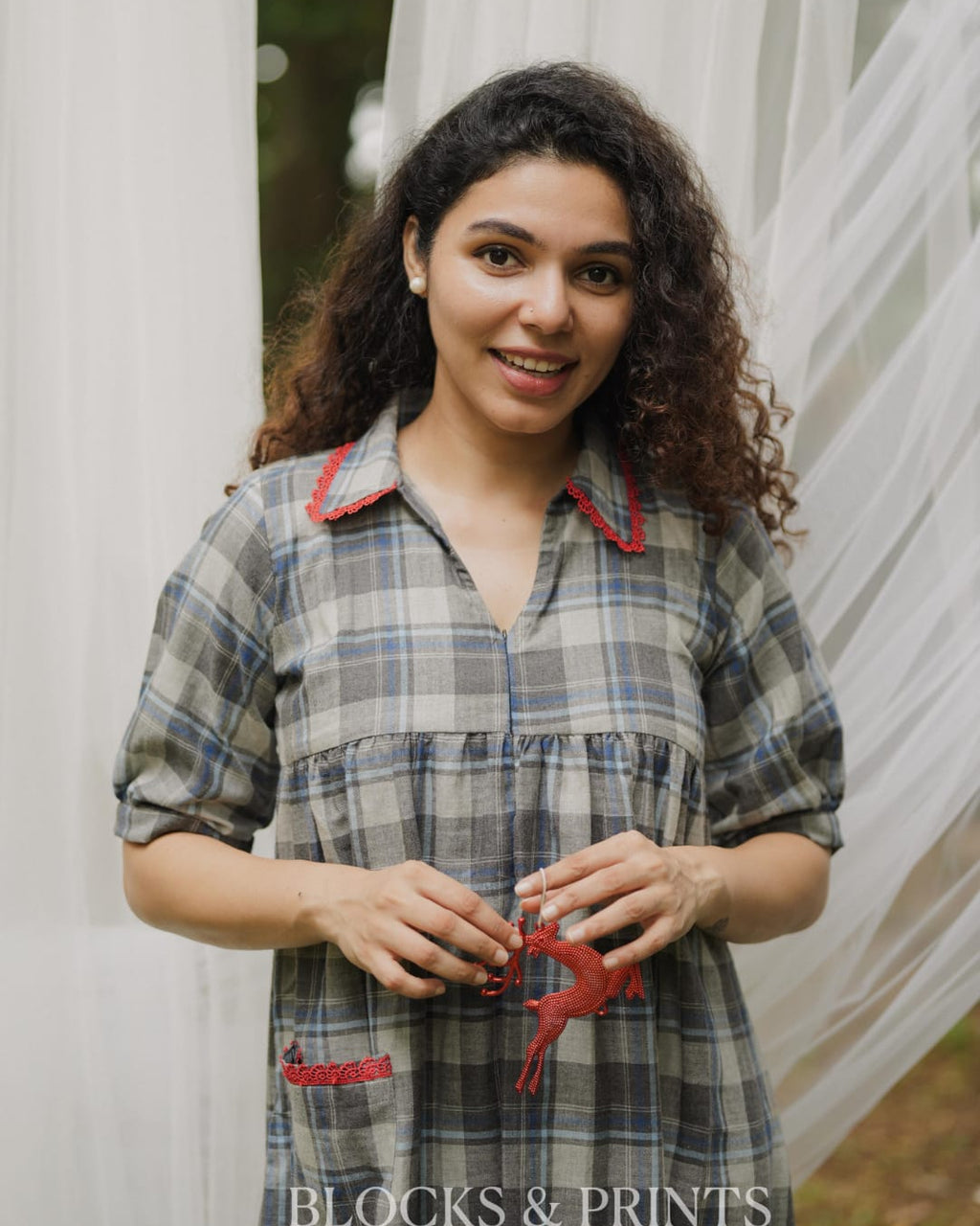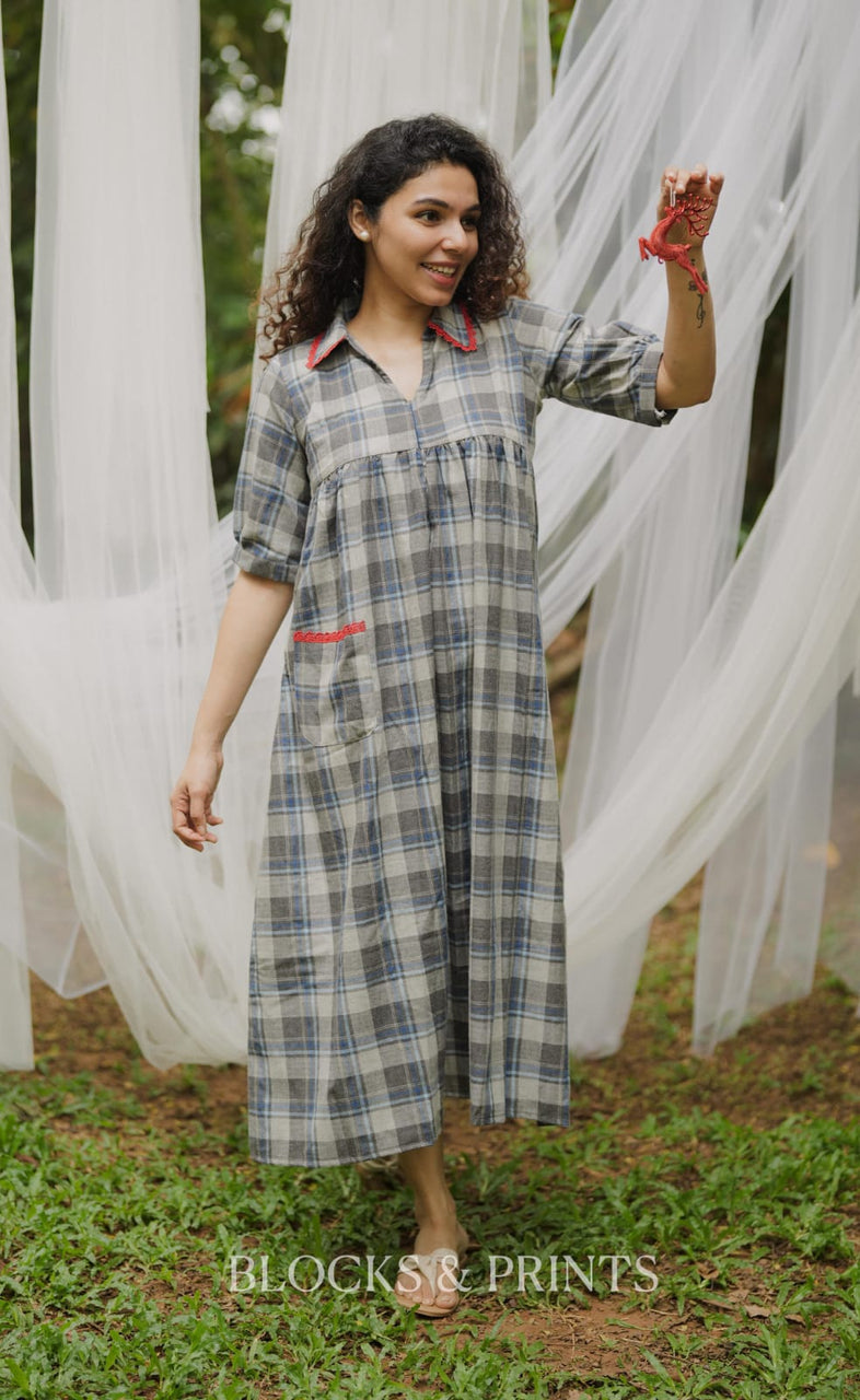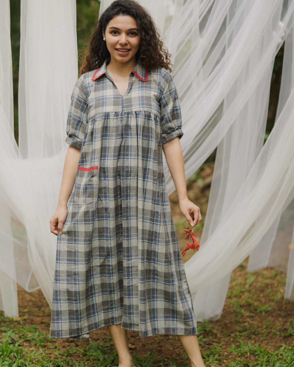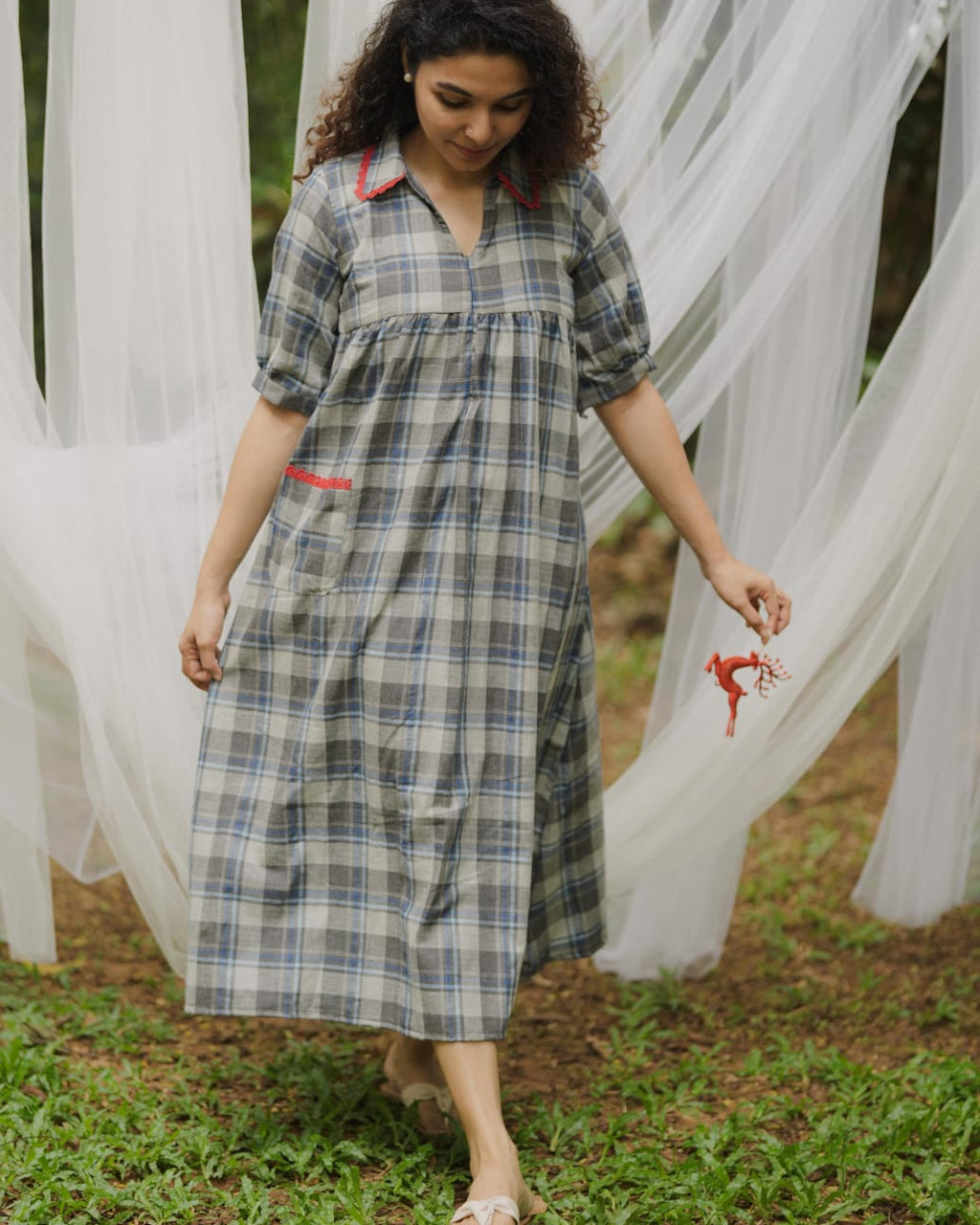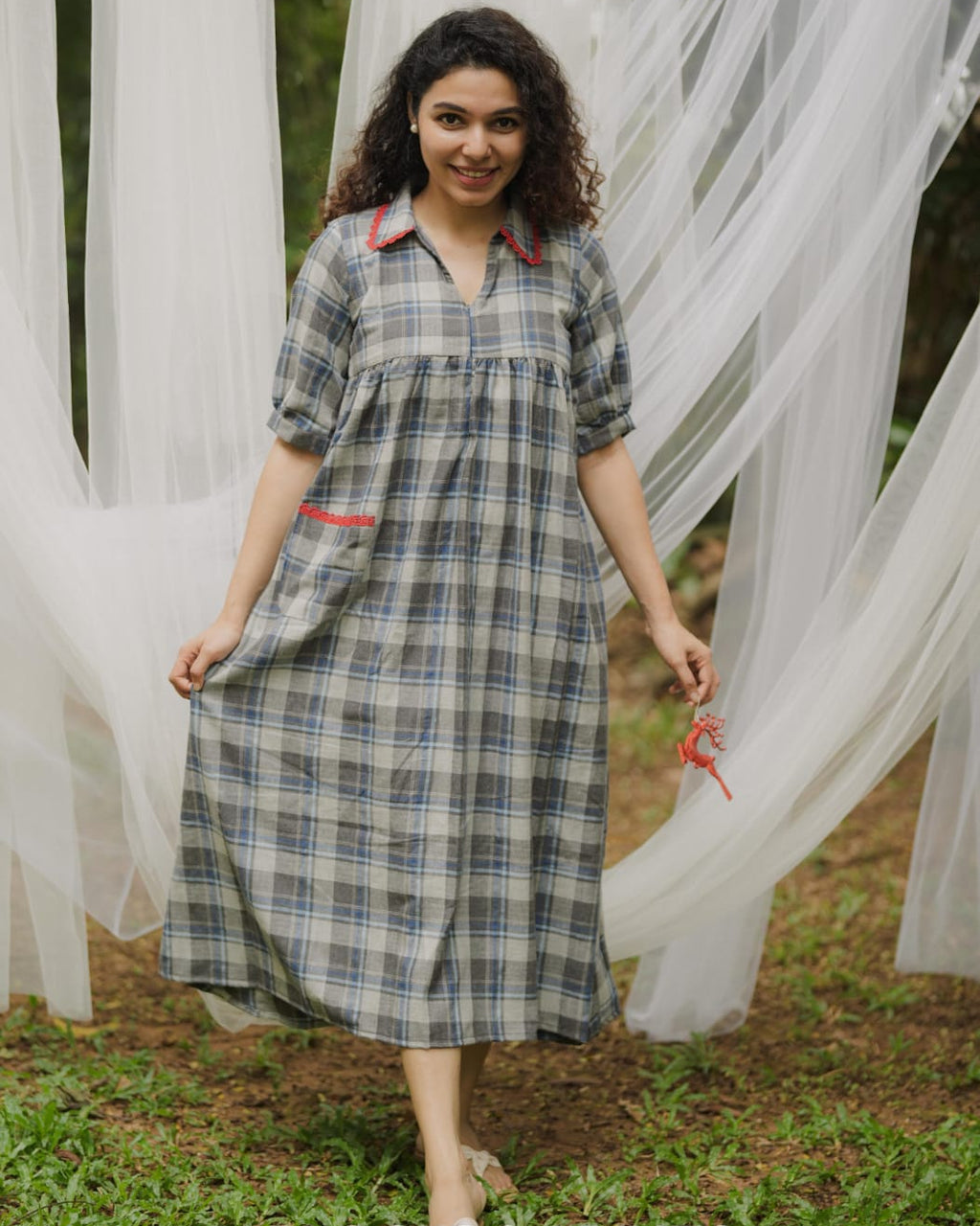 High-quality soft cotton A-line dress with checkered pattern with Collar neckline. Pocket on one side. Lace added on collar and pocket for detailing. Gathers at the yoke. Puff at the sleeves end.