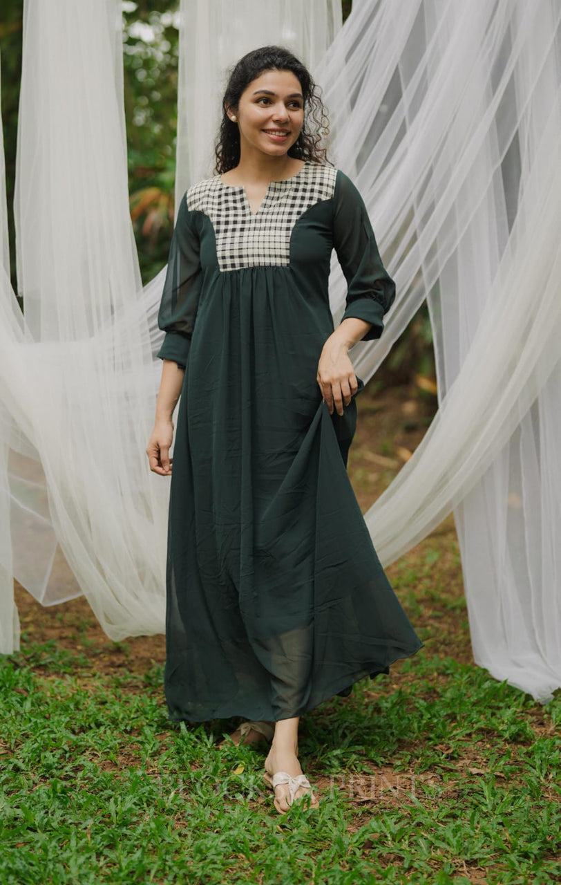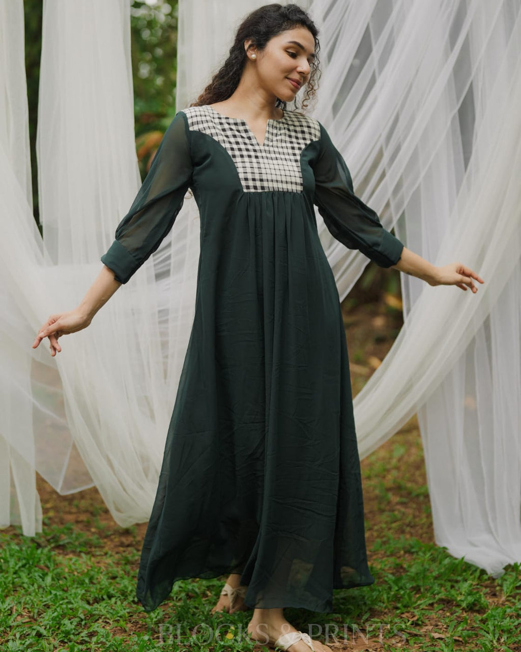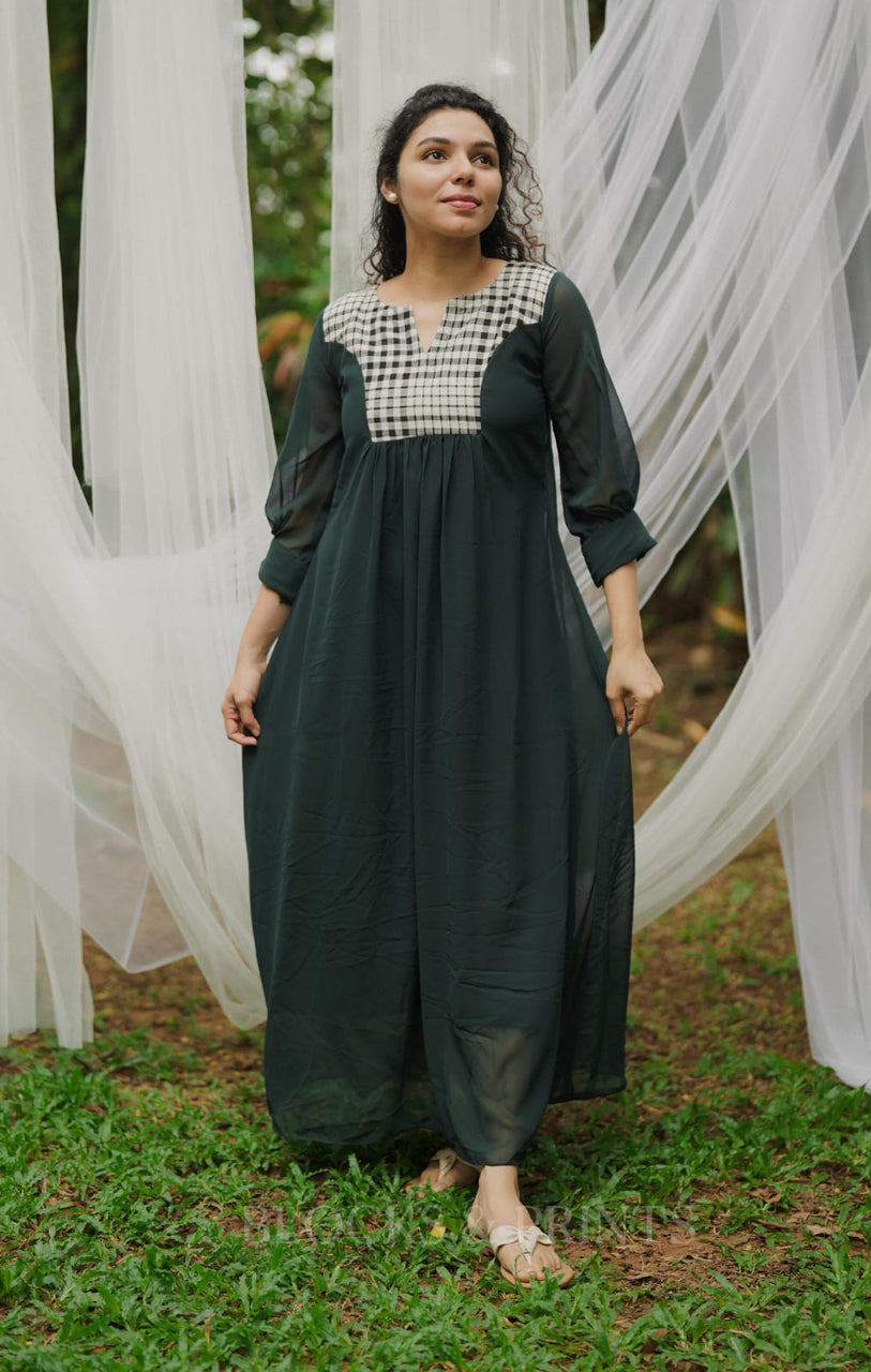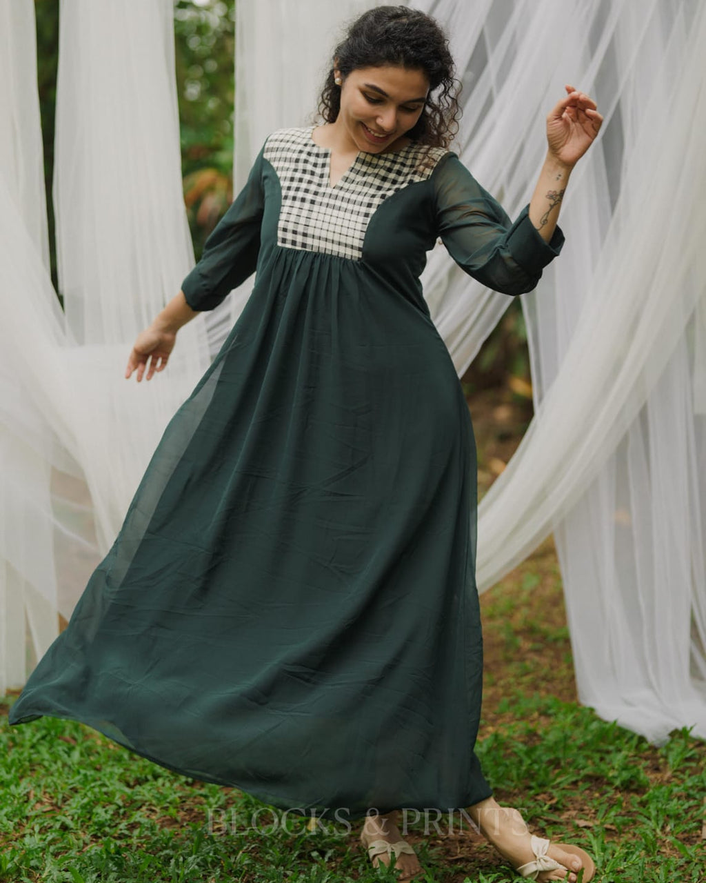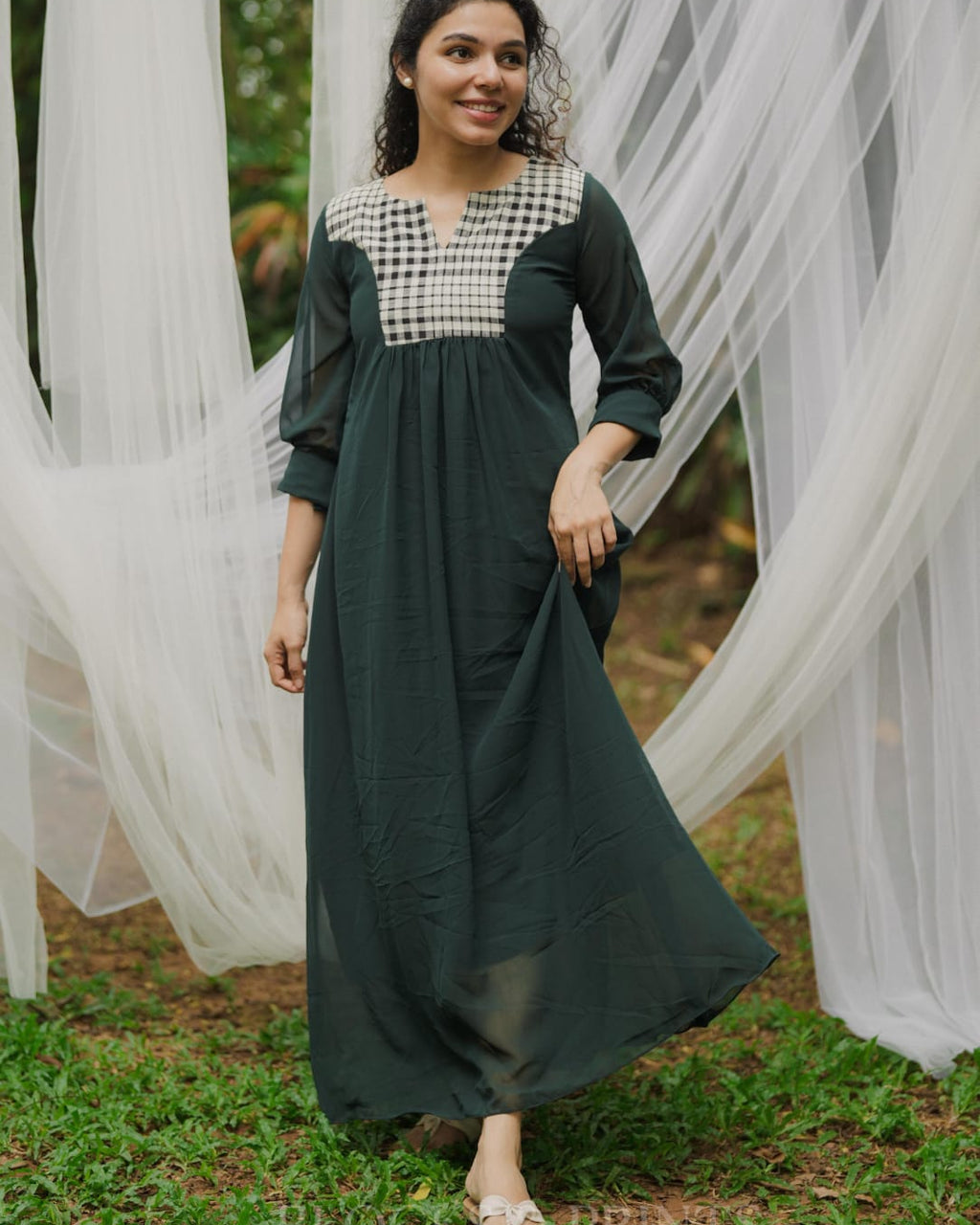 Georgette Full length A-line Dress with slit V neck. Soft cotton check patch on yoke and gathers on yoke, and patch on back side with single pleat. Puff at the sleeves end.