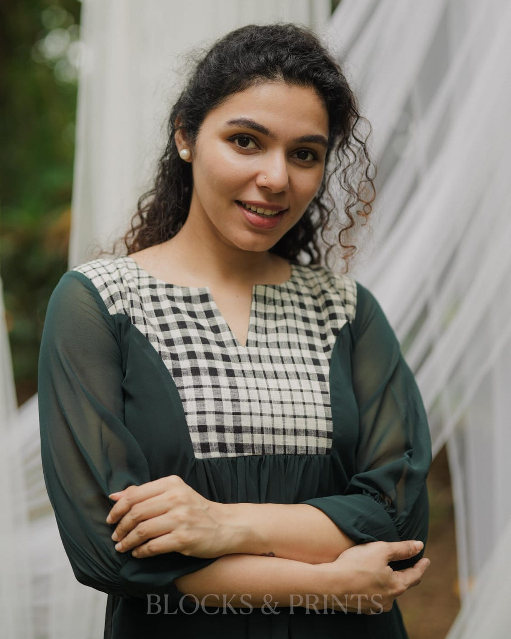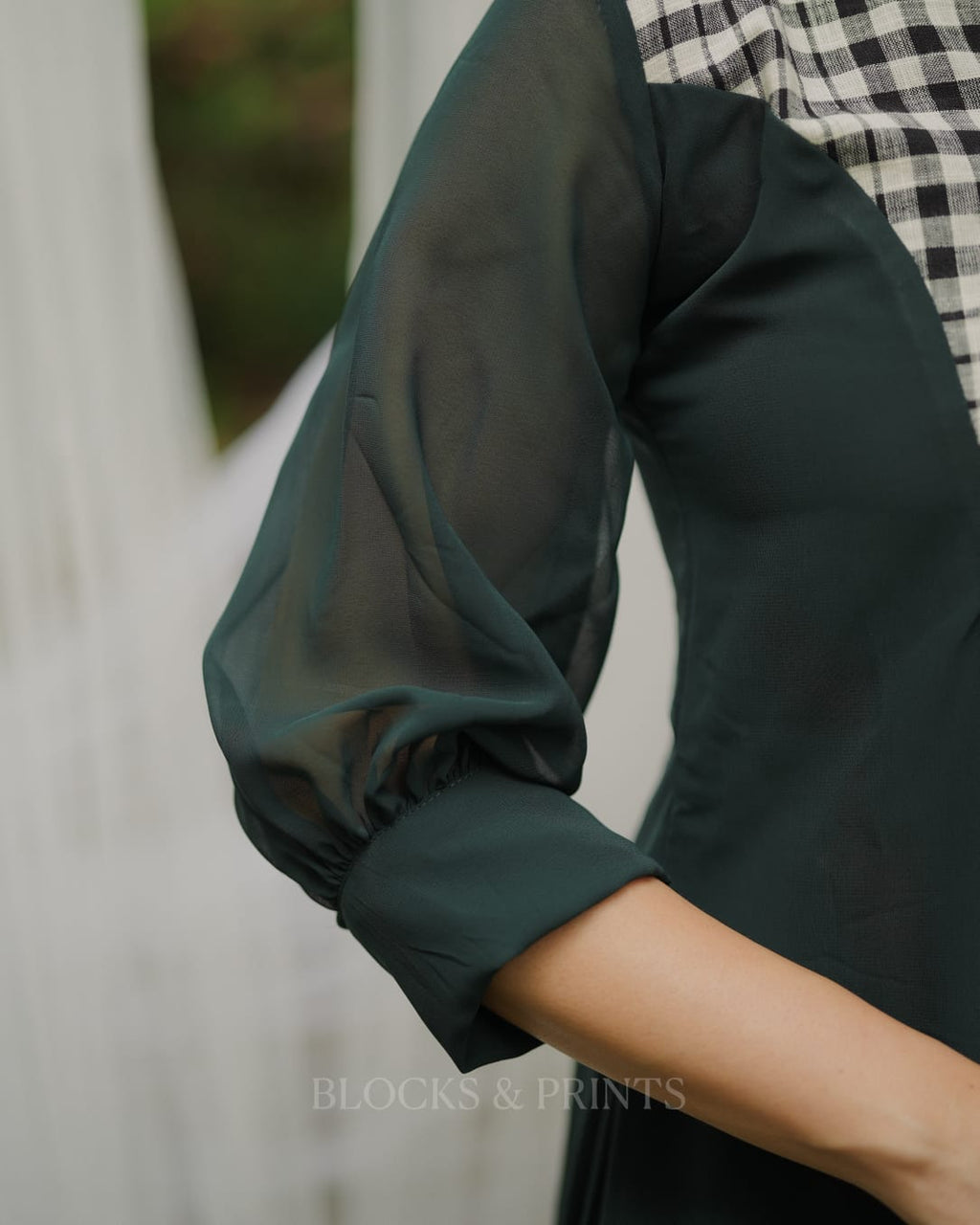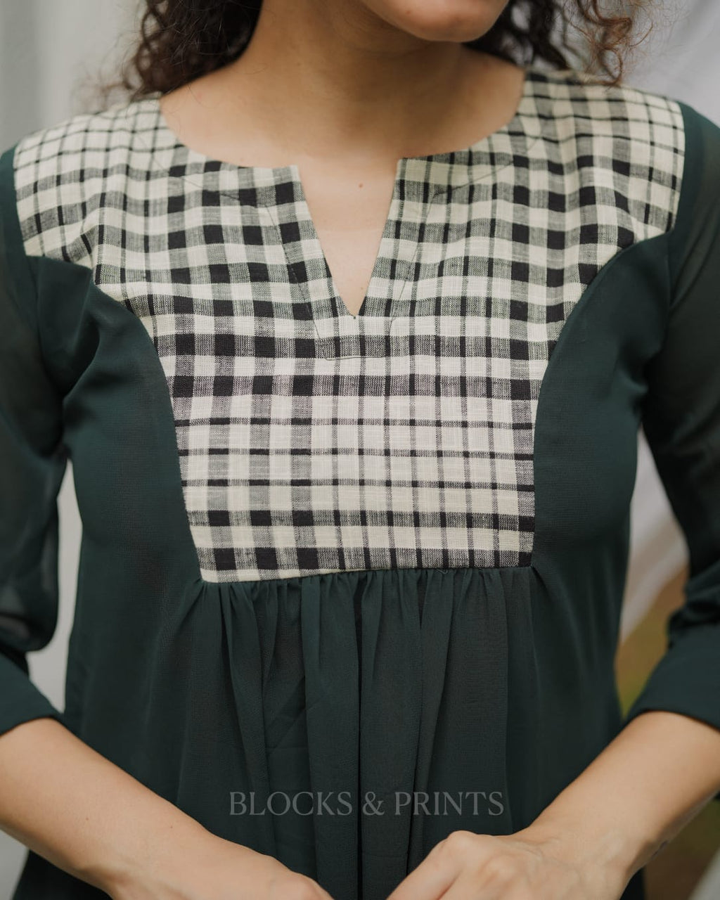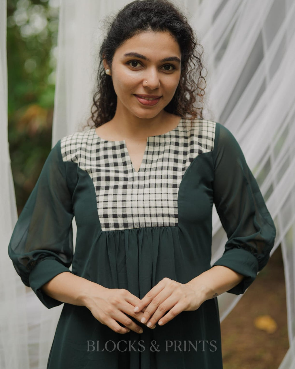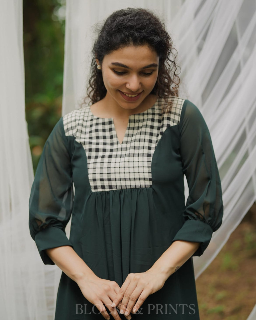 Georgette Full length A-line Dress with slit V neck. Soft cotton check patch on yoke and gathers on yoke, and patch on back side with single pleat. Puff at the sleeves end.