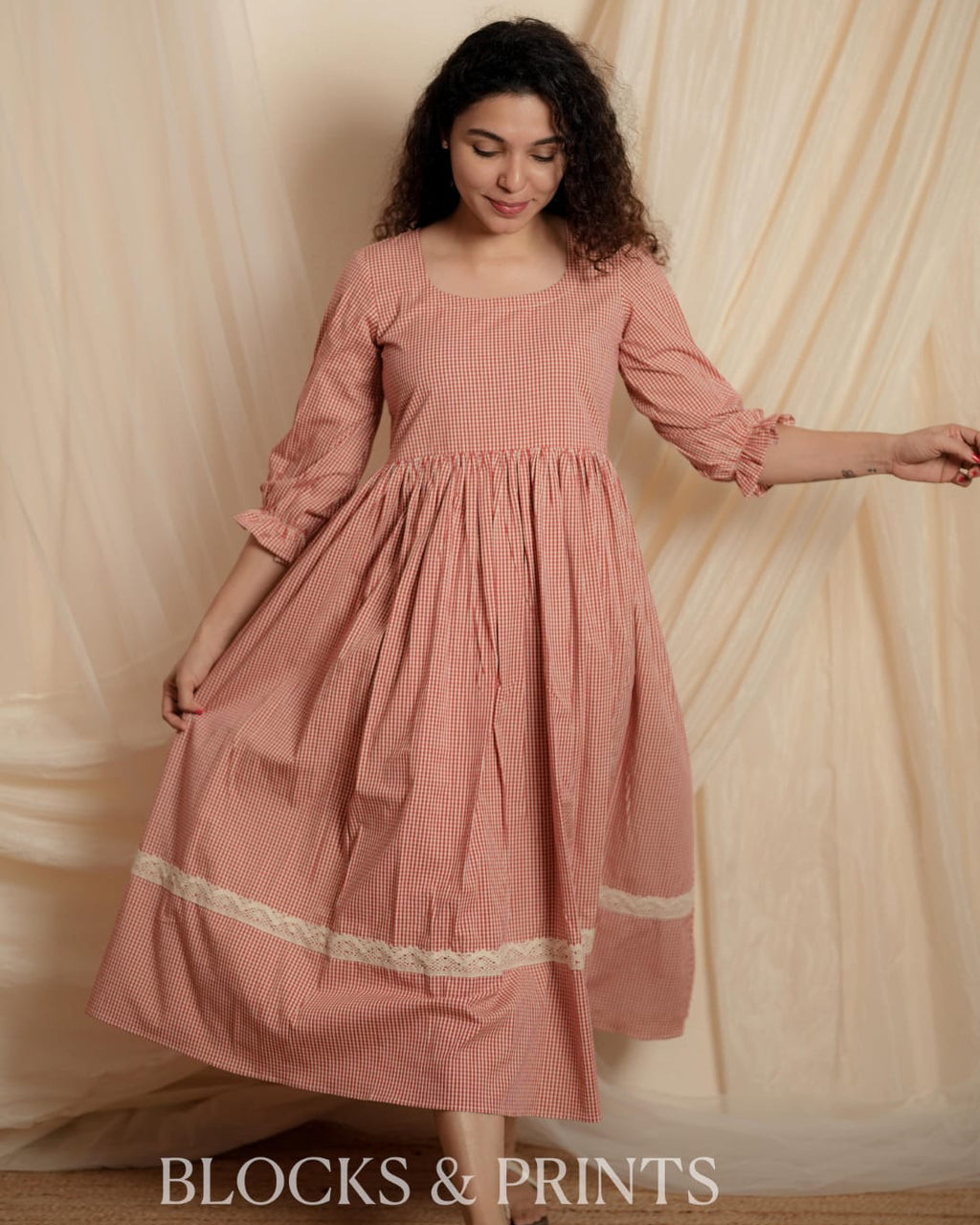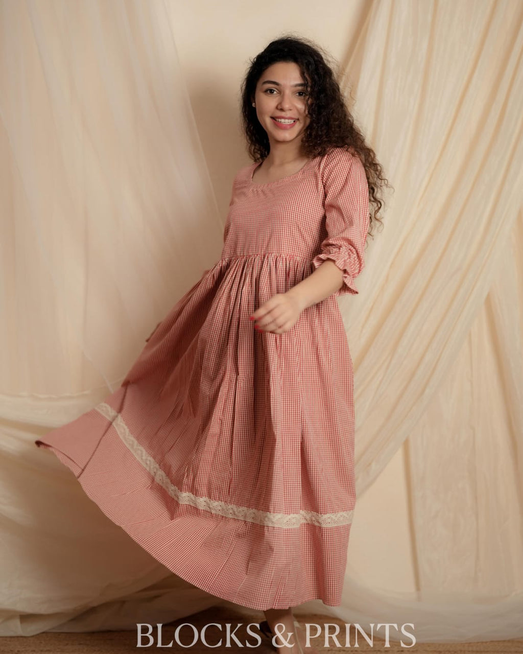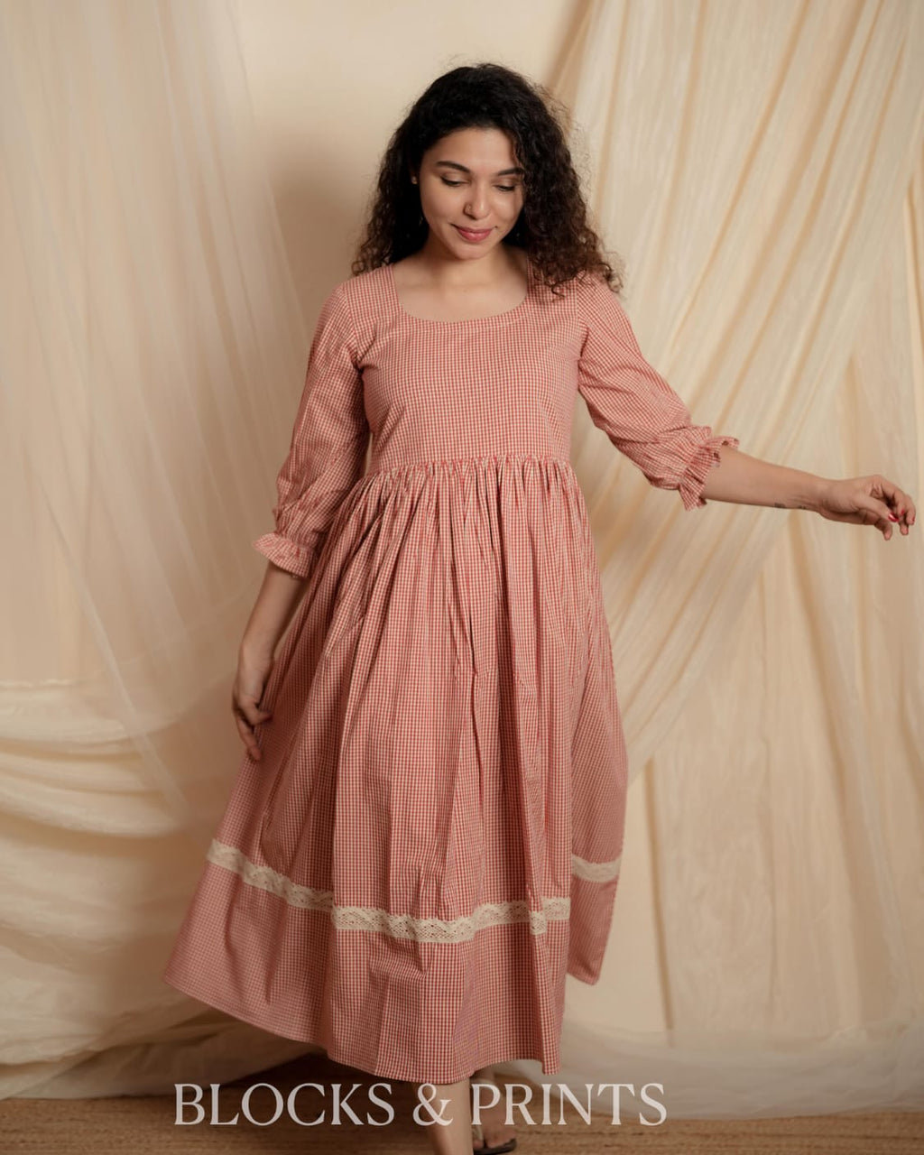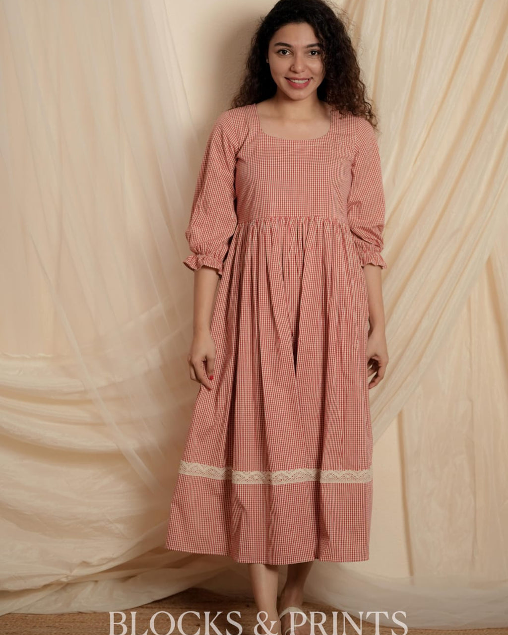 High-quality soft cotton A-line dress with a round neck and checkered pattern. Gathers at the waist provide a flattering fit, while lace on the motif adds a stylish highlight. The sleeves are finished with puff and ruffle detailing at the ends.