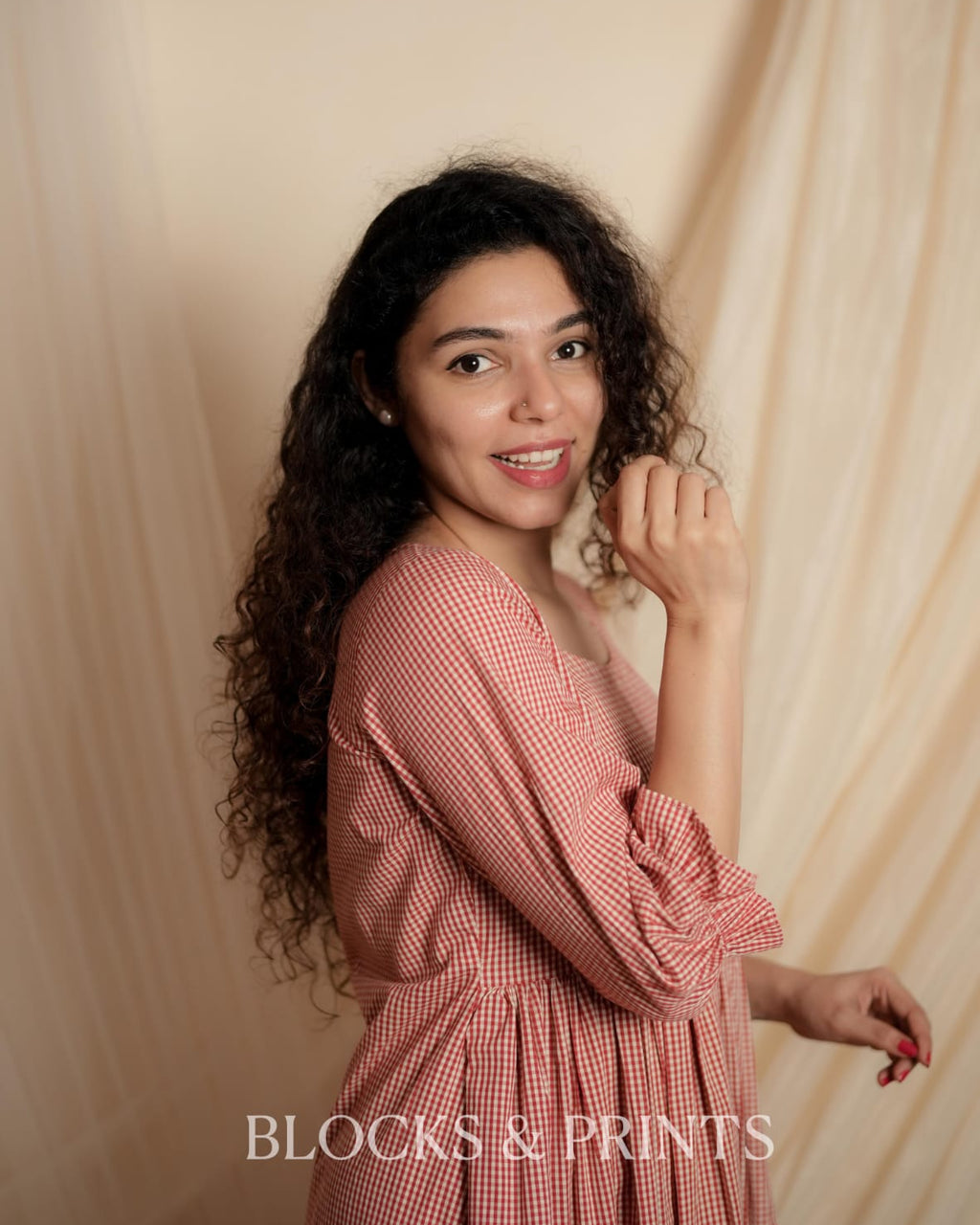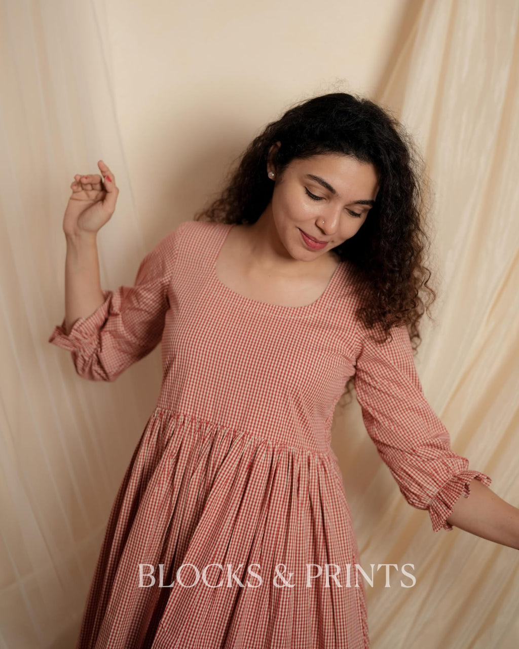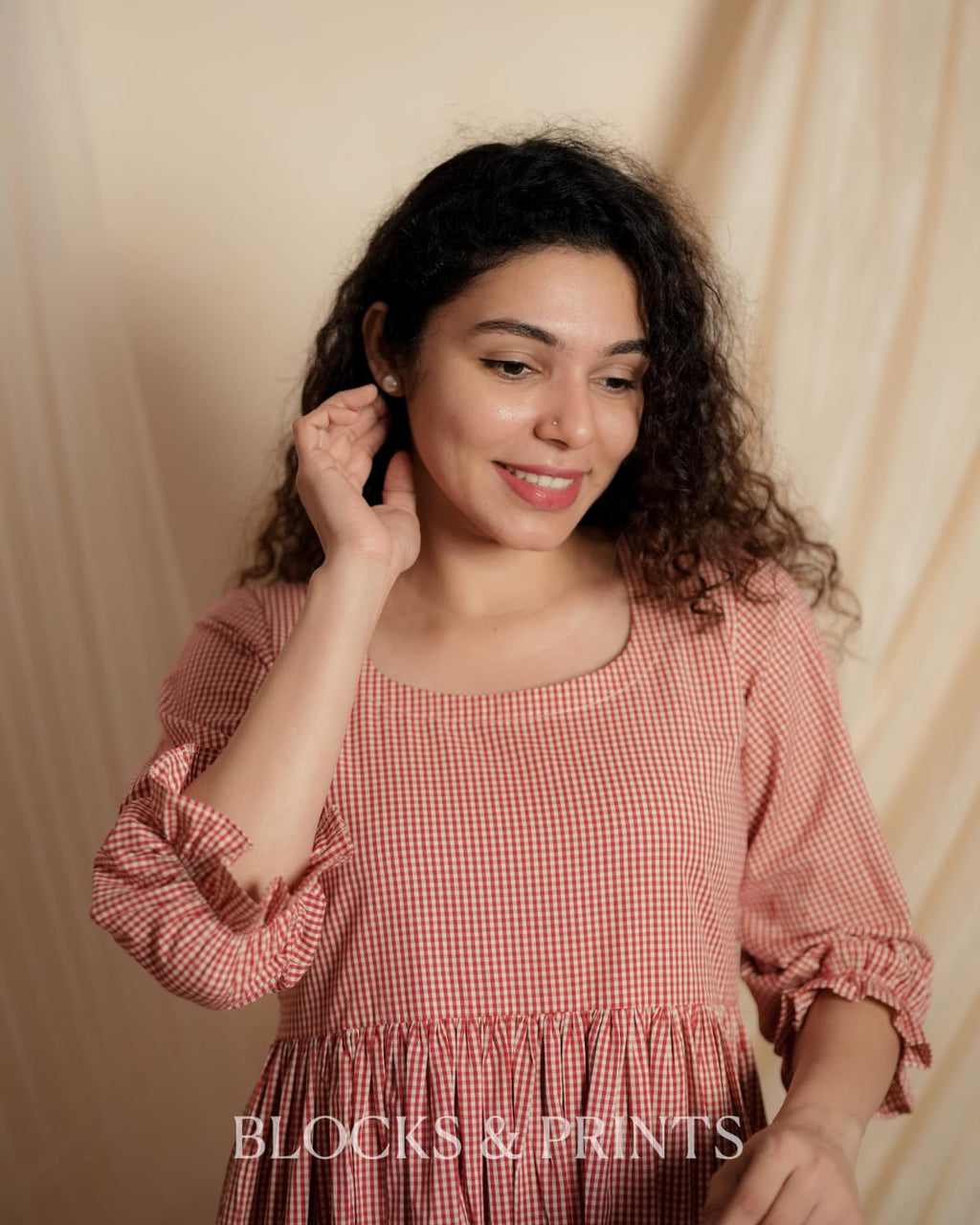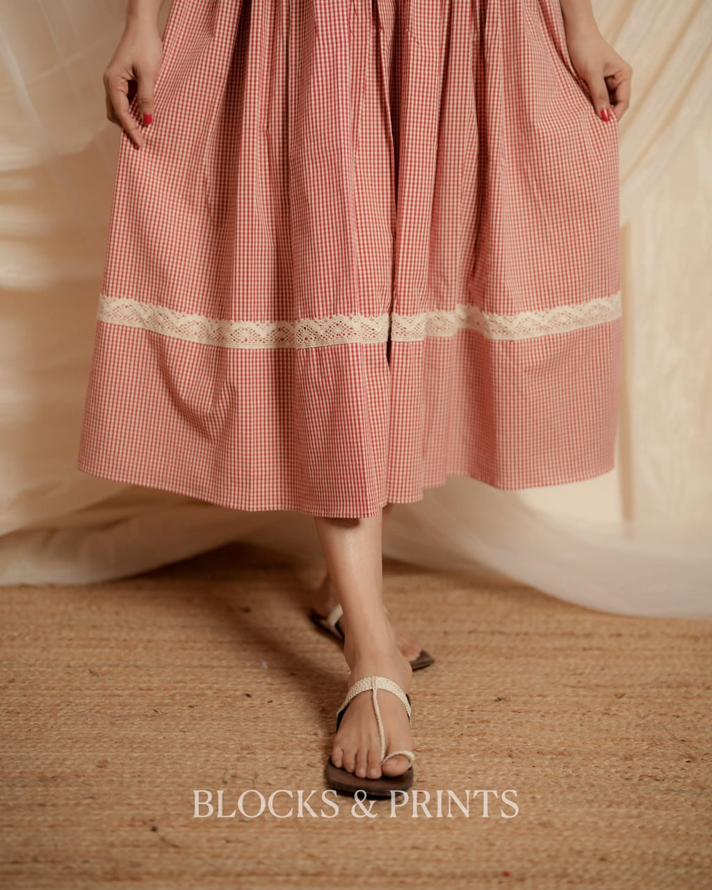 High-quality soft cotton A-line dress with a round neck and checkered pattern. Gathers at the waist provide a flattering fit, while lace on the motif adds a stylish highlight. The sleeves are finished with puff and ruffle detailing at the ends.