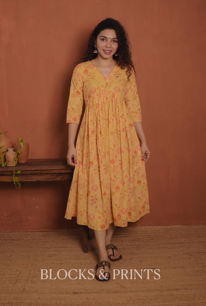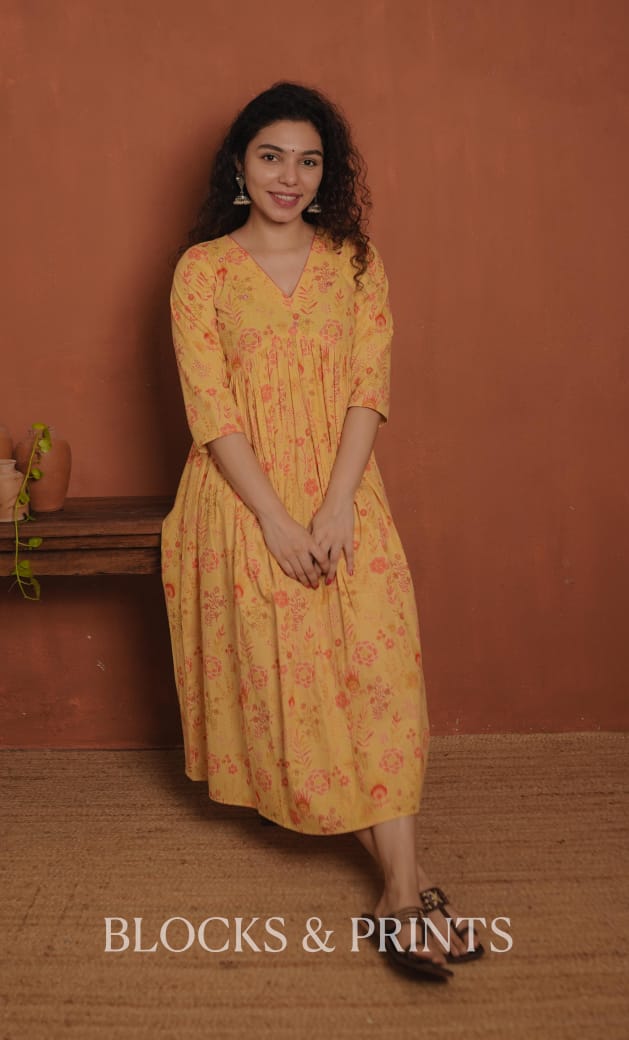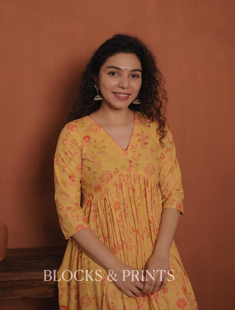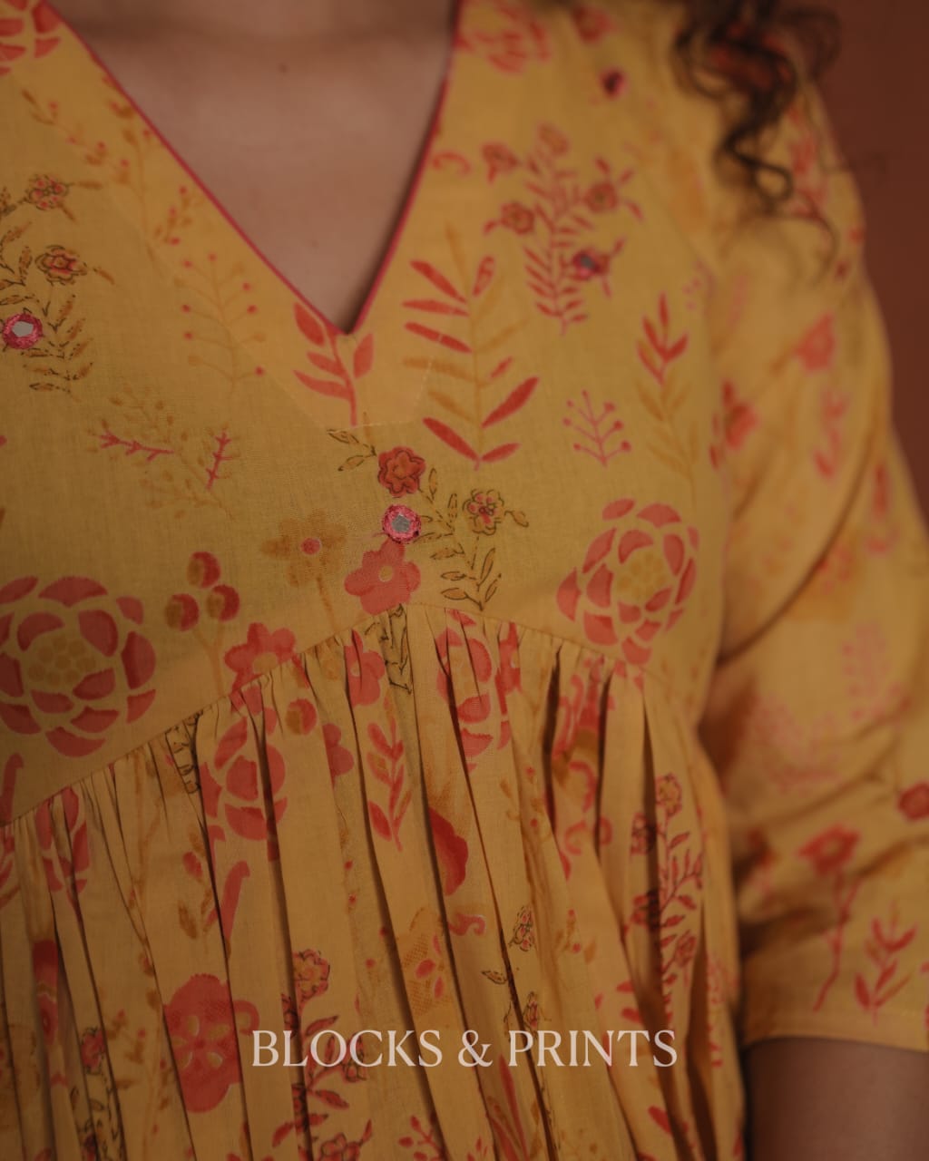 Floral Printed Cotton Alia cut A-Line Kurthi with V neck. Piping on neck and Embroidery Mirror work on yoke for detailing. Gathers on the yoke.