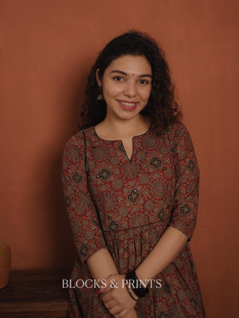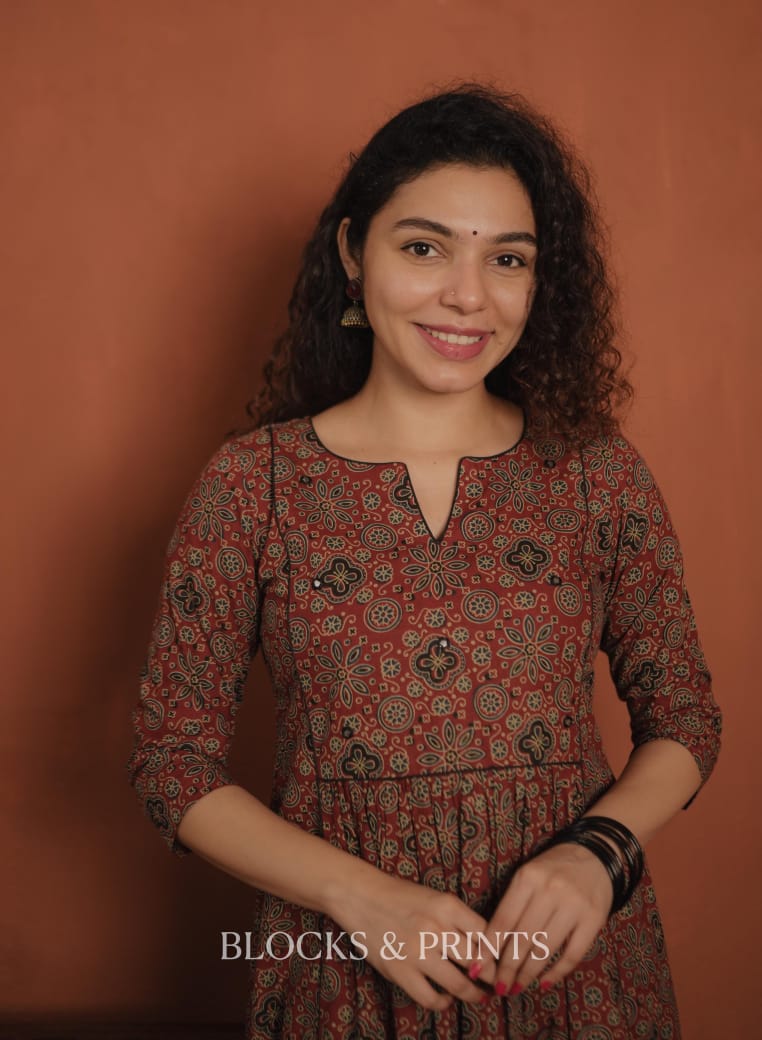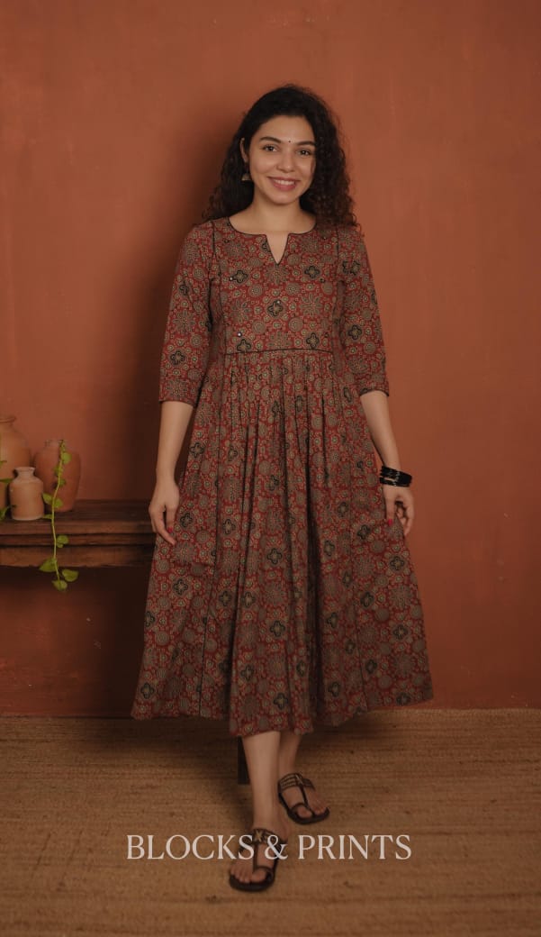 Printed cotton A-line dress with a slit V-neck. Embroidery mirror work added for detailing. Gathers on the waist. Piping given on the yoke and center panel enhance the overall look.