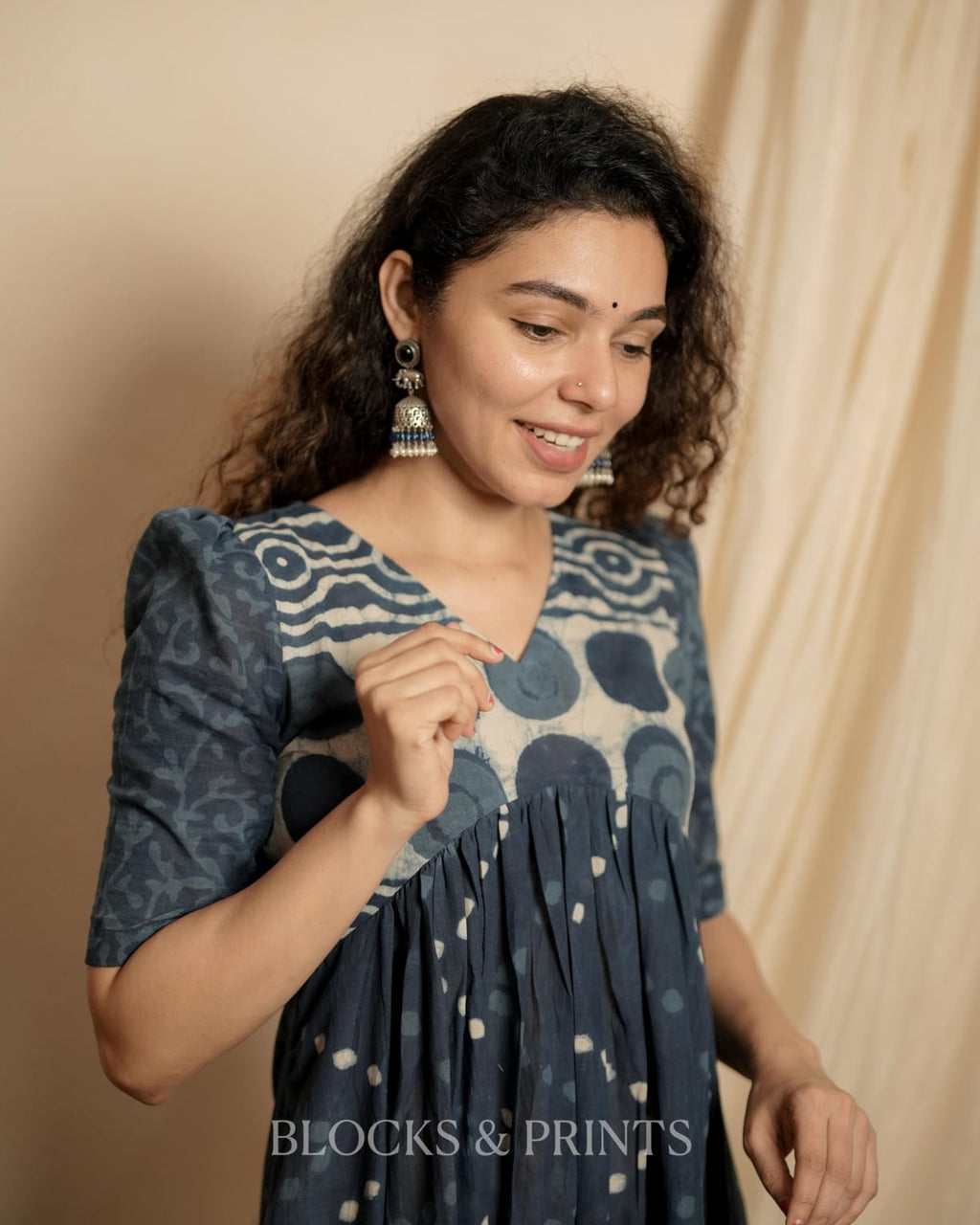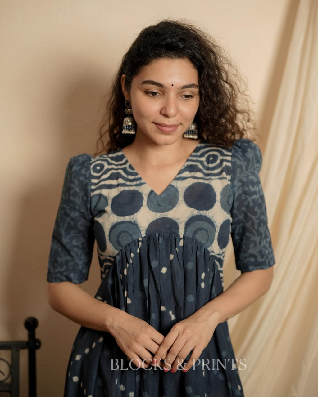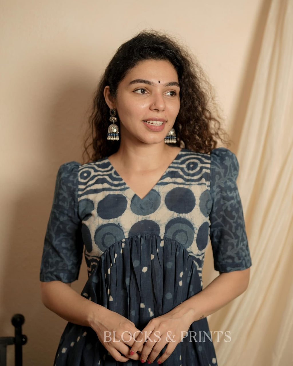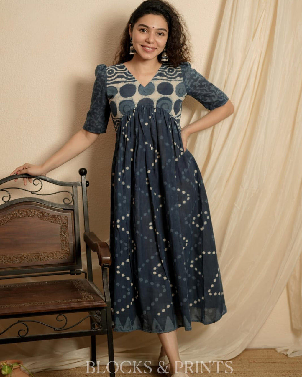 Natural Dyed Indigo printed cotton Alia Cut A Line Dress with V Neck . Small puff with Elbow sleeves