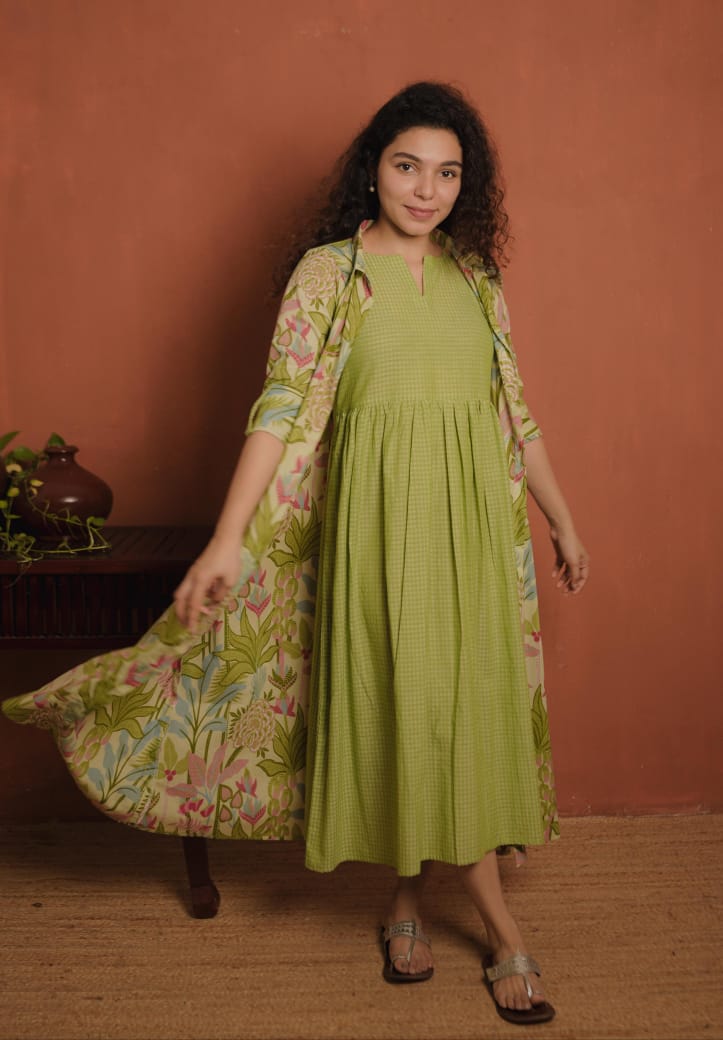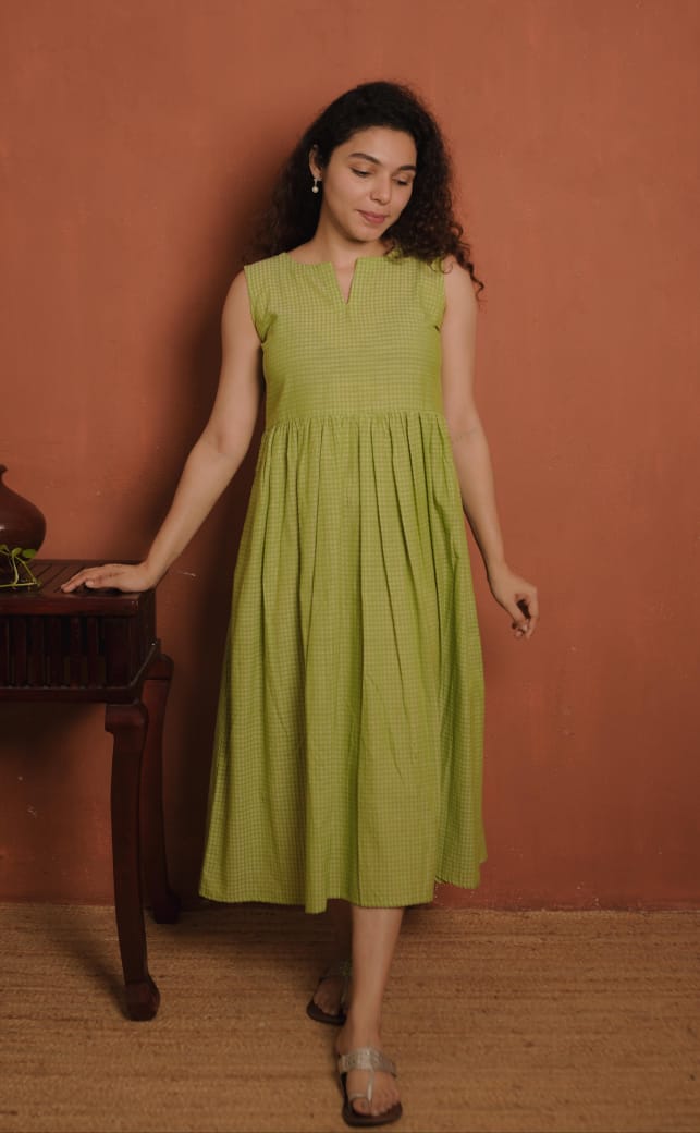 Inner - Handloom Cotton check dress with slit V neck. Gathers on Waist.