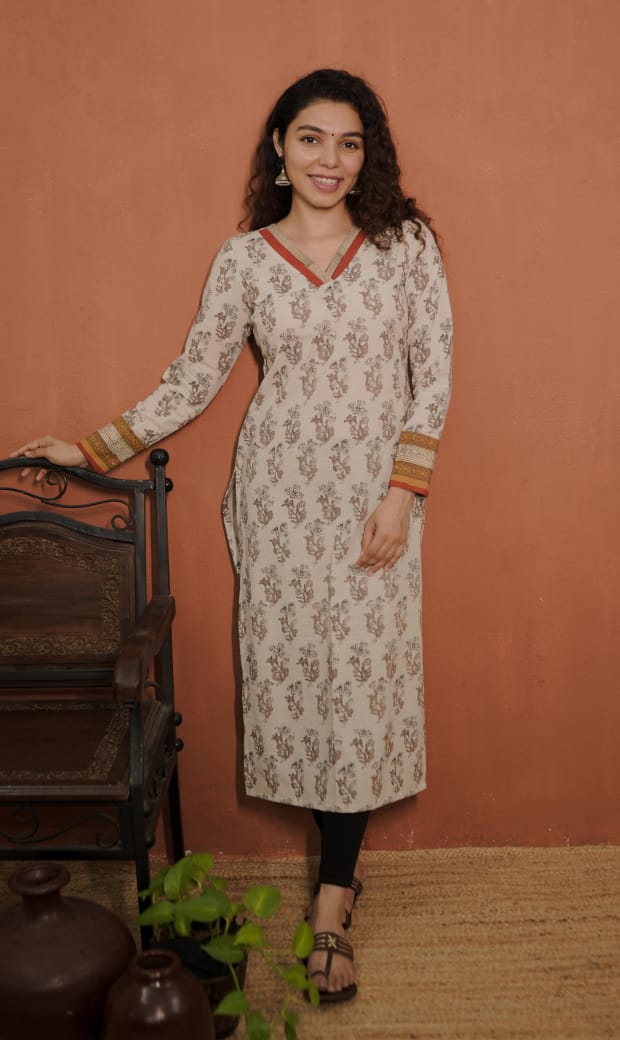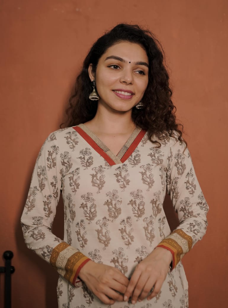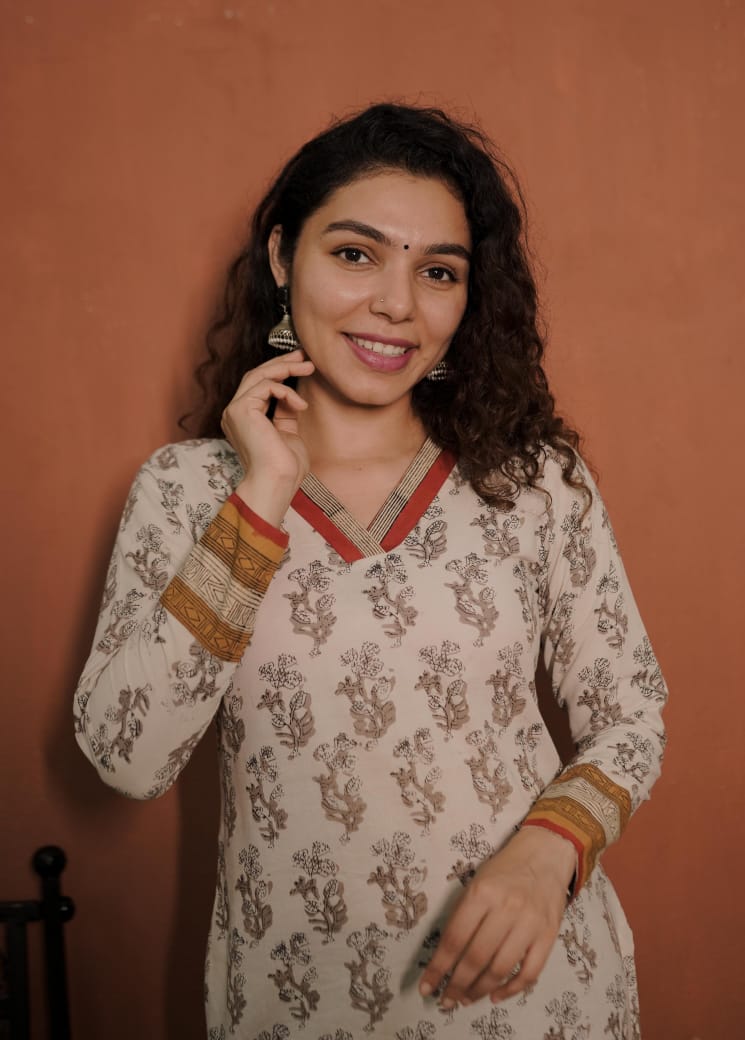 Printed Cotton Slit Kurthi with V Neck. Printed Patch on Neck for Detailing. Printed and Patch on Sleeves End.