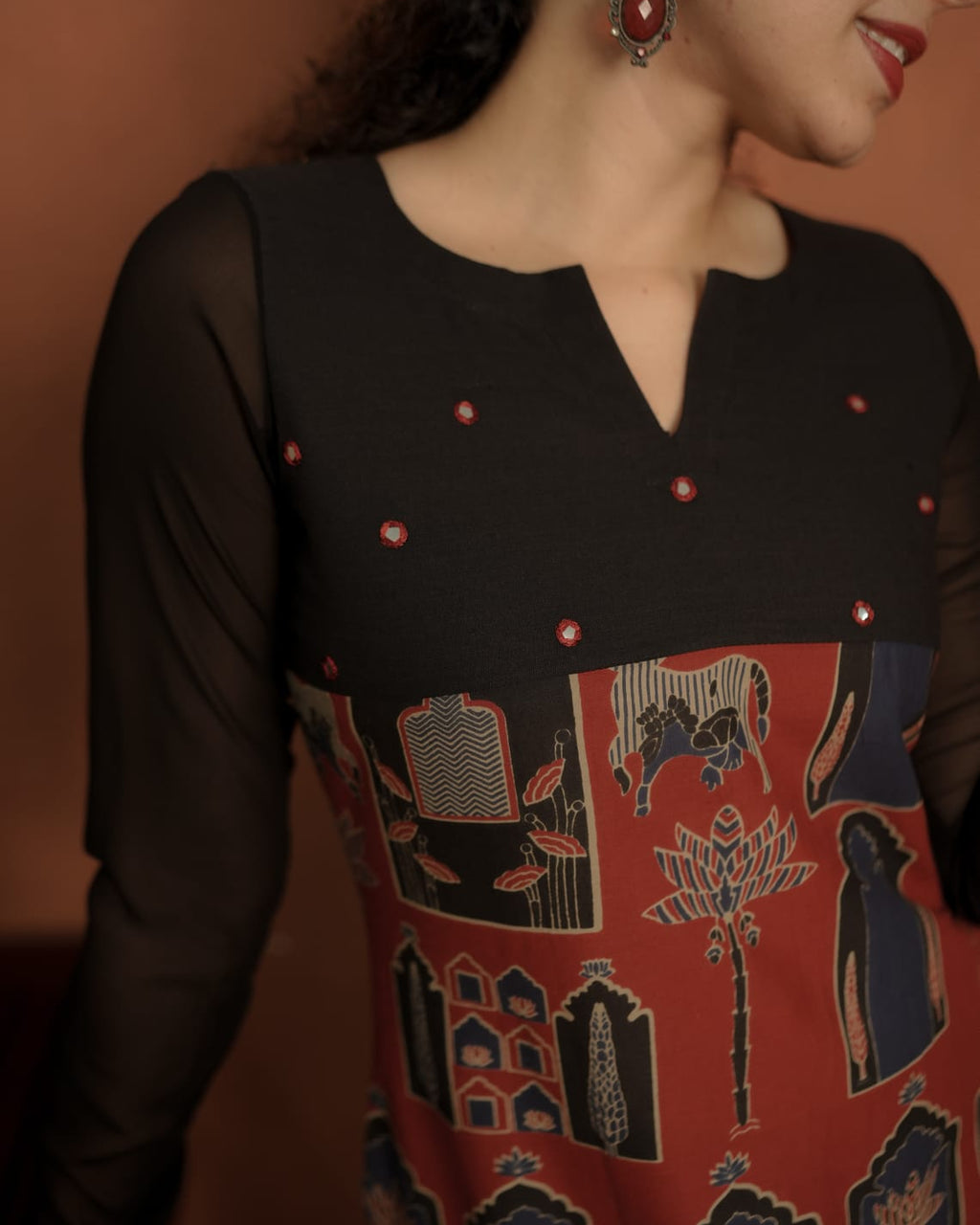 Color:- Print in Red, Black patch & Black Georgette Sleeves