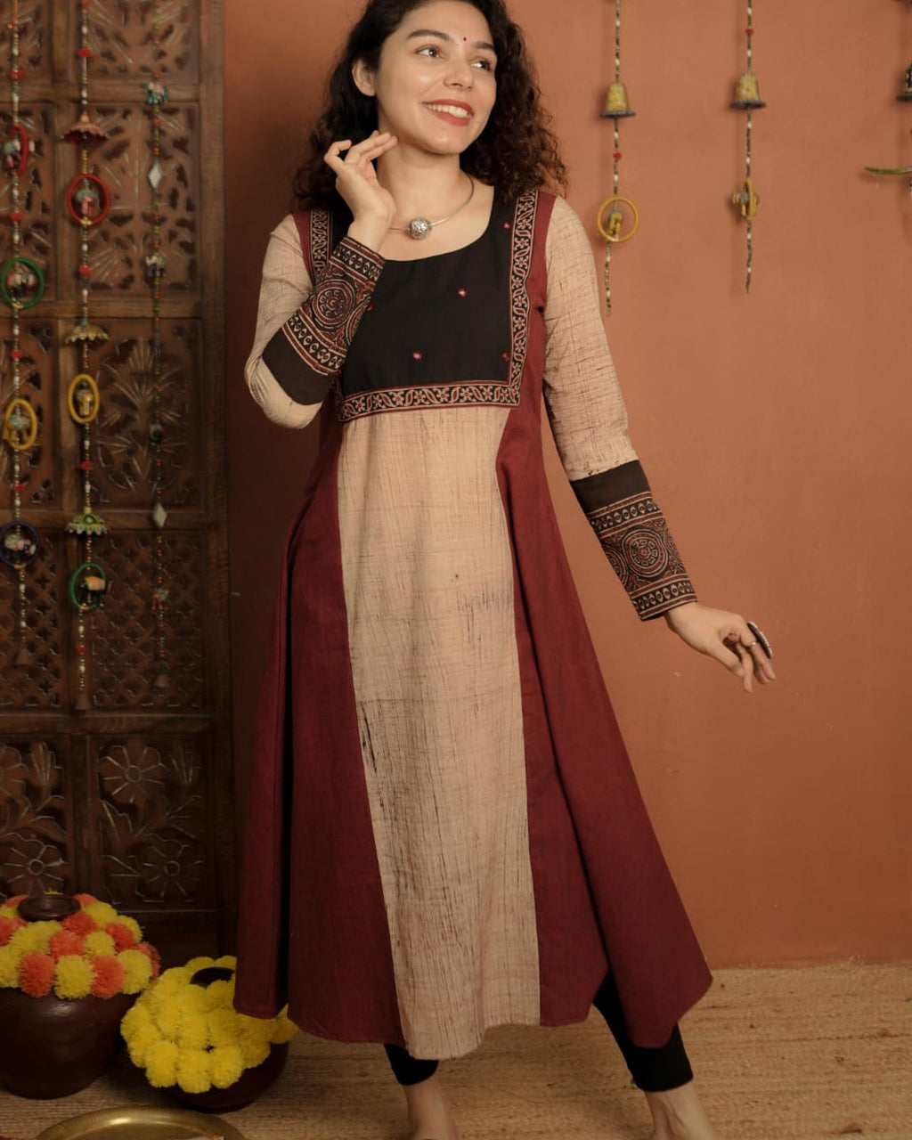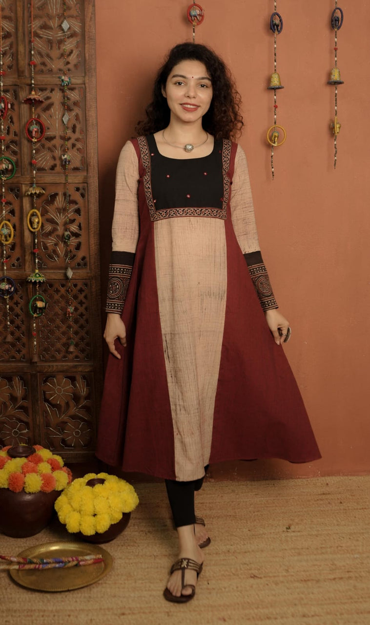 Handloom Cotton & Ajrakh Print designer A Line Top with Round Neck. Ajrakh Brush effect print Center panel and Designer Ajrakh Sleeves. Mirror work added and Ajrakh patch on border of yoke portion for detailing.